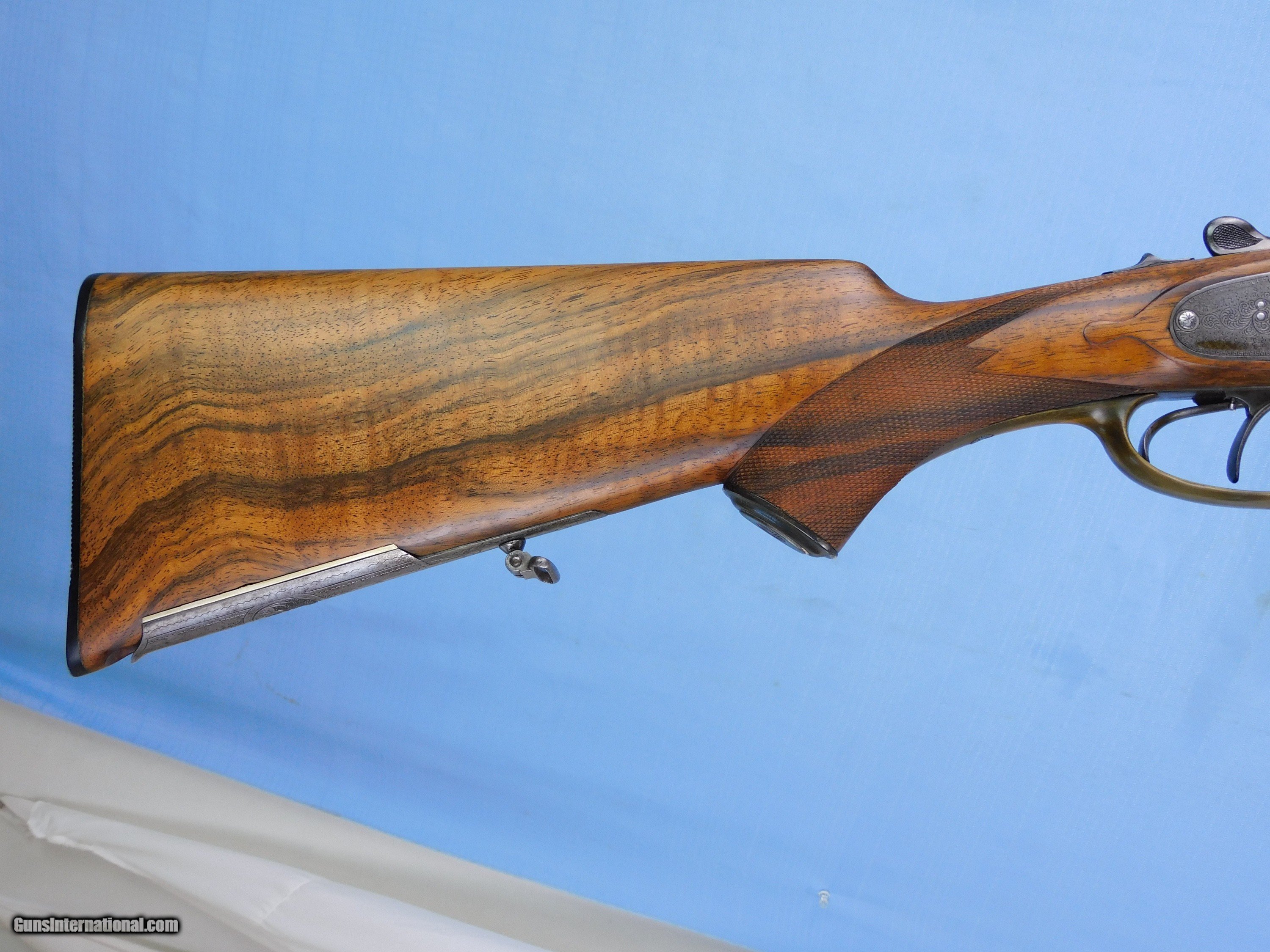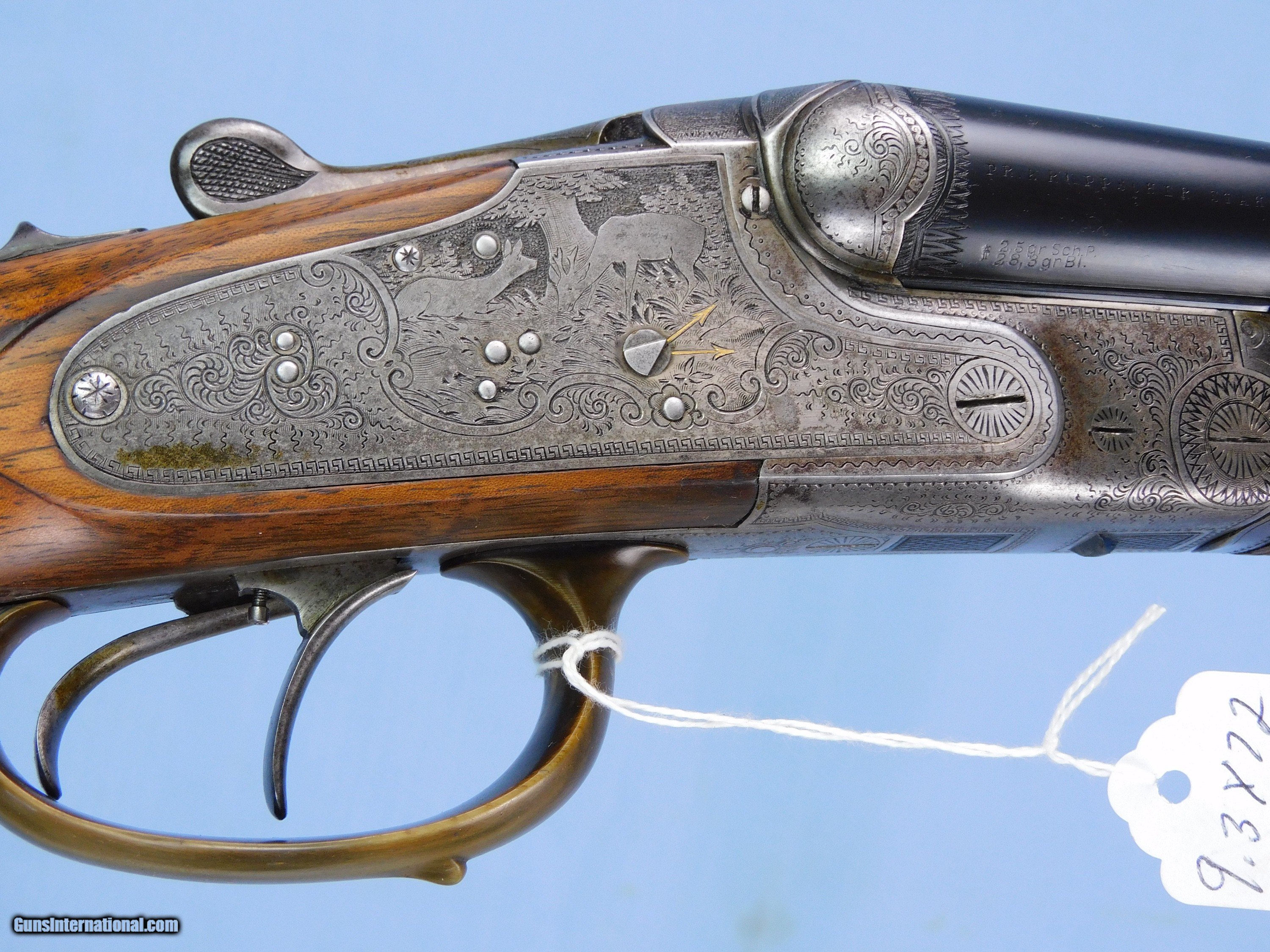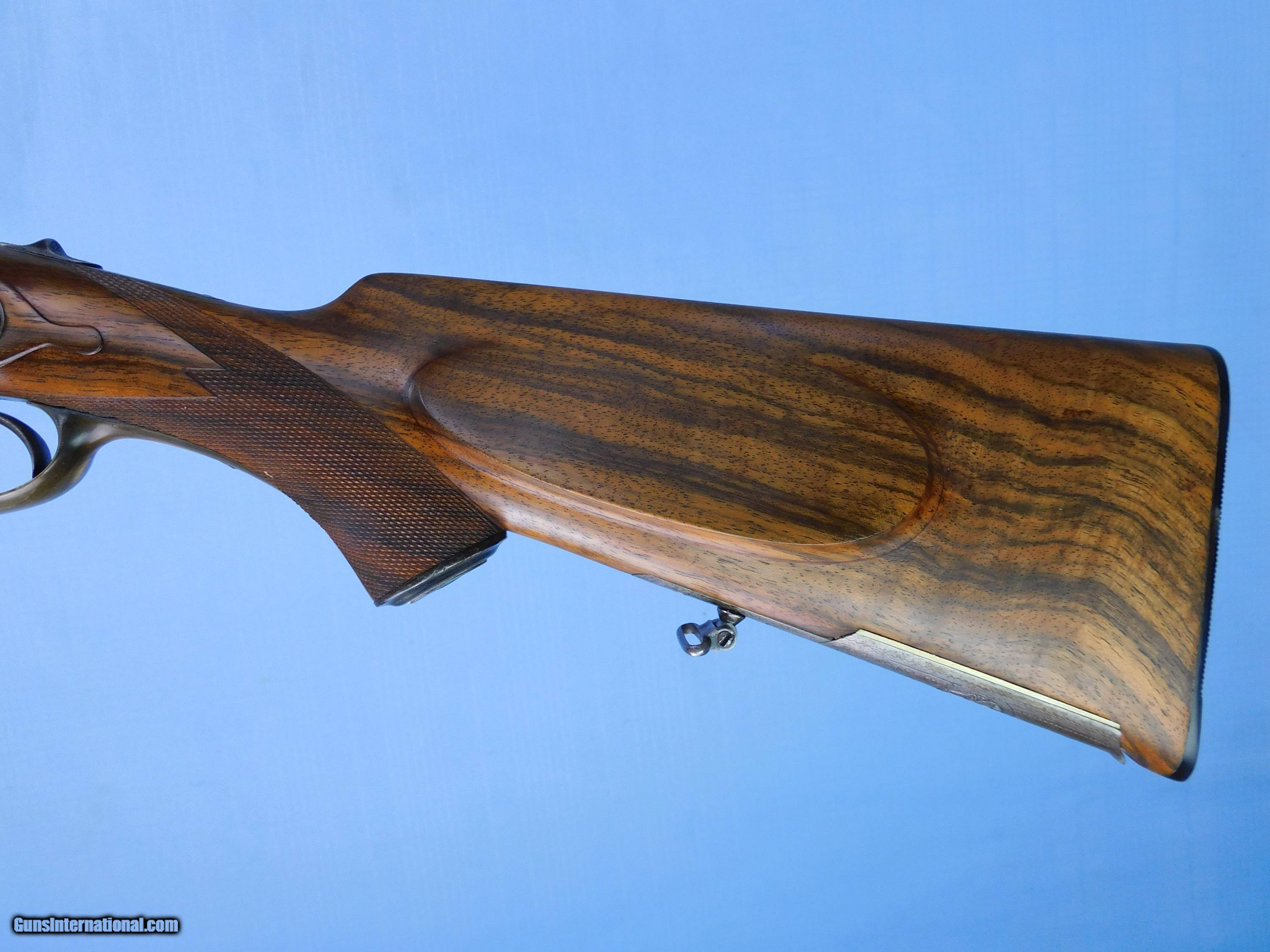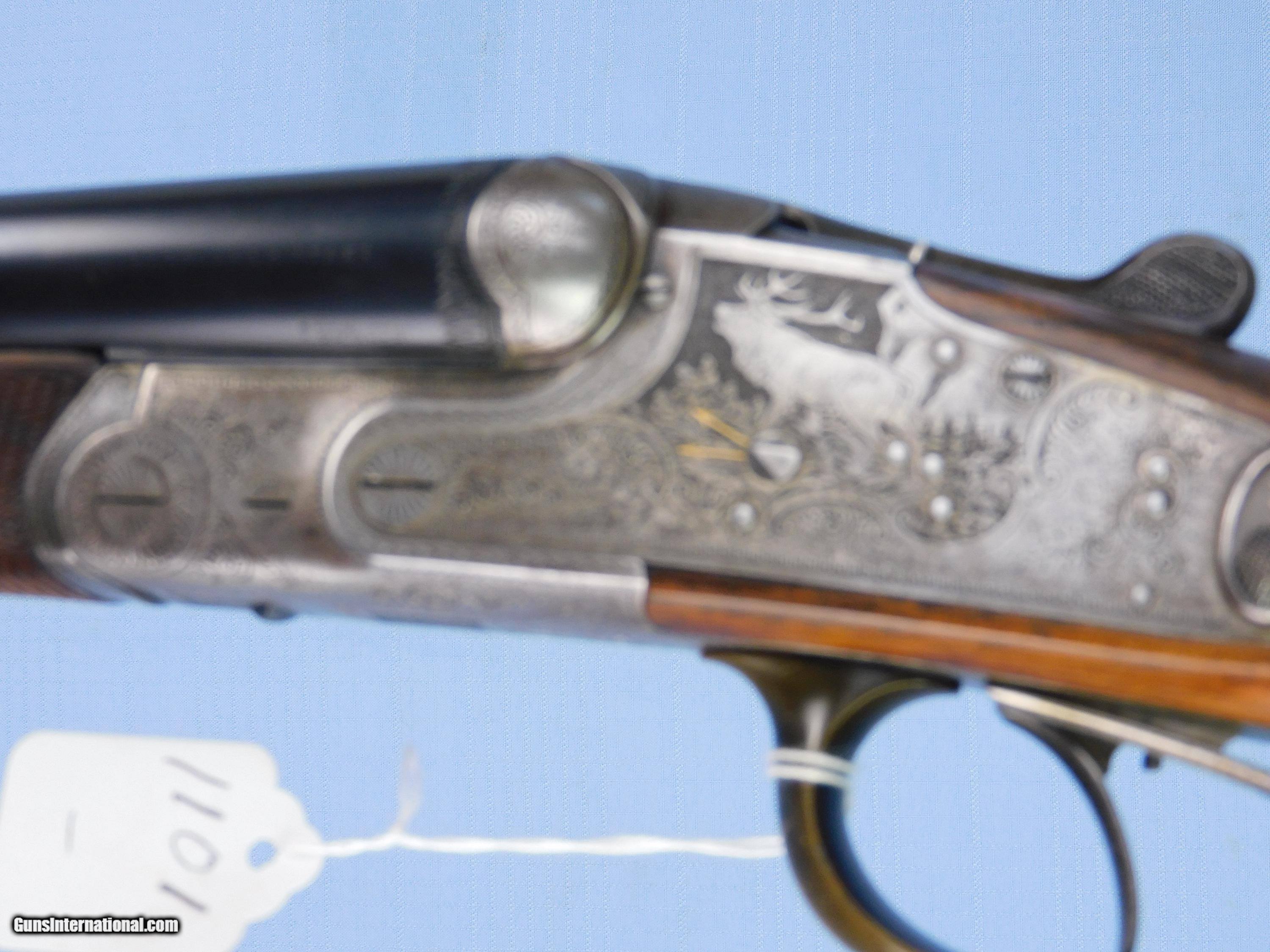 Description: #1101 O. BLANCKE FINE GERMAN DRILLING, 9.3 X 72-16 ga. 2 3/4”, SN 29XX, 27” bbls., fine game scene engraving on side lock action, elk in forest scene on left side & deer in forest scene on right side, gold inlayed arrows on both sides for cocking indicators, SST for rifle bbl., grouse engraved on trap door in bottom of stock, holds 4 cartridges, horn buttplate PG cap & trigger guard, Greener style safety, beautiful checkered circassion wood, checkered forend, sling swivels, exc. bores & wood, 100% bbl. blue, auto flip up rear sight. $3750 FFL required SOLD Curio/Relic: Yes Rifle Caliber: 9.3x72mmR Shotgun Gauge: 16 Gauge |