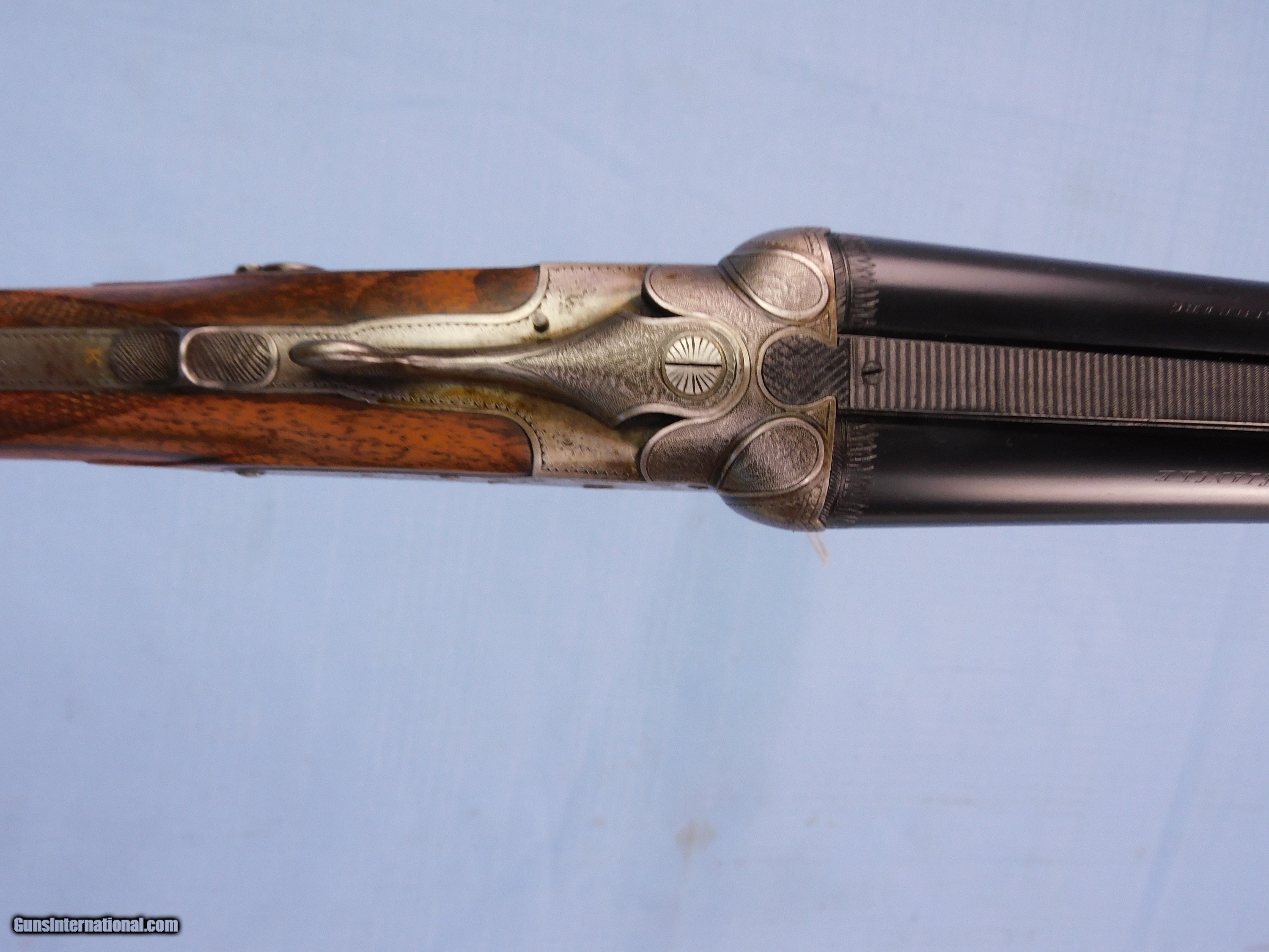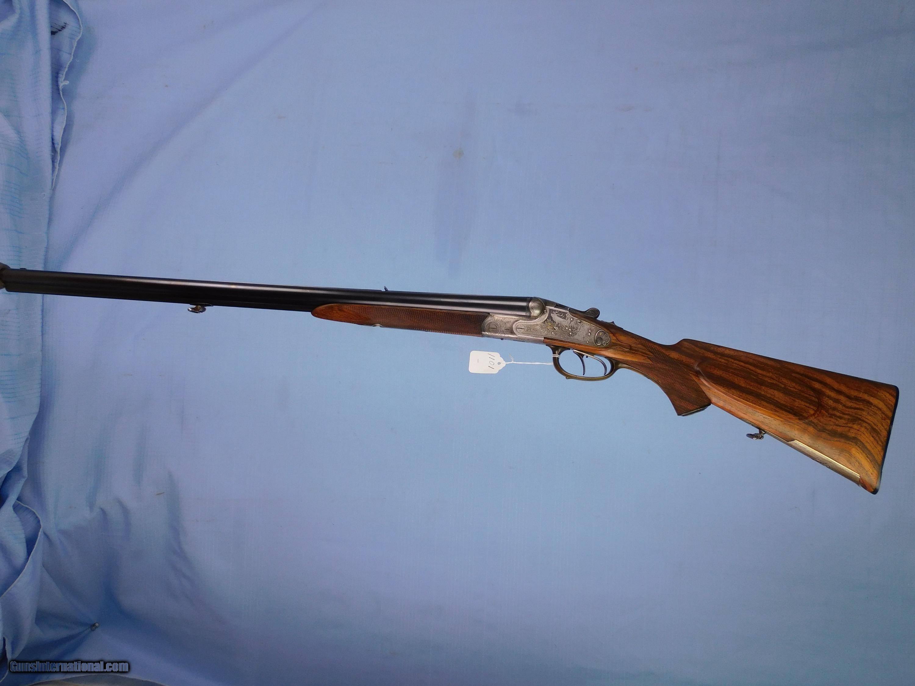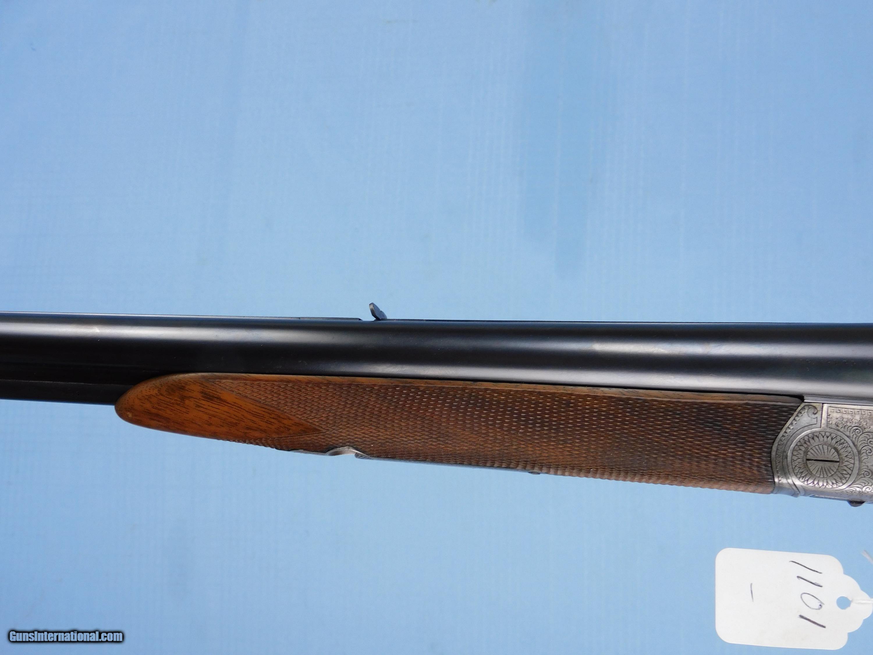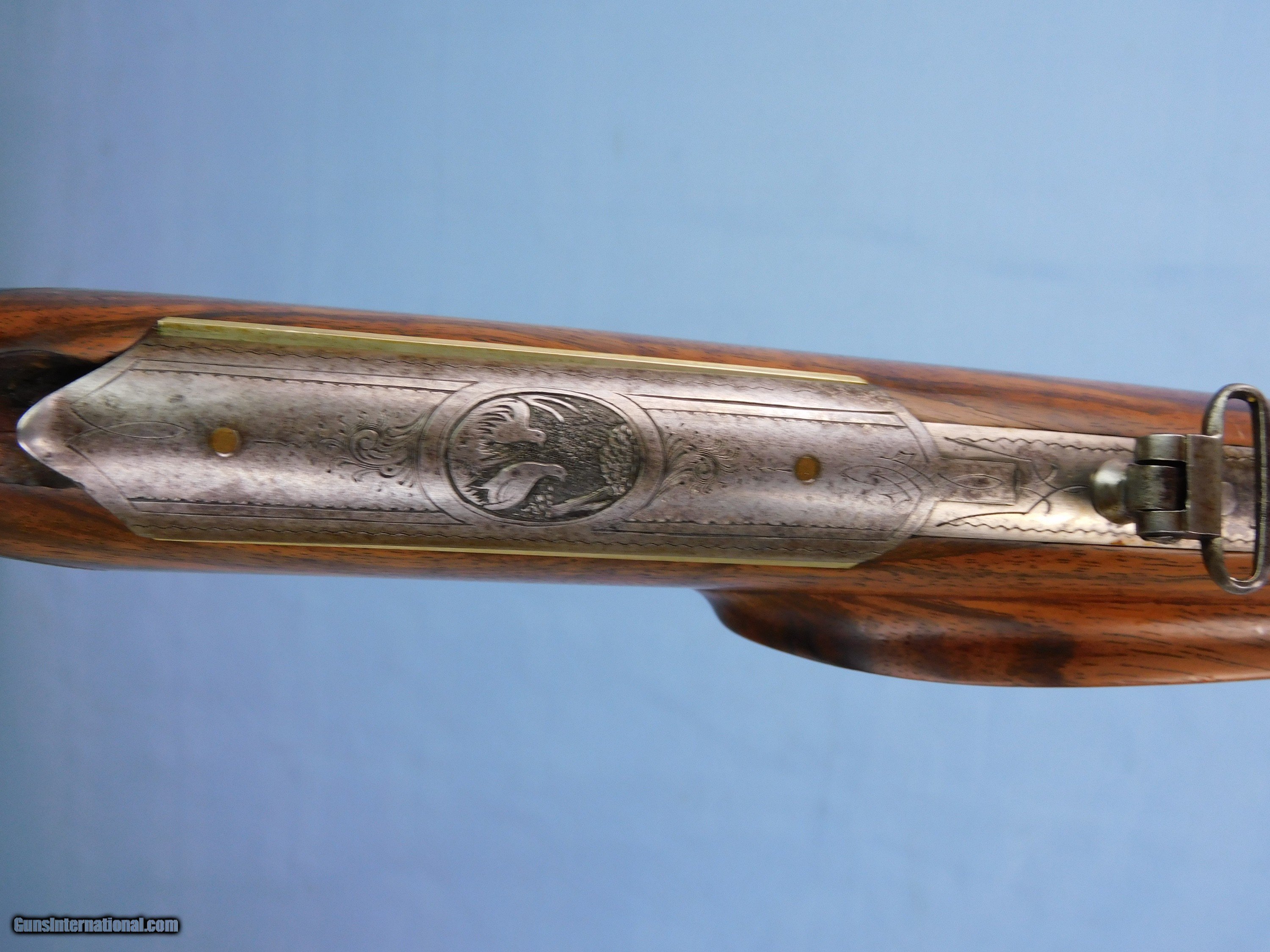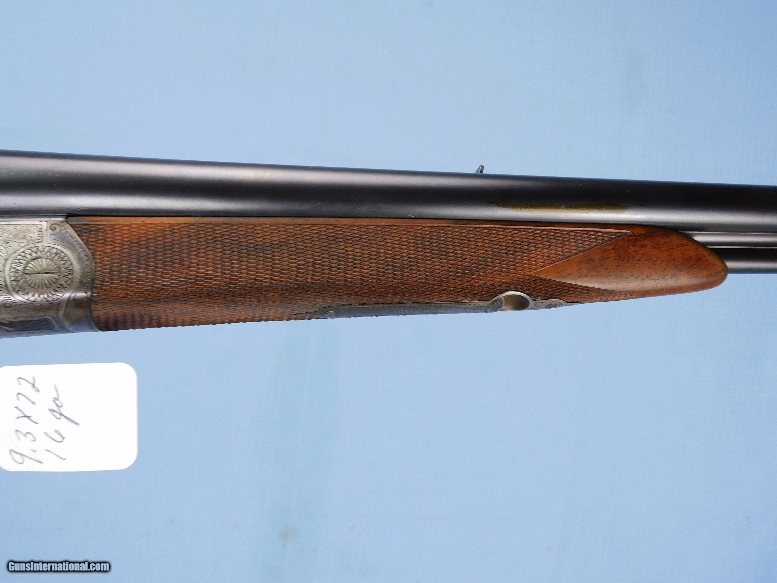 Description: #1101 O. BLANCKE FINE GERMAN DRILLING, 9.3 X 72-16 ga. 2 3/4”, SN 29XX, 27” bbls., fine game scene engraving on side lock action, elk in forest scene on left side & deer in forest scene on right side, gold inlayed arrows on both sides for cocking indicators, SST for rifle bbl., grouse engraved on trap door in bottom of stock, holds 4 cartridges, horn buttplate PG cap & trigger guard, Greener style safety, beautiful checkered circassion wood, checkered forend, sling swivels, exc. bores & wood, 100% bbl. blue, auto flip up rear sight. $3750 FFL required SOLD Curio/Relic: Yes Rifle Caliber: 9.3x72mmR Shotgun Gauge: 16 Gauge |