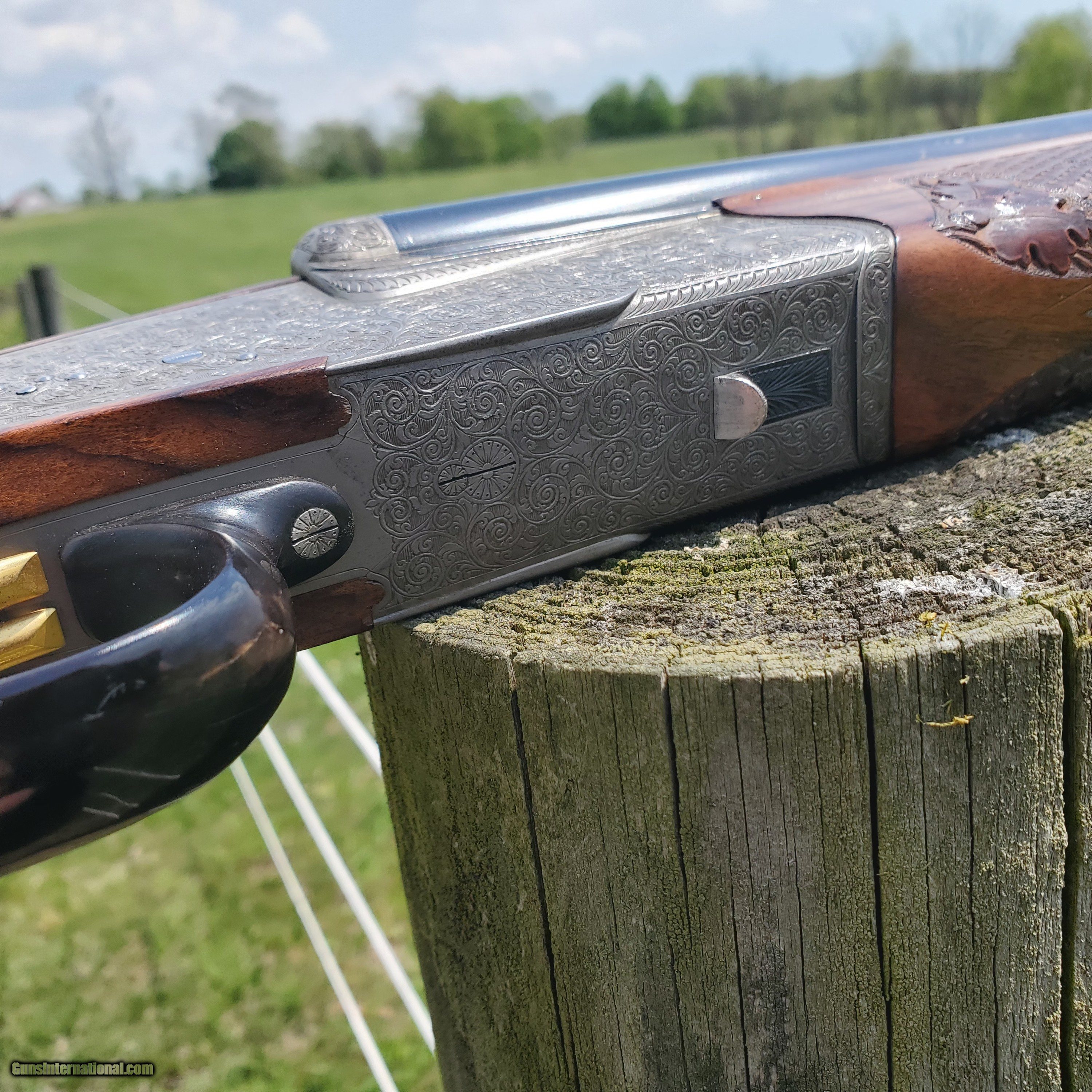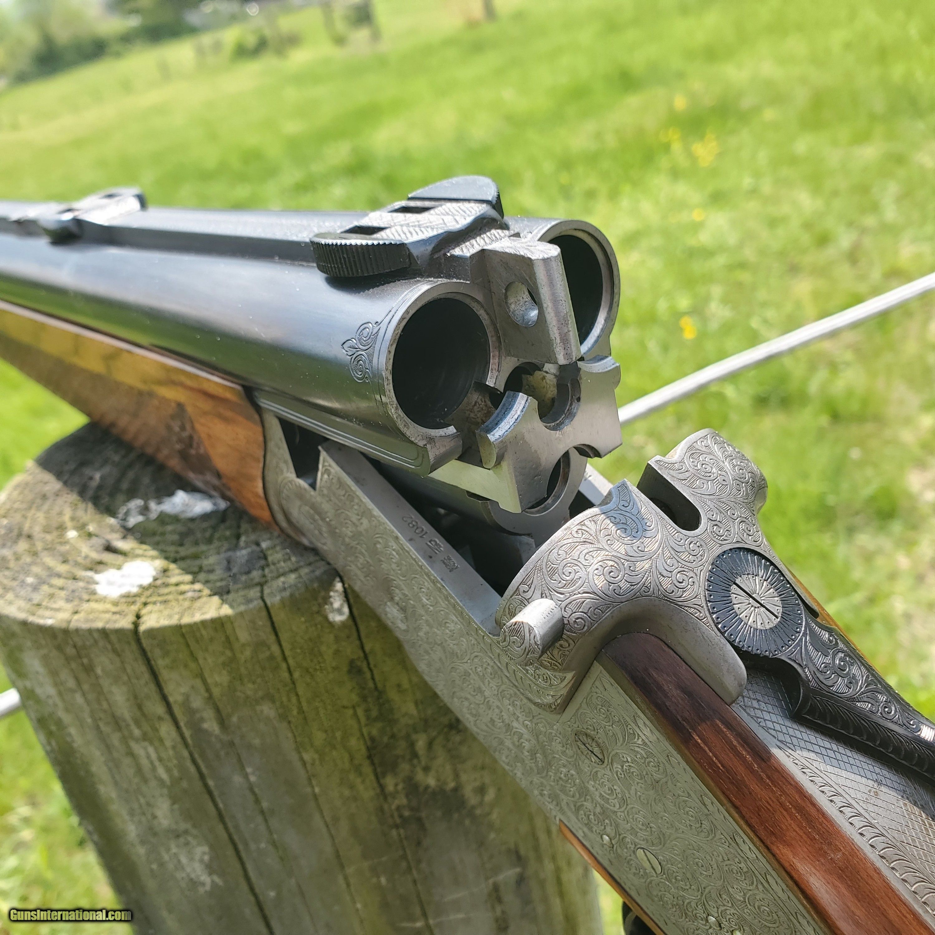 Description: SUPERB HIGHLY ORNATE BOROVNIK FERLACH SIDELOCK 4 BARREL VIERLING DRILLING (16 GA.,16 GA., 22 HORNET, 7X57R) CIRCA 1980’S. 24” barrels. Borovnik proofed on underside of barrels. Finest floral scroll engraved side locks and frame. Cocking indicators, pop up rifle sight, claw mount bases, double gold set triggers, selective safety and barrel selector. Sling swivels. Exceptional highest quality deluxe walnut stock and forend with fabulous oak leaf and fish scale carved pistol grip and forend. 14 ½” pull. Horn trigger guard, pistol grip cap and butt plate. 99% plus original blue on barrels and French coin polish on frame and side locks. Wood with nearly all the finish and only showing very little use with some minor carry nicks. Mint bores and perfect working order. Top of the line rarest of all drillings and by Austria’s finest maker of the modern era. SOLD |