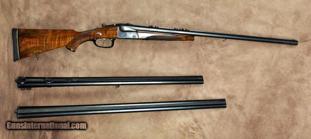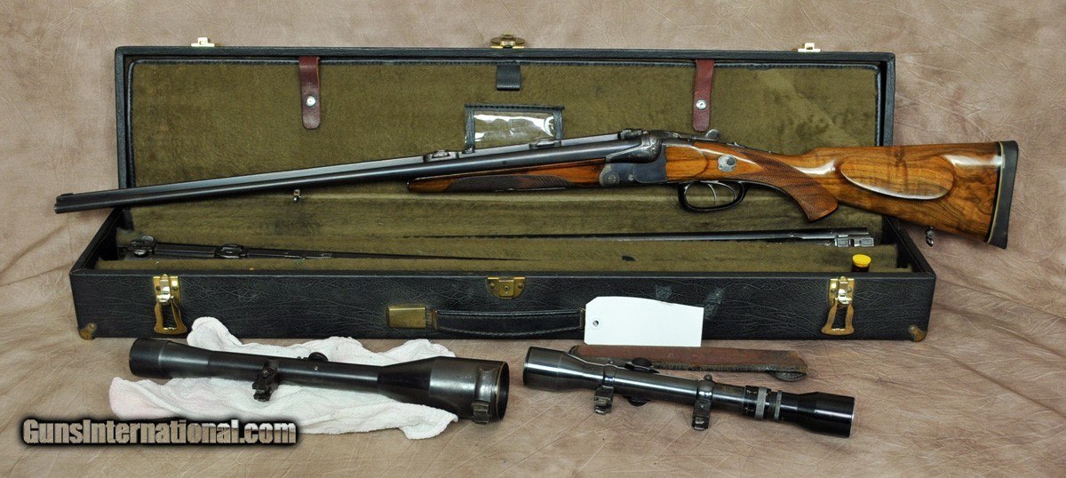 Description: Pre owned in good condition Otto bach Drilling three barrel set. Barrel #1 16 ga Barrel sxs only. Barrel #2 16 gauge and 7x57 , barrel. #3 16 x 16 and under barrel caliber Unkown. Set includes 2 scopes, Certar made in Berlin, Pecar made in Berlin. Includes three barrel case. Contact our Michigan location at 248-960-7262 for additional information. Refer to (17068) SOLD |
