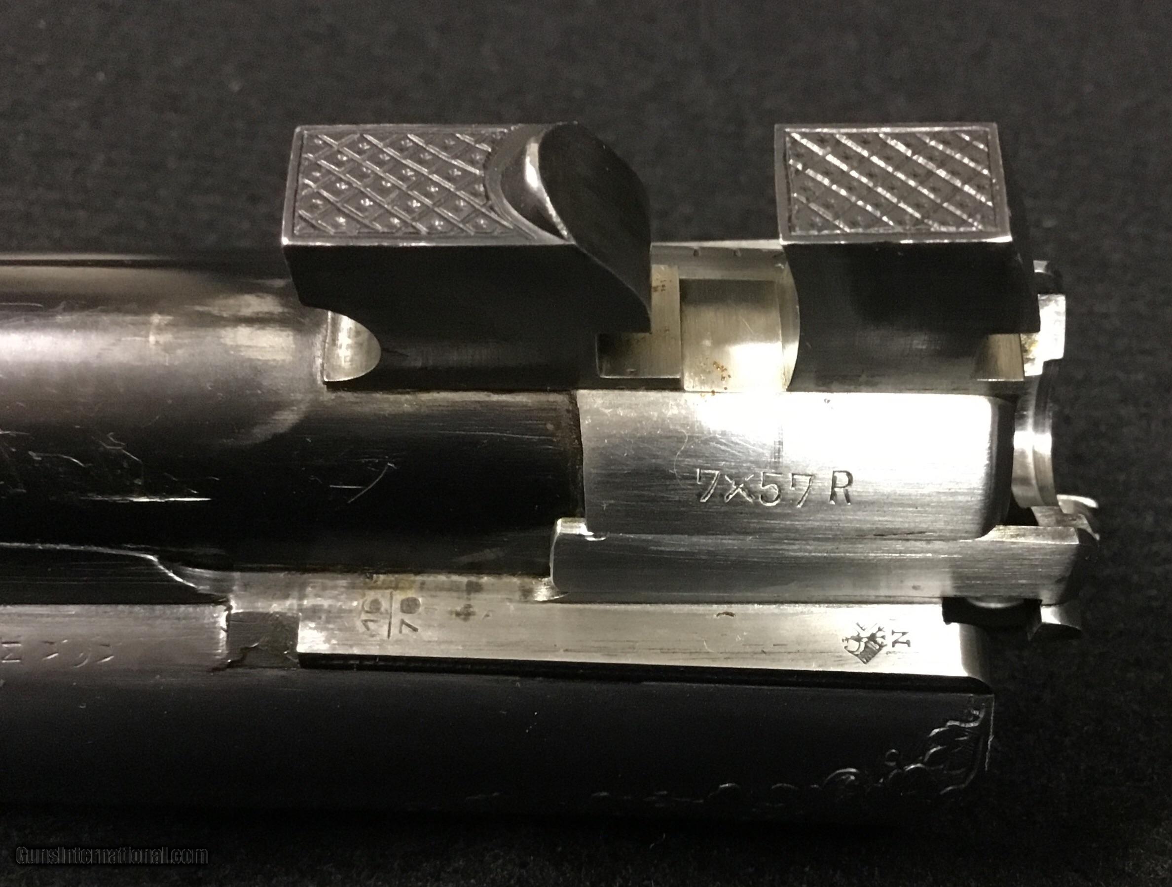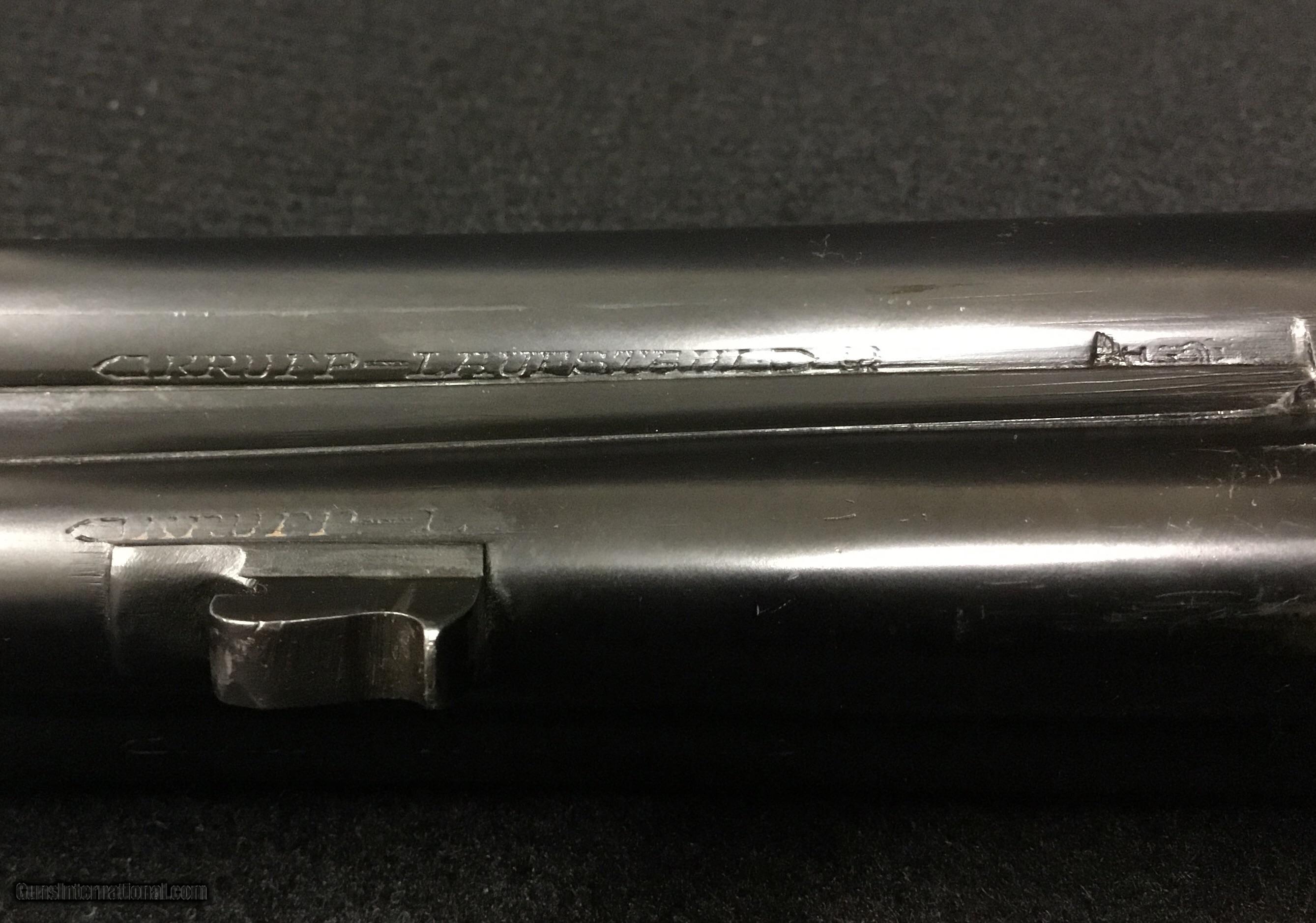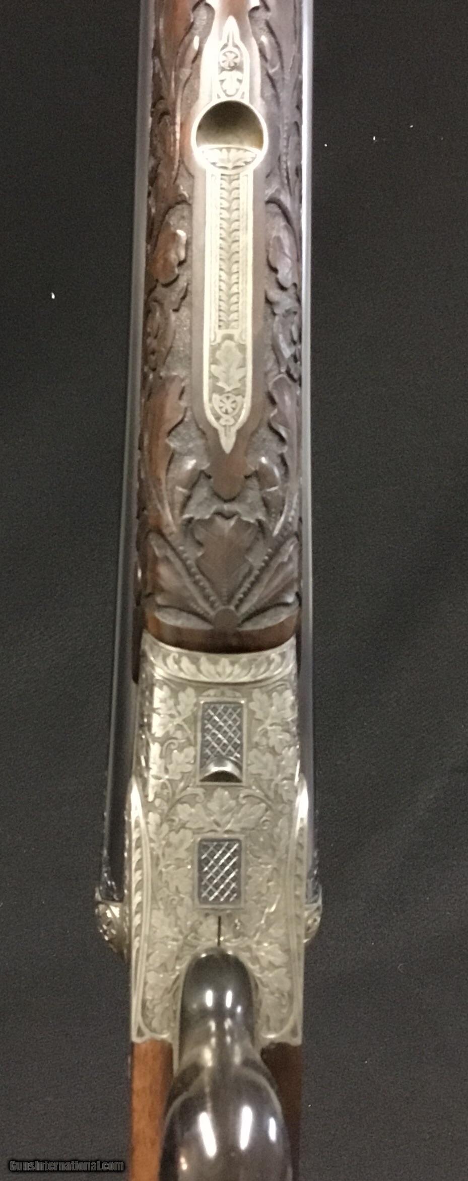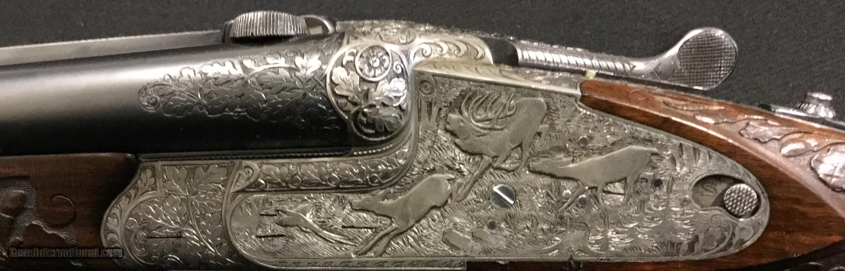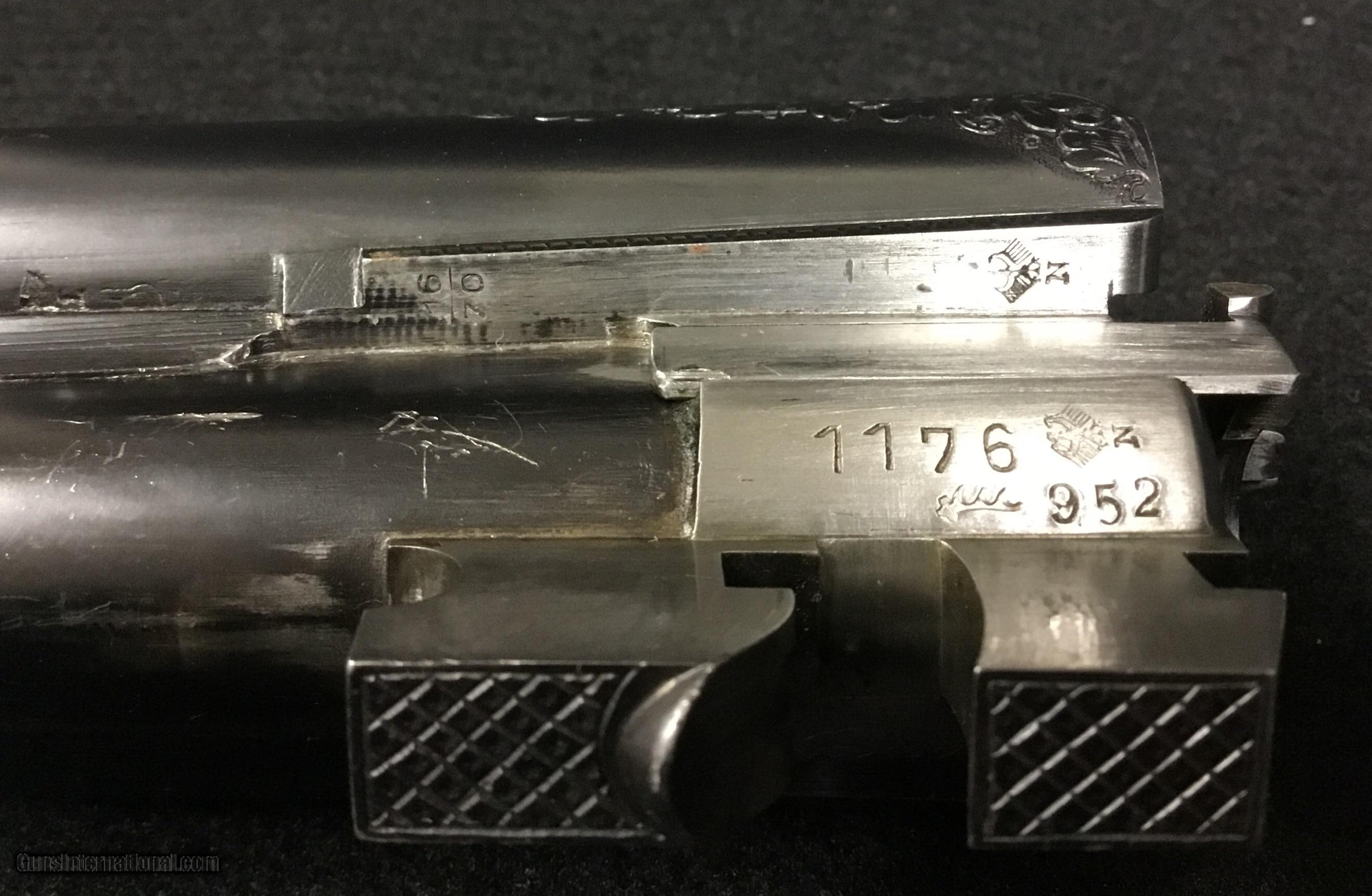 Description: Presentation grade H&H Zehner of Frankfurt Drilling with fantastic Germanic engraving. H&H Zehner was a respected post-war gunmaker based in Frankfurt Germany and specialized in custom and often highly ornamented sporting guns. A tremendously talented and respected maker in their day. This particulaer gun was made in 1952 (date stamp 352). SN#:1176. Gauge/Cal: 16 ga x 16ga x 7x57R w/ 70mm/2 3/4" shotgun chambers. Double underlug, third crossbolt, sideclip, and nitro proofed 24" Krupp-Laufstahl steel barrels. Extractors. Barrels have full length herringbone pattern engraved rib with pop-up rifle sight and provision for claw mount scope. Sling swivel soldered to bottom barrel. Highly ornamented full sidelock double trigger action. Front set-trigger for rifle. Horn triggerguard. Side-safety and top push-button secondary safety sliding shotgun/rifle selector that actuates the rear sight to the standing position when moved into the forward position. Single pin cocking indicator for rifle barrel. Extraordinary and extensive deep relief Germanic engraving throughout. Left lockplate features a trophy stag, two cow elk, and a flushing pheasant, all in a deep relief forest scene. Right lockplate features three roe deer (a buck and two doe) and a flushing grouse, again all set in a deep relief engraved forest scene. Balance of metal surfaces are engraved with deep relief oak leaf engraving (as are the matching barrel chevrons). Gorgeous dark figured European walnut stock with heavily carved oak leaf pattern pistol grip and forend. Small shadowline cheekpiece. 14 5/8" LOP over crescent checkered buffalo horn buttplate. Horn pistol grip cap. Sling swivel on bottom centerline of stock. Condition: Gun is in remarkably nice overall original condition. Barrels retain all of their original deep rich rust blue. Bores are clean and brite with strong rifling. Wood retains all of its original oil finish with only scant light handling marks. Horn parts are all perfect condition. Rifle selector and front pop-up sight work flawlessly. Side safety fully functional albeit slighty stiff to put to "s" postion. Works easily going to fire position. Barrels on face and lock-up tight. Gentlemen, this is one of the nicest German drillings we have seen. Abosultely comparable to the finest Krieghoff, Sauer, Merkel, or Daly drillings. Workmanship is flawless and tastefully executed. Excellent chamberings make it a useful gun for today's hunt. An exceptional collectible gun for sure. FFL Required - C&R okay Buyer to pay S/H/I SOLD Curio/Relic: Yes Manufacturer: Zehner Model: Drilling Caliber Info: 7x57R Condition: EXC - USED Bore Condition: Exc Triggers: DOUBLE Gauge Info: 16ga LOP: 14 5/8 Proof:Nitro: Yes |