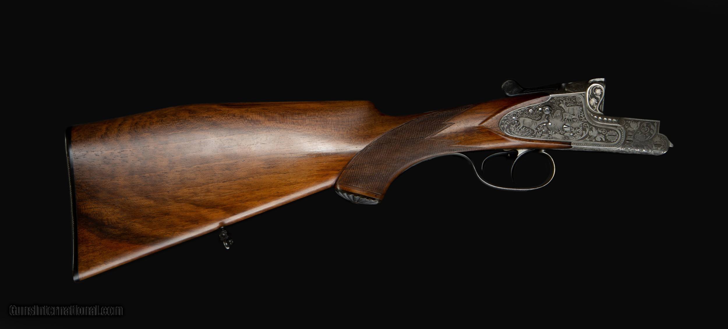 Description: Sempert & Krieghoff sidelock model Numera O/U Combo. 16 Ga. F & 8 x 57 JR, 14 1/4 pull to the original buttplate. 26 3/4 Krupp Steel Barrels with Hensolo & Wetzelar hand detachable claw mounted 4x scope. DOH 3 1/4, DOC 1 3/4, 6 lbs 12 ozs, scope 14 oz. Made in 11-1925, 90% condition. Fine sidelock combo. SOLD Curio/Relic: Yes |