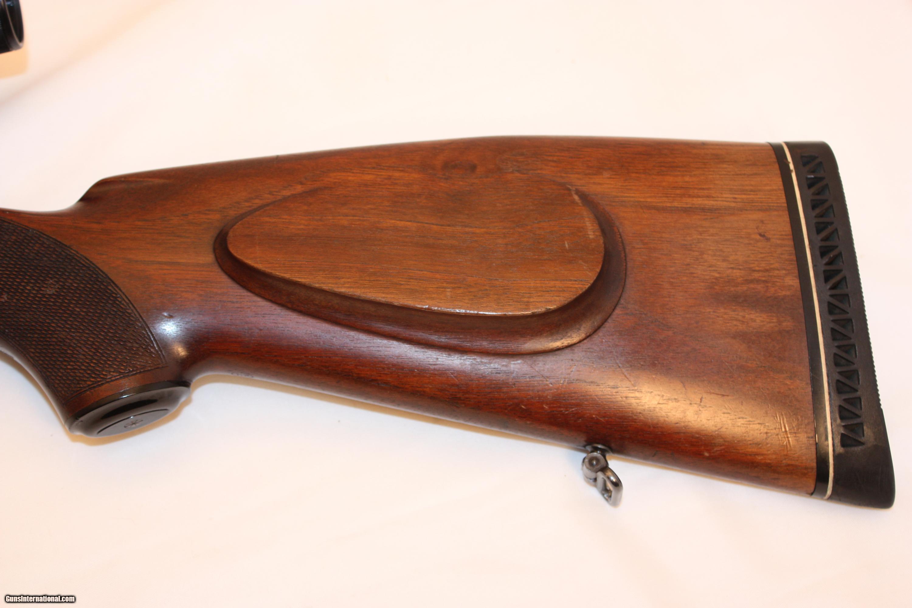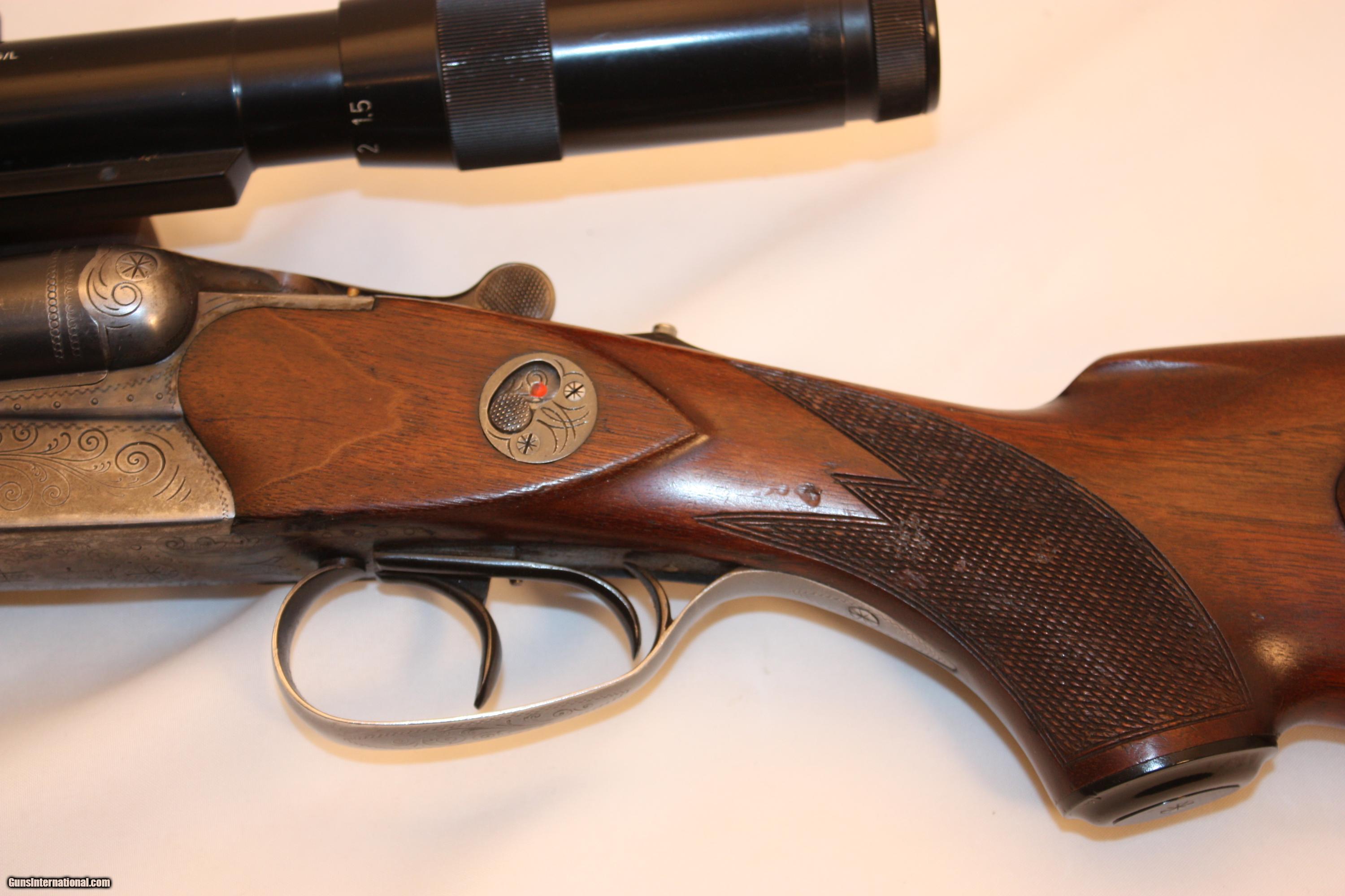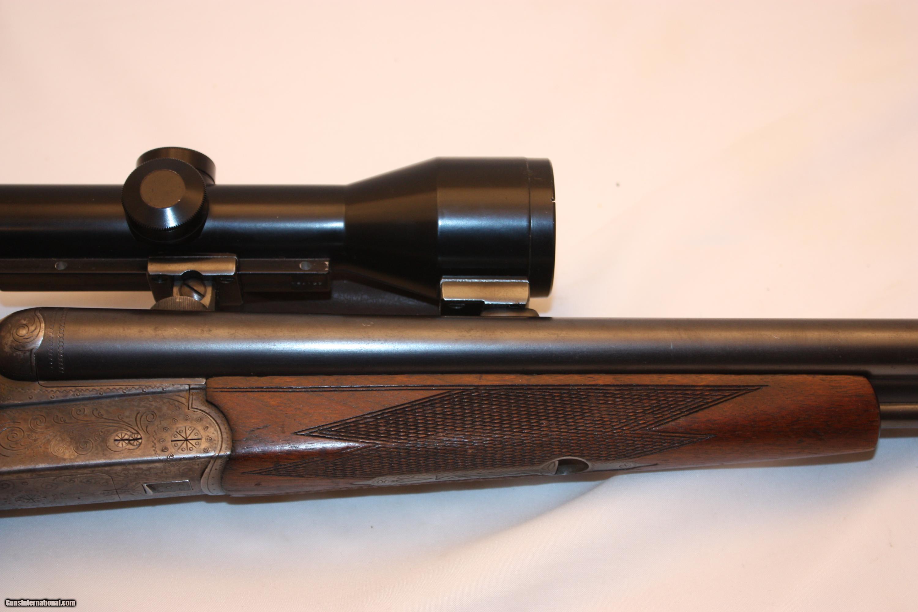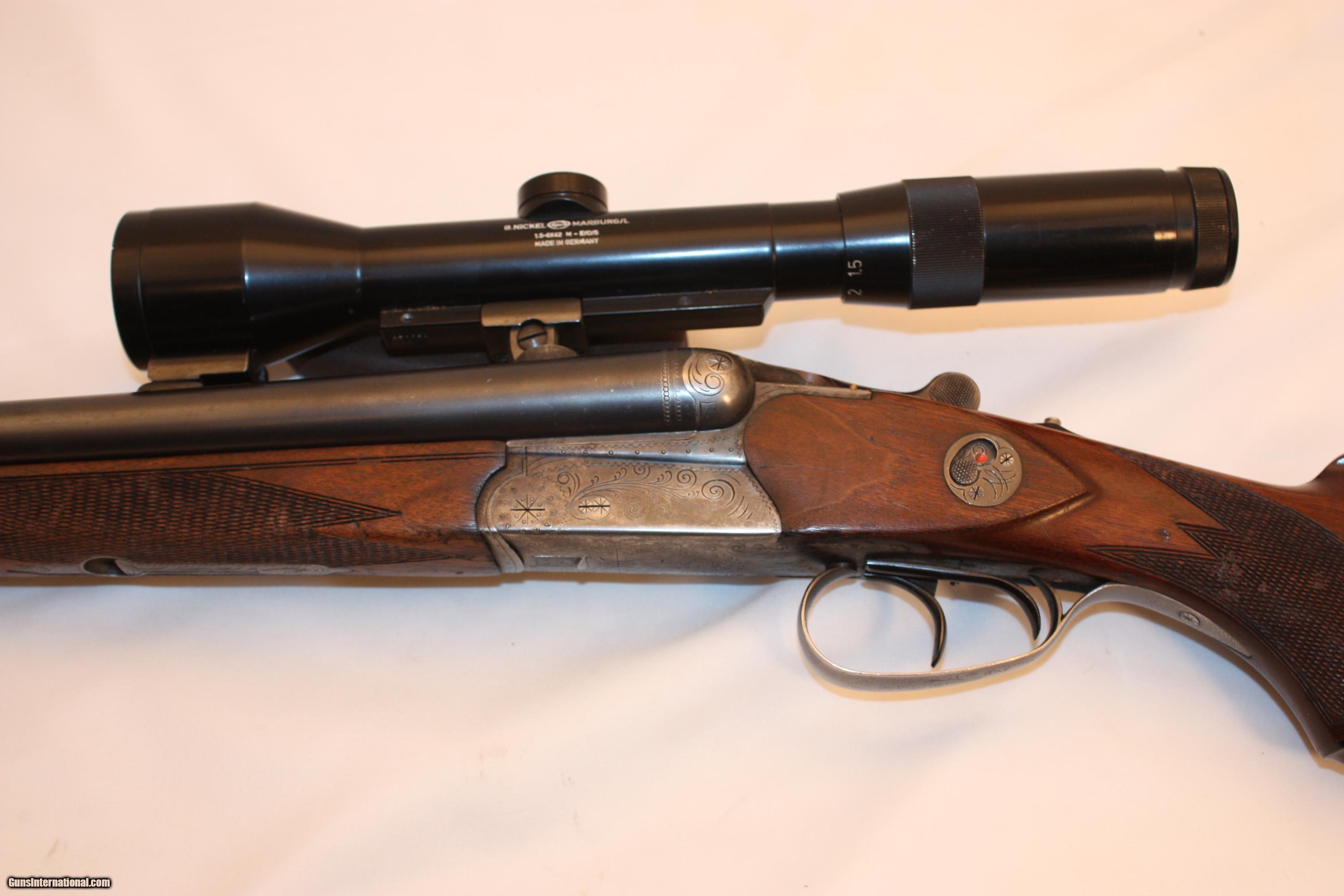 Description: Simson Model 30 Drilling, 24.75" Barrels, 12ga-12ga-7x65R, Nickel 1.5-6 Scope with German #4 Reticle, 13.5" LOP, 60% condition, no stock cracks or barrel dents, bores are good. SOLD |