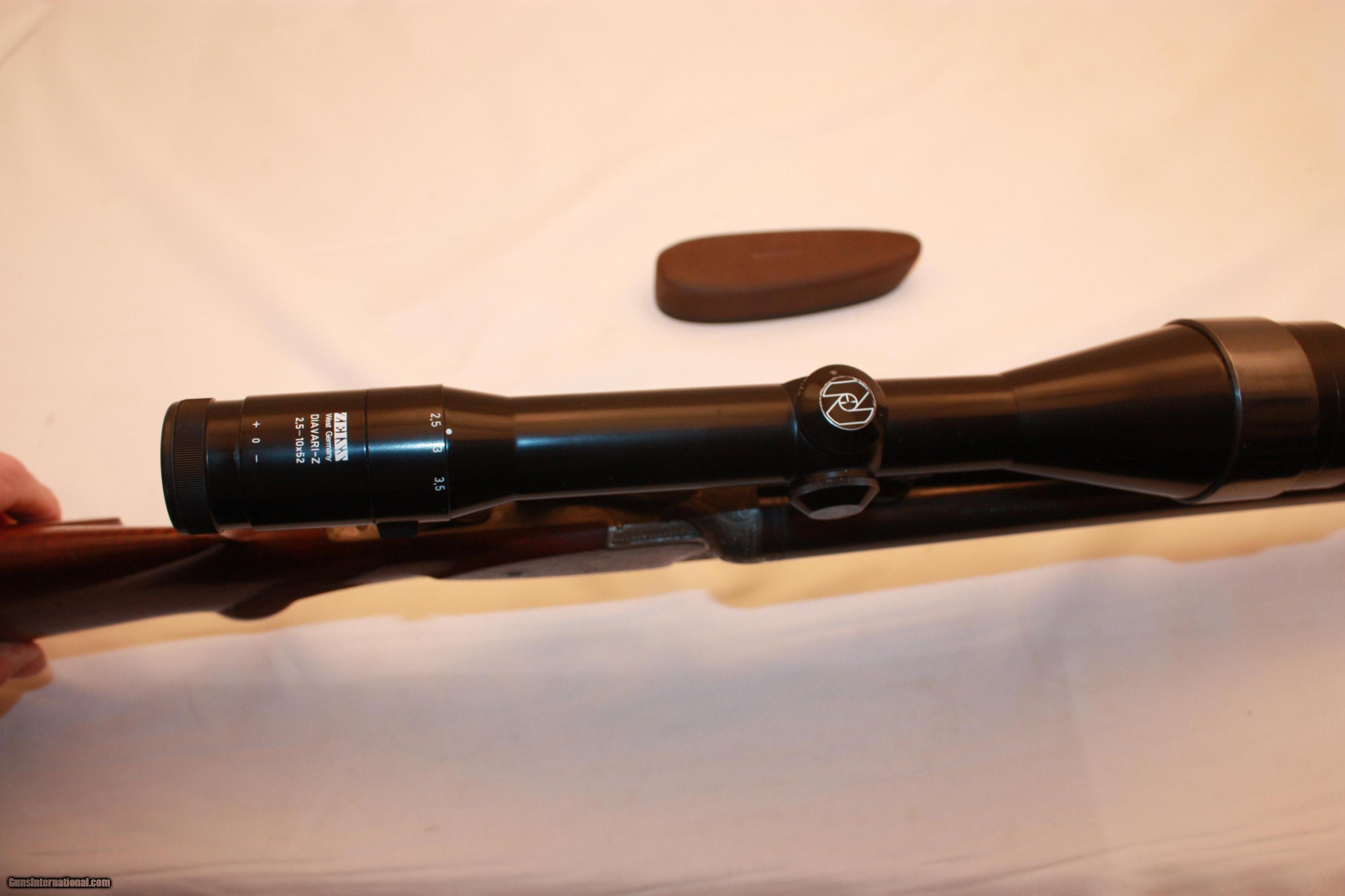 Description: Simson Model 30 Drilling, 12ga - 12ga - 9.3x74R, 24.75" Barrels, F&M, 22 Magnum Insert in the Right Shotgun Barrel, Game Scene Engraved, Original Butt Plate, Zeiss 2.5-10x52 Scope with German #1 Reticle on Claw Mounts, Good Bores, Action and Scope Mounts are Tight. This is a very good big bore drilling. 85% overall SOLD |