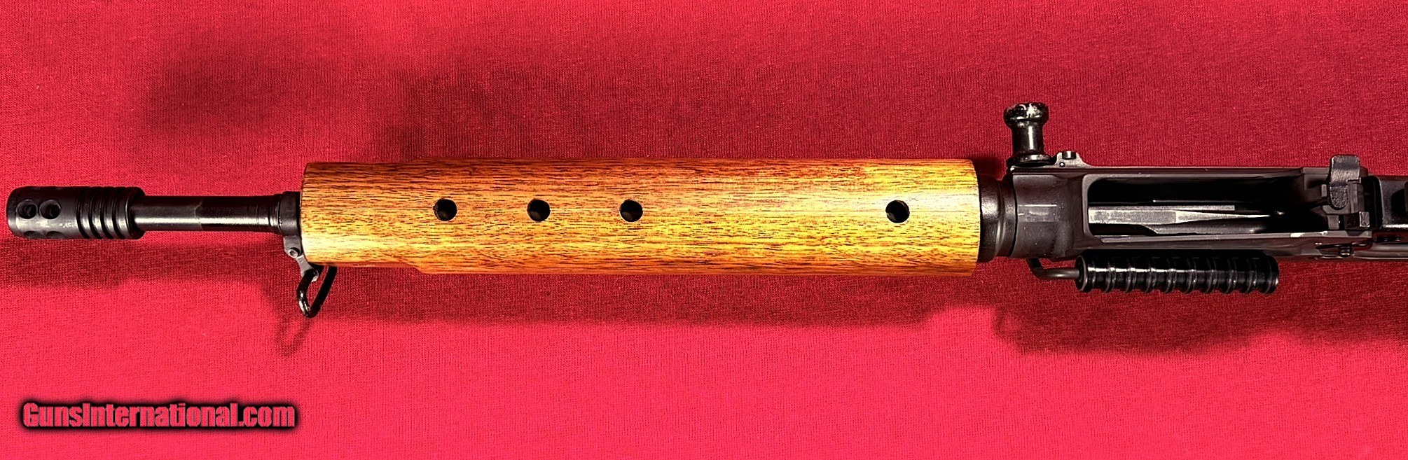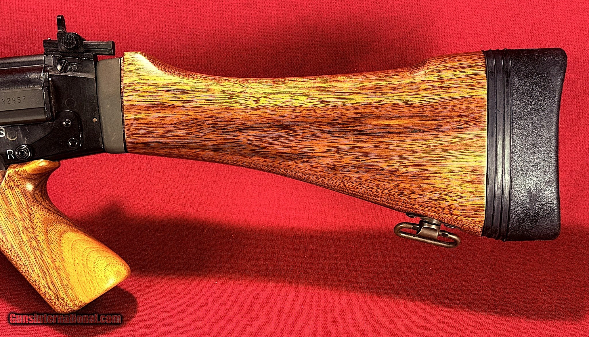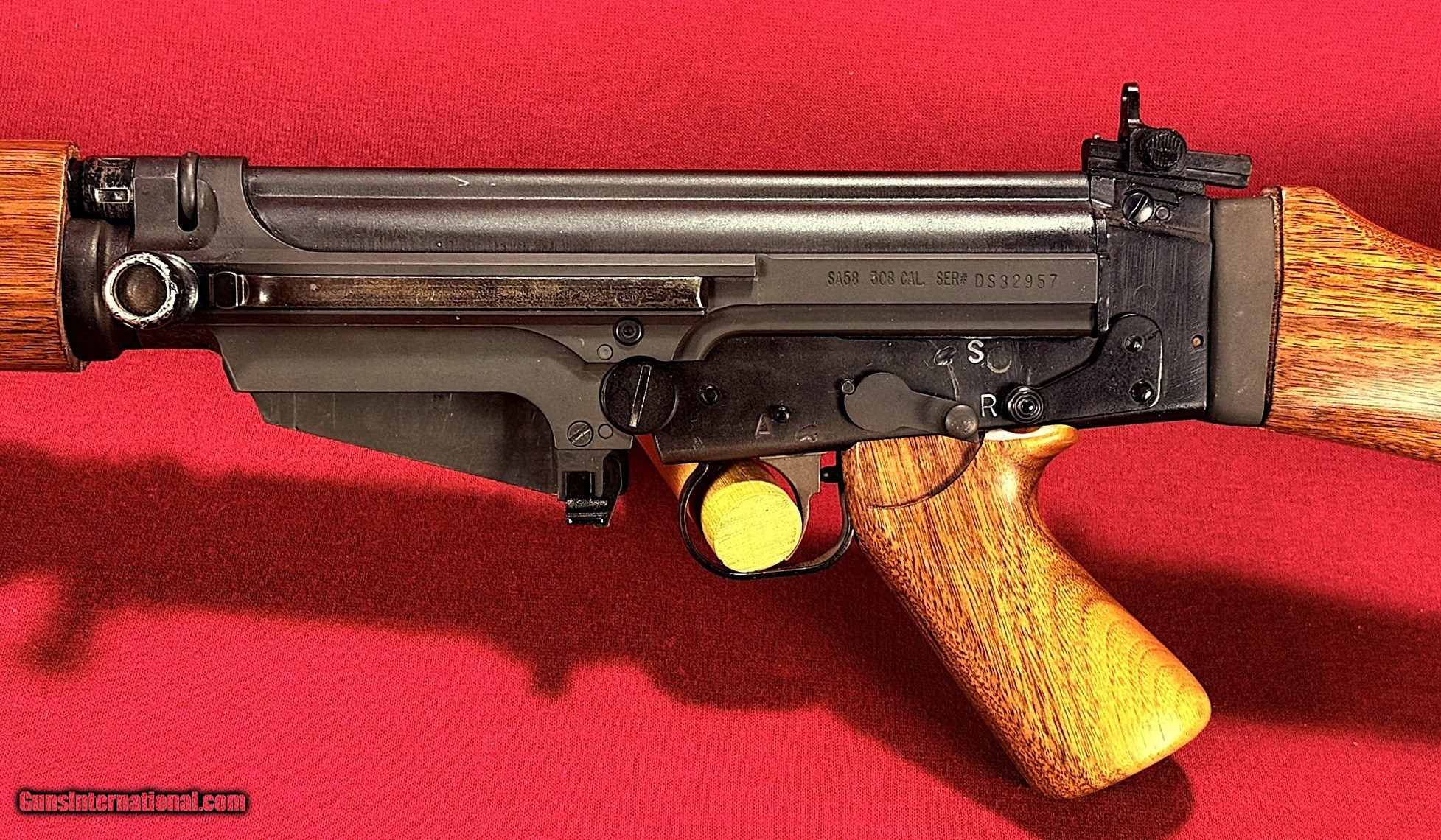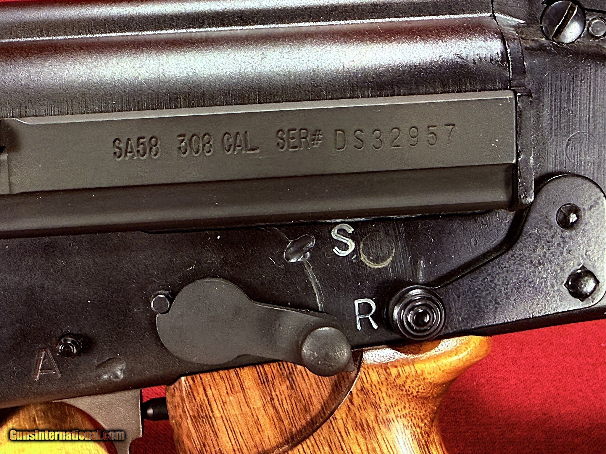 BEAUTIFUL Light Walnut stocked SA 58 by D.S.A. in .308 Caliber, as new, Test fired only. This very nice rifle was previously owned by my son in law. He is a very talented woodworker who also loves guns and shooting. The light walnut stocks are beautiful and show off his skills. He has fired the rifle to ensure proper functioning, but it appears in as new condition. The exception is the charging handle that was apparently replaced for some reason. This is a very nice rifle that is unique and special in appearance.