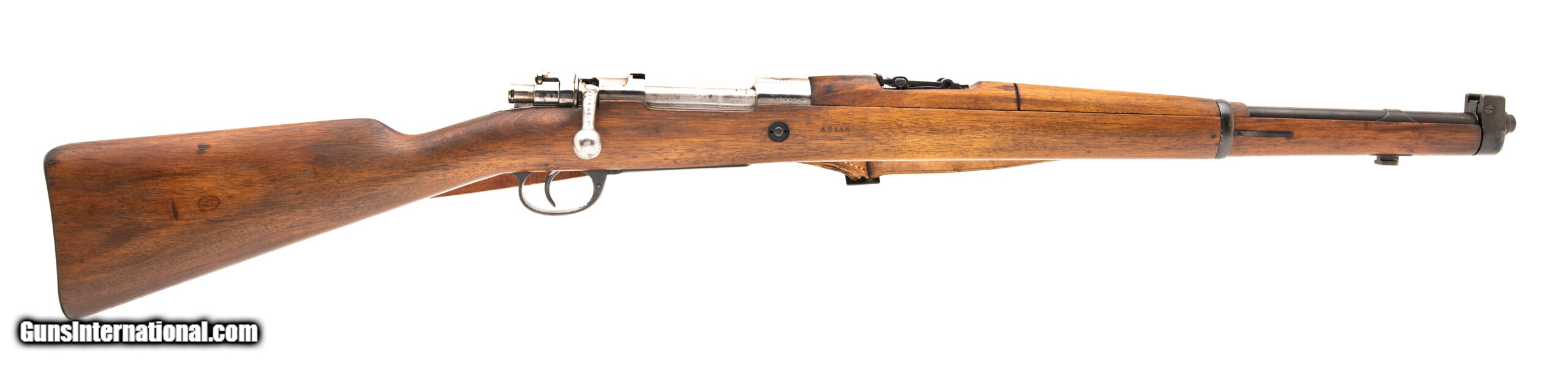 Description: "SN: A8445. Bolt-action Argentine military rifle made by DWM. 22.5"" barrel chambered for 7.65x53mm Argentine. Great condition with >95% of original bluing and a few small handling marks in the wood. Bore is excellent. All parts matching including stock. Cavalry carbine model with full-length stock, no hold-open and bent bolt handle. CAI import mark on right side of barrel. SOLD |