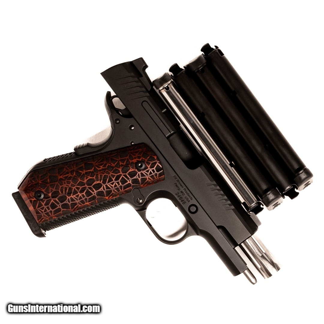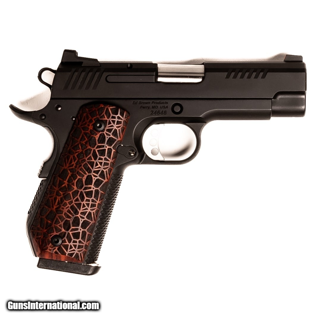 Description: Guns Listing ID: 834382 Introducing the KC9, the first model in the new Evolution series from Ed Brown. The KC9 pays homage to the Kobra Carry, which took the industry by storm nearly 20 years ago, and has now become the iconic standard for a high end custom 1911, with its revolutionary Ed Brown Bobtail®, stainless steel base, and Snakeskin treatment. Optimized for the 9mm caliber, the KC9 inherits those same characteristics, yet is smaller, thinner, and lighter. The KC9 retains 100% 1911 controls and handling characteristics, and makes use of standard 1911 magazines, and standard 1911 grips with the Ed Brown Bobtail® cut, which are now a standard offering among major grip makers. Some parts were completely re-designed to take advantage of modern improvements such as the new external extractor, easy-to-change front sight, smaller \"Tactical Edge\" rear sight, bull barrel, and a flat wire recoil spring system. The re-engineered slide has been shortened to 4\", thinned substantially for weight reduction, and includes a unique 7-top custom cut, with special front and rear serrations. A recessed slide stop completes the package, making for the perfect custom 9mm 1911. 5-9 round magazines, the original soft case, and an oil bottle. Truglo front night sight installed. Get the best bang for your buck when you get a Certified Used Firearm . When you see the Certified Used stamp on any of our firearms, you can be confident that you’re getting exactly what you want – a gun only in very good to excellent condition and held to the highest quality standard. All Certified Used Guns come with a ‘no questions asked’ return policy . PLUS, ALL CERTIFIED USED GUNS SHIP FREE! SOLD Manufacturer: ED BROWN Model: NV Caliber Info: 9MM LUGER (9X19 PARA) Condition: Used - Certified Barrels: 4 BARREL Finish: BLACK |