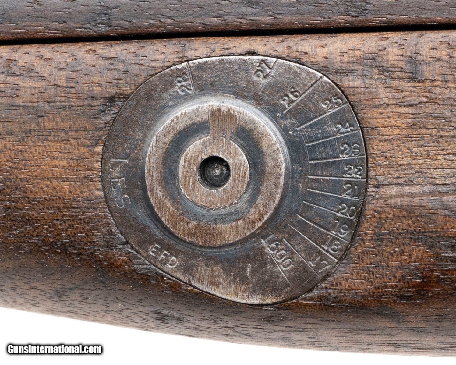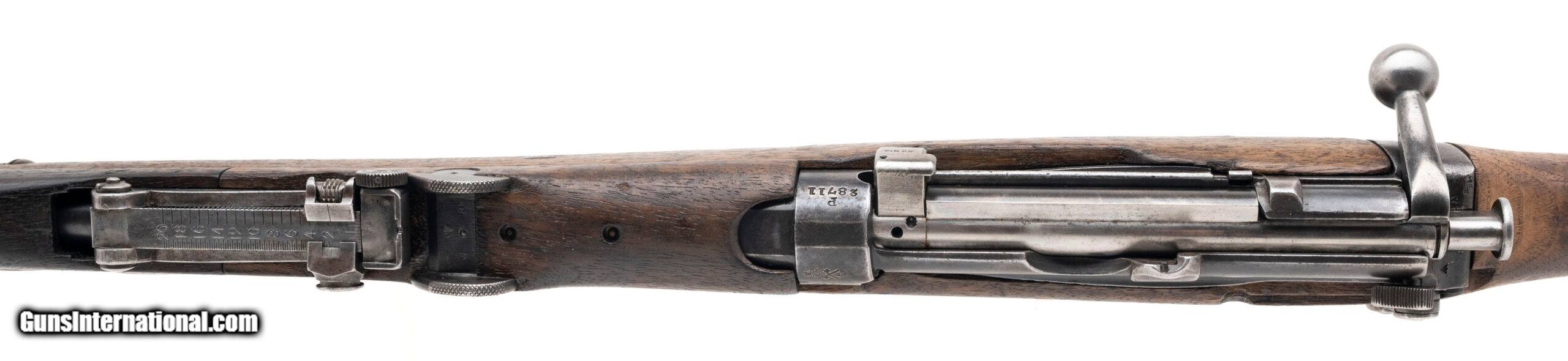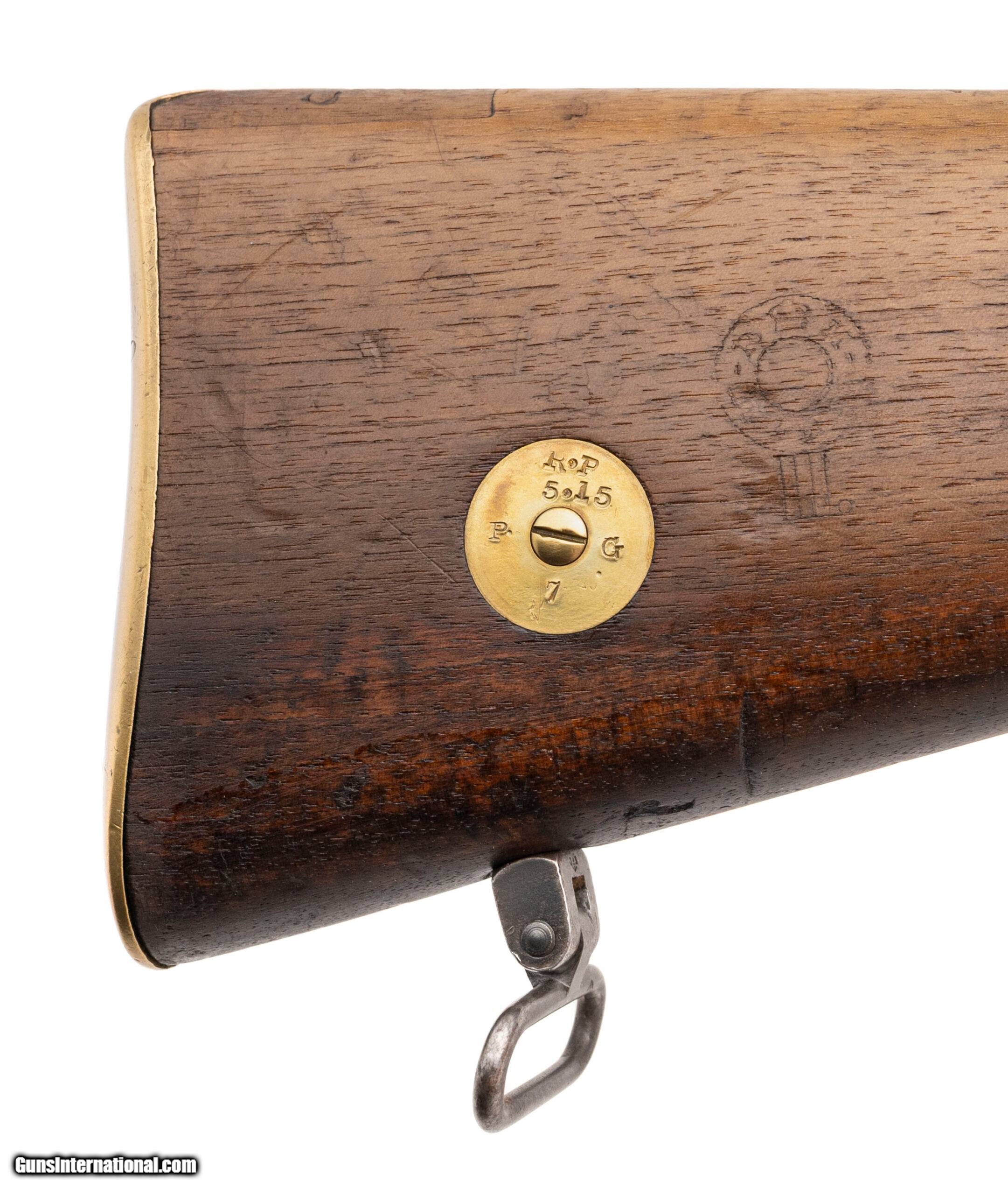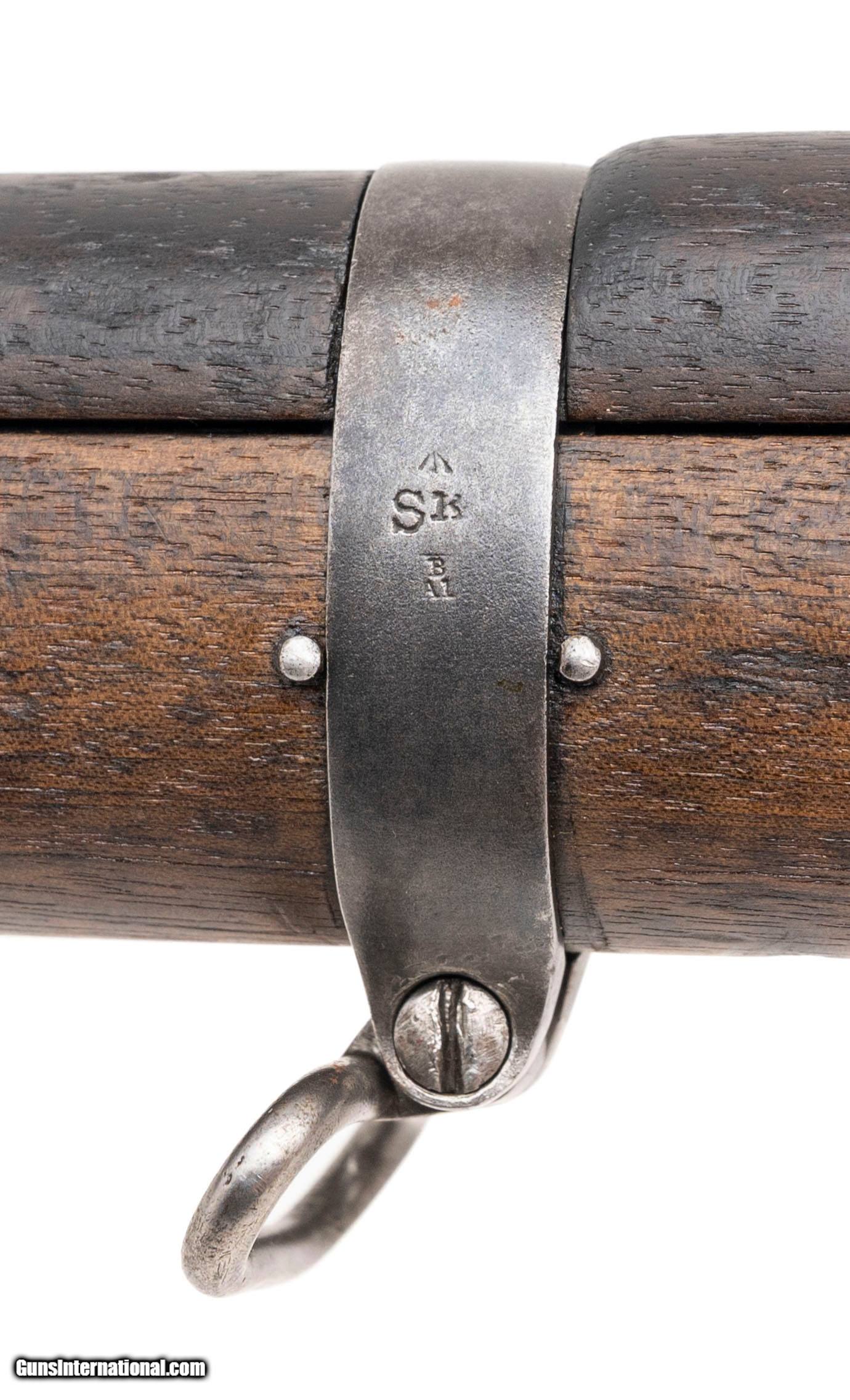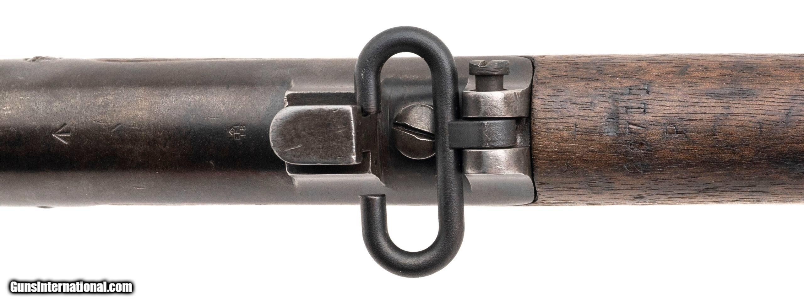 Description: "Serial No. P28711, originally manufactured in 1898 and later converted by Sparkbrook in 1905 to the Short Magazine Lee-Enfield configuration before undergoing its final transformation into a .22 caliber training rifle. Serial numbers are matching, and the magazine—correct for these conversions—is unmarked with its spring and follower removed. Metal surfaces have thinned to a light grey patina Consistent with age and service. The socket cup is marked ""Crown/V.R./Enfield/1898/L.E./I/SHT.22/III/B.S.A. Co.," with the opposite side stamped “Sparkbrook/1905/SHT. L.E./COND II," clearly documenting its conversion lineage. The bolt head is properly marked “.22 No.2." Stock remains in overall good condition with light handling impressions and visible arsenal repairs. A faint cartouche is present on the butt, and the stock disk bears the marking “R.P/5.15/7" between “P–G," indicating unit or rack assignment. Action is smooth and functions correctly. Curio/Relic: Yes Price: $1,495.00 Contact Seller |