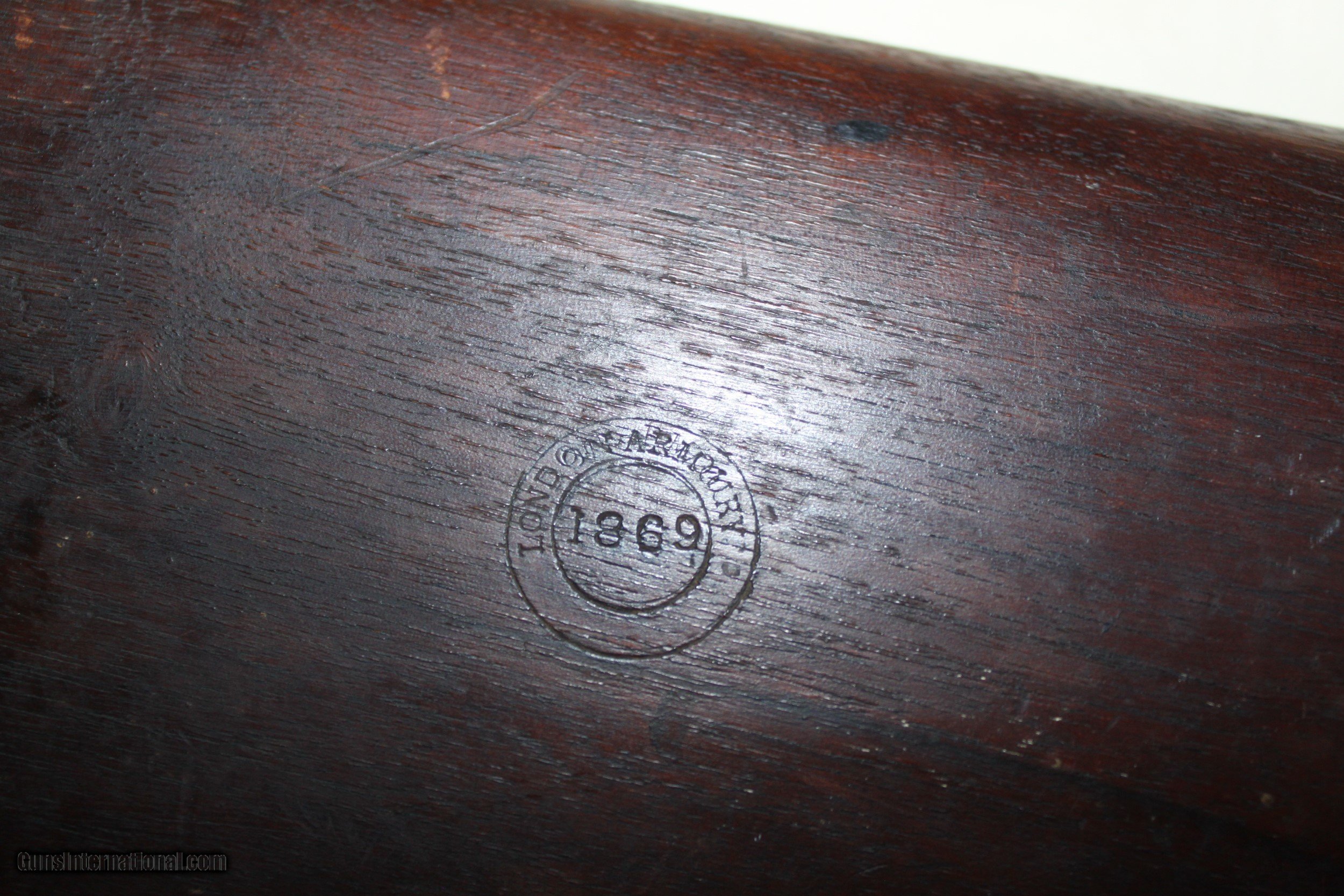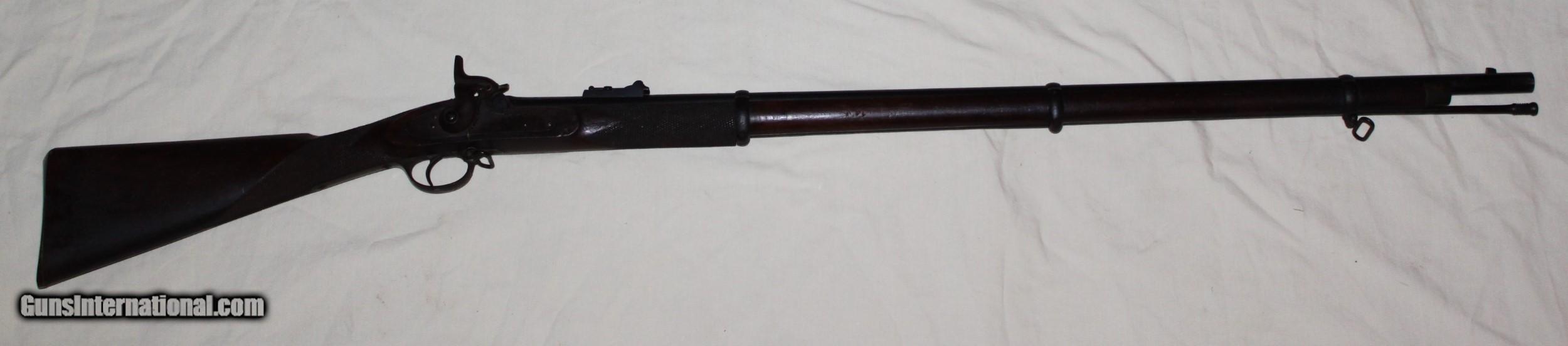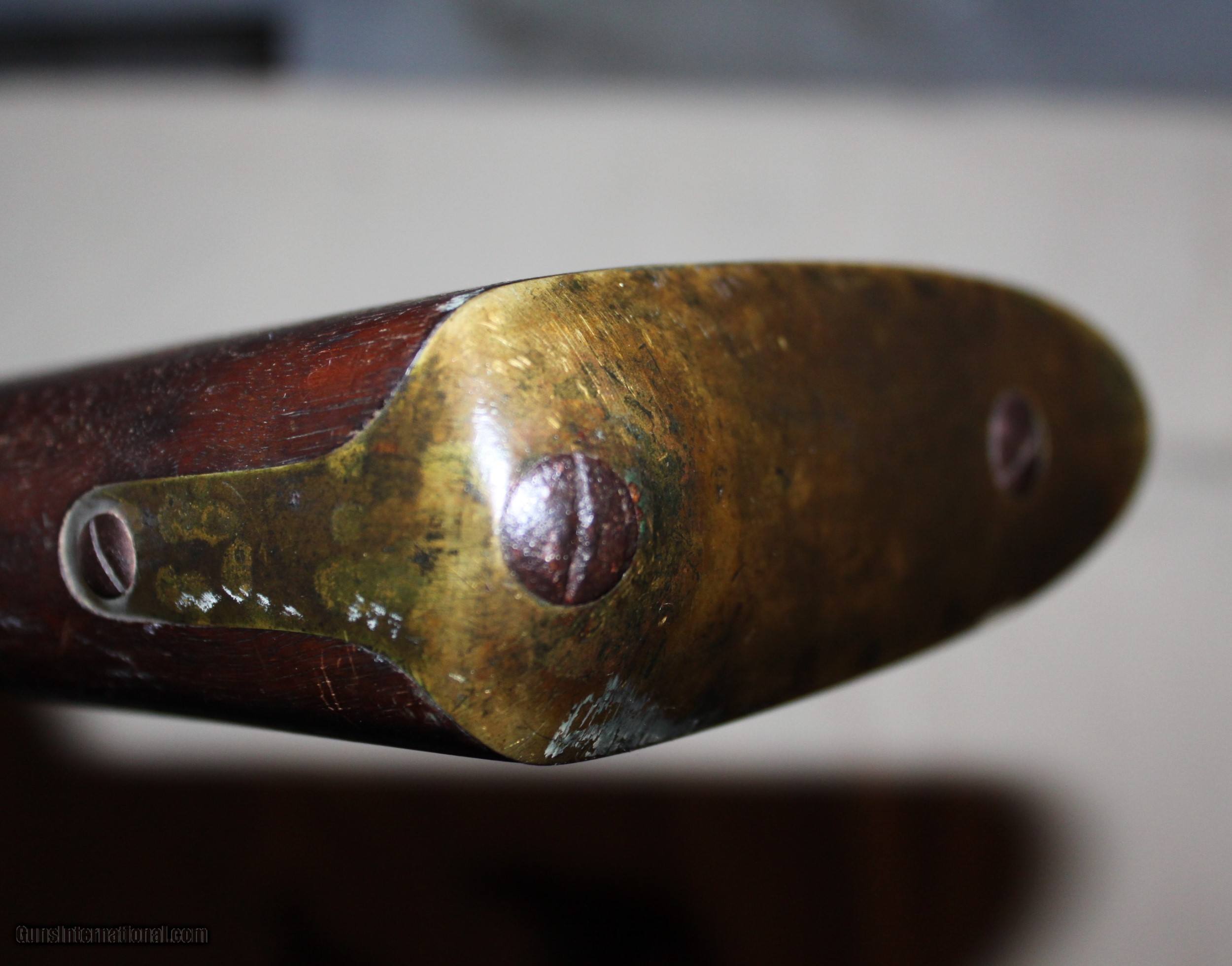 Description: 1853 Enfield Musket "Volunteer Pattern 53" Lock Plate Dated 1863 L.A.C. Wood Stock Stamped London Armory 1869 Checkered Stock and Forehand Grip likely issued during the New Zealand wars ( Land Wars ) 1845 - 1872 Musket is in Strong Working Order retaining most of the original Blue has surface rusting and rust inside the barrel. Domestic Sales Only SOLD |