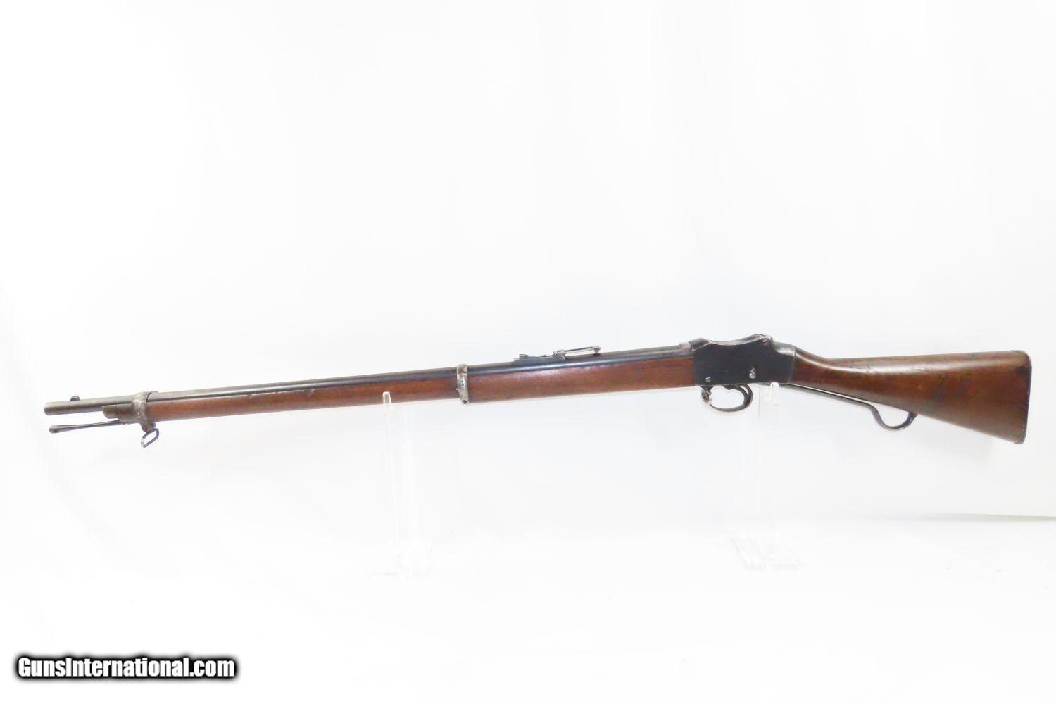 Description: Antique ENFIELD MARTINI-HENRY MKIV Single Shot .577/450 FALLING BLOCK Rifle 1887 Dated BRITISH Imperial Legacy Rifle Here we present an antique Enfield Martini-Henry Mk IV Single Shot Falling Block Military Rifle made circa 1887. These rifles had a production run between 1871 and 1889 with somewhere between 500,000 and 1,000,000 produced. The first iteration of the rifle came about in 1871 and was adopted by the British Army to replace the Enfield Snider Breech Loading Rifles that were being phased out. The action is based on the patent by American and Boston native Henry O. Peabody, which was improved by Swiss inventor Friedrich von Martini. The new polygonal barrel rifling was the design of Scotsman Alexander Henry. This is where the rifle derives its name. Martini–Henry variants were used throughout the British Empire for 47 years. Like other British weapons, the Peabody-Martini-Henry saw action all over the world, and most famously in the Zulu Wars in Africa, but also in India and Afghanistan. Like other British rifles, this one is littered with proof and acceptance markings on the barrel, receiver, and stock. “1887” is marked on the right side of the receiver along with Queen Victoria’s royal cipher and “IV” for Mk IV. The overall condition is very good. Strong blued finish with an arsenal refurbishment during the period of use. Excellent action. The bore is bright with sharp rifling. This example sports a solid stock throughout. A great addition to the collection! Own the original! This is a legitimate antique and not a reproduction. Barrel is 33 inches. Caliber: .577/450 Overall condition as seen in photos. Very Fast. Very Safe. FREE SHIPPING WORLDWIDE. Delivered directly to your door by express mail! Guaranteed AUTHENTIC & Includes CERTIFICATE OF AUTHENTICITY. ancestryguns $1725 #210711 SOLD Antique: Yes |