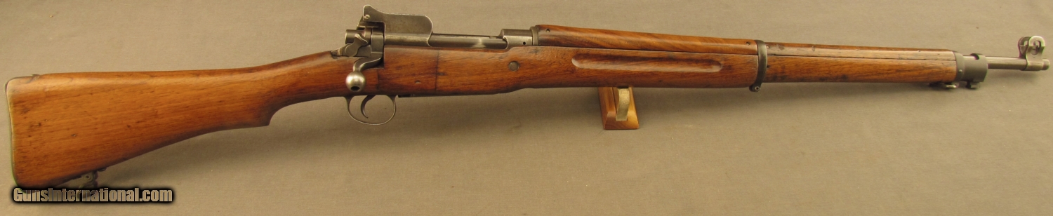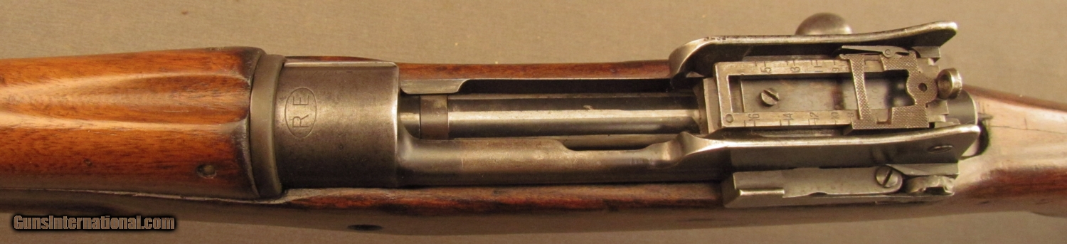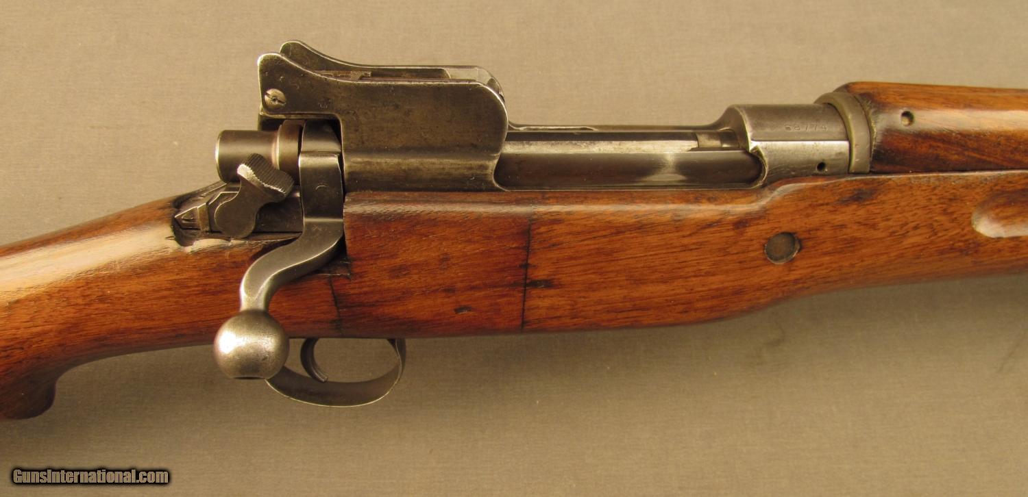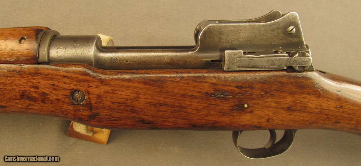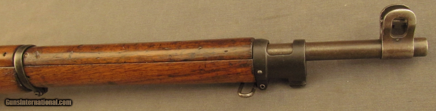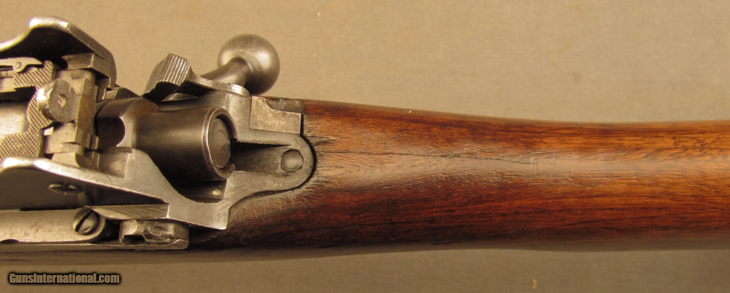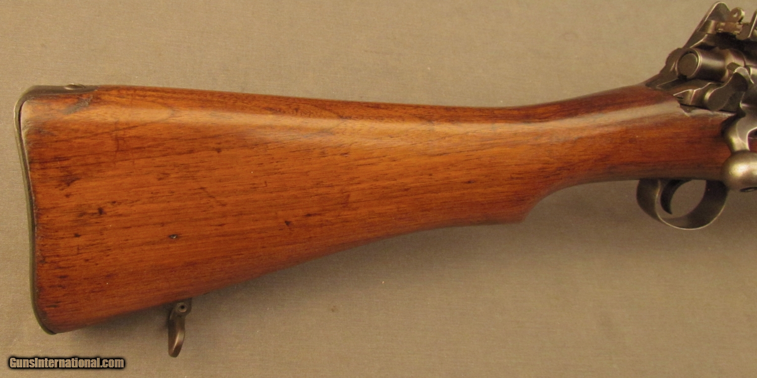 Description: Serial #68774, .303 British, 26” barrel with a very good, fairly bright bore that has mild freckling within the grooves. This rifle has matching “R” marked Remington bolt and rear sight with the metal retaining traces of the original blue finish on a few protected areas and on the bolt. The balance of the metal has a darkly mottled patina with even, light freckling throughout, and the commercial Birmingham proofs are still legible on the receiver next to the “RE (in oval)” maker mark. A small and unobtrusive import mark is present on the underside of the barrel just ahead of the nosecap. The “W” marked, Winchester-made walnut U.S. Model 1917 stock and handguard have numerous small scattered handling marks in the otherwise excellent reapplied varnish finish, and there are two well done repairs to the wood: one on the top of the handguard; and one on the right side of the receiver that has a straight, hairline crack running forward from the border. This is a very good example of a reworked Pattern 14 and is still a handsome rifle overall. FFL or C&R SOLD Curio/Relic: Yes Manufacturer: Remington Model: P-14 Serial Number: 68774 Caliber Info: .303 Gauge Info: .303 |