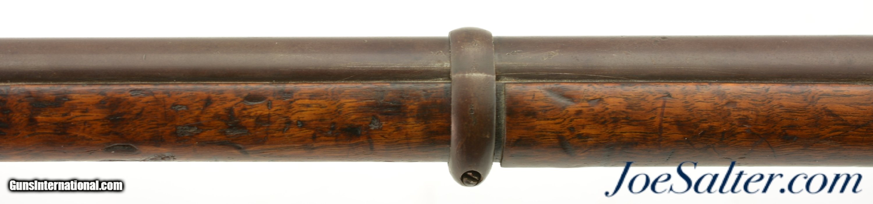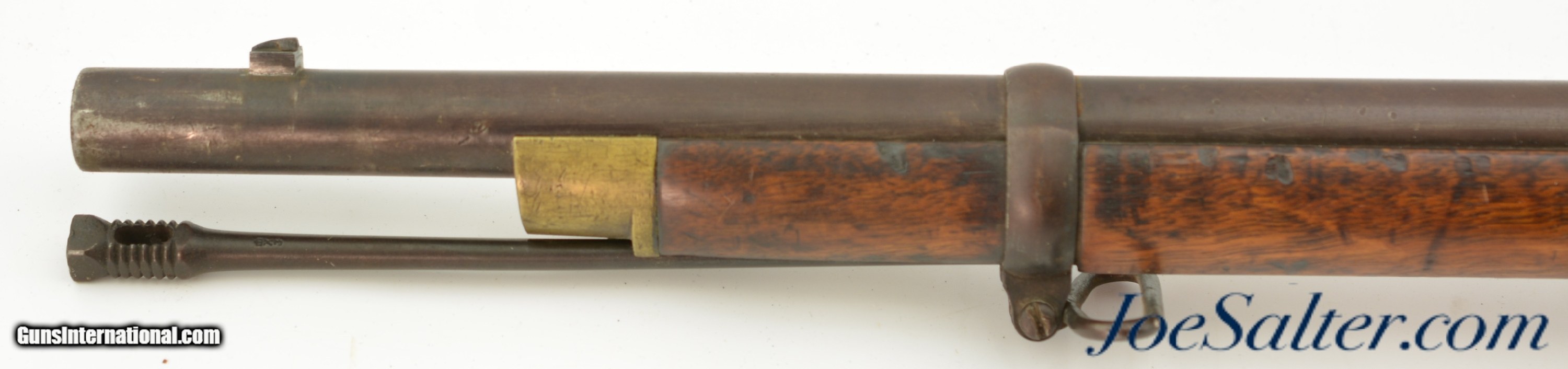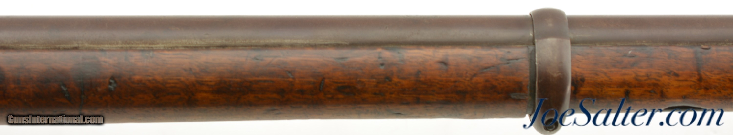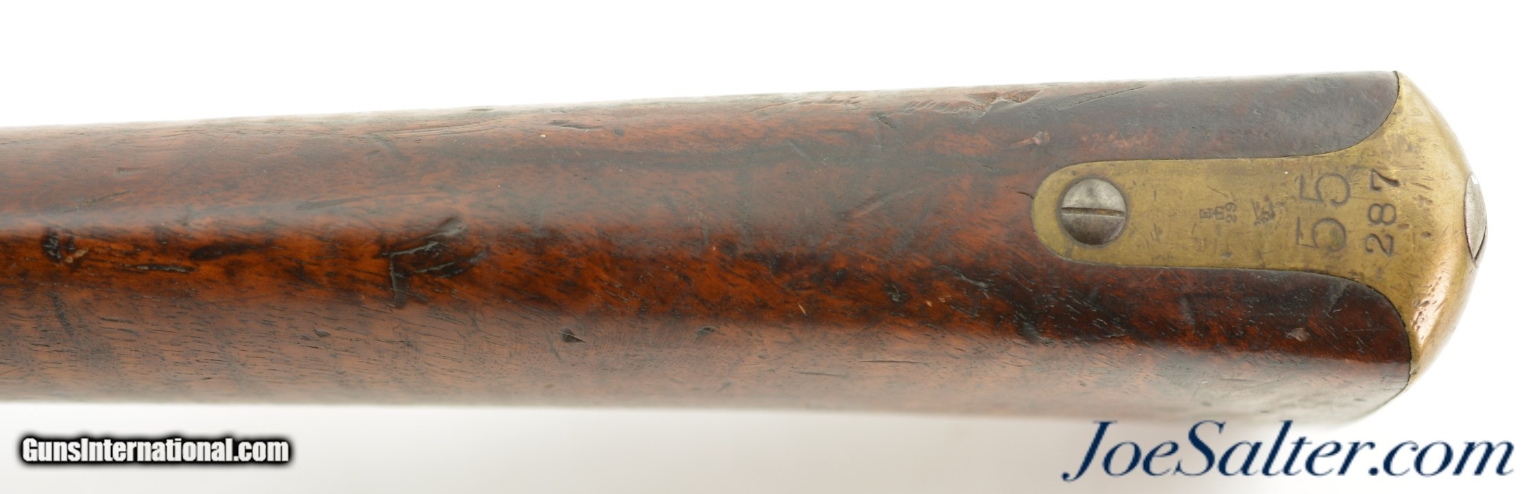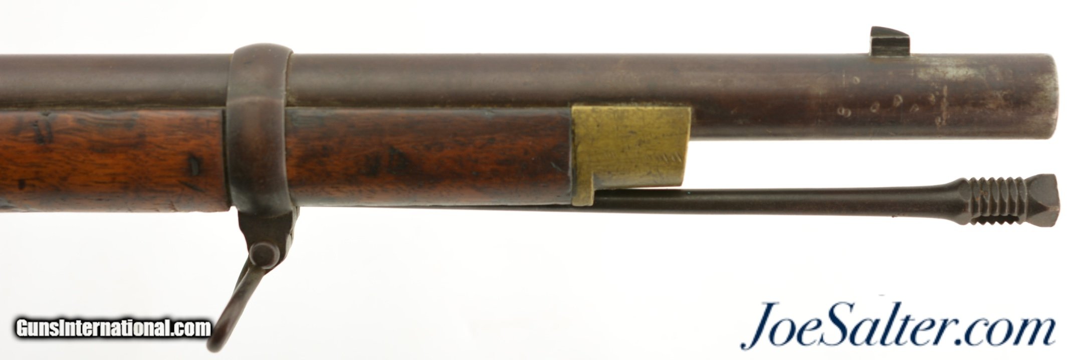 Description: NSN, .577 Snider, 36 1/2" barrel with a good bore that has spots of dark freckling and pitting along its length. This was built on an 1858-dated, "ENFIELD" marked P-53 musket that has an overall dark plum-brown patina with some freckling on the lock, and traces of original blue remaining on the receiver and bolt. All markings are still clear and legible. The stock has numerous small handling marks and bruises scattered throughout, with a fairly large gouge on the left side opposite the lock, and what looks like a small burned area on the right side of the forend a few inches back from the forward barrel band. Additionally, there is a large chip forming on the top of the wrist running from the tip of the barrel tang to the rear of the lockplate on the right side. The Enfield arsenal marking on the right side of the buttstock is still clear and legible. The brass furniture has developed a dull ochre patina over time, with unit battalion and stand numbers plainly legible on the buttplate tang: "55 / 287." The original square-tipped ramrod is still present. This is a good looking Snider conversion, in about good condition overall, and would make a nice representative example for a collection. Antique; SOLD Antique: Yes |