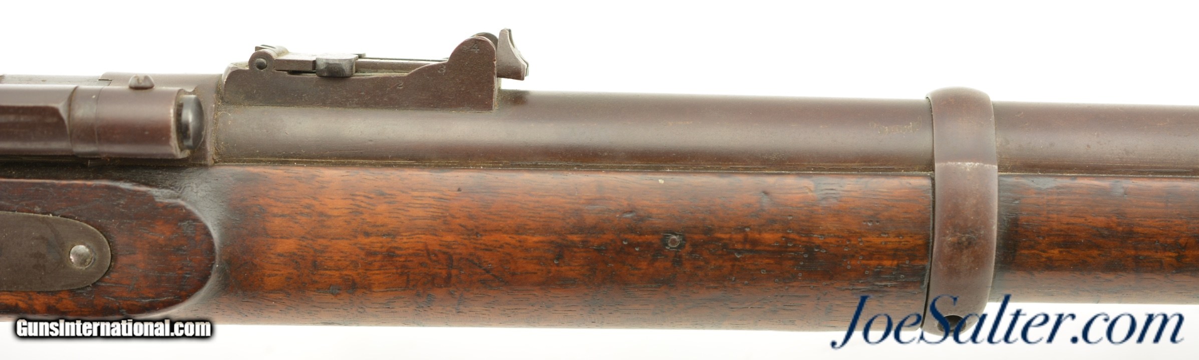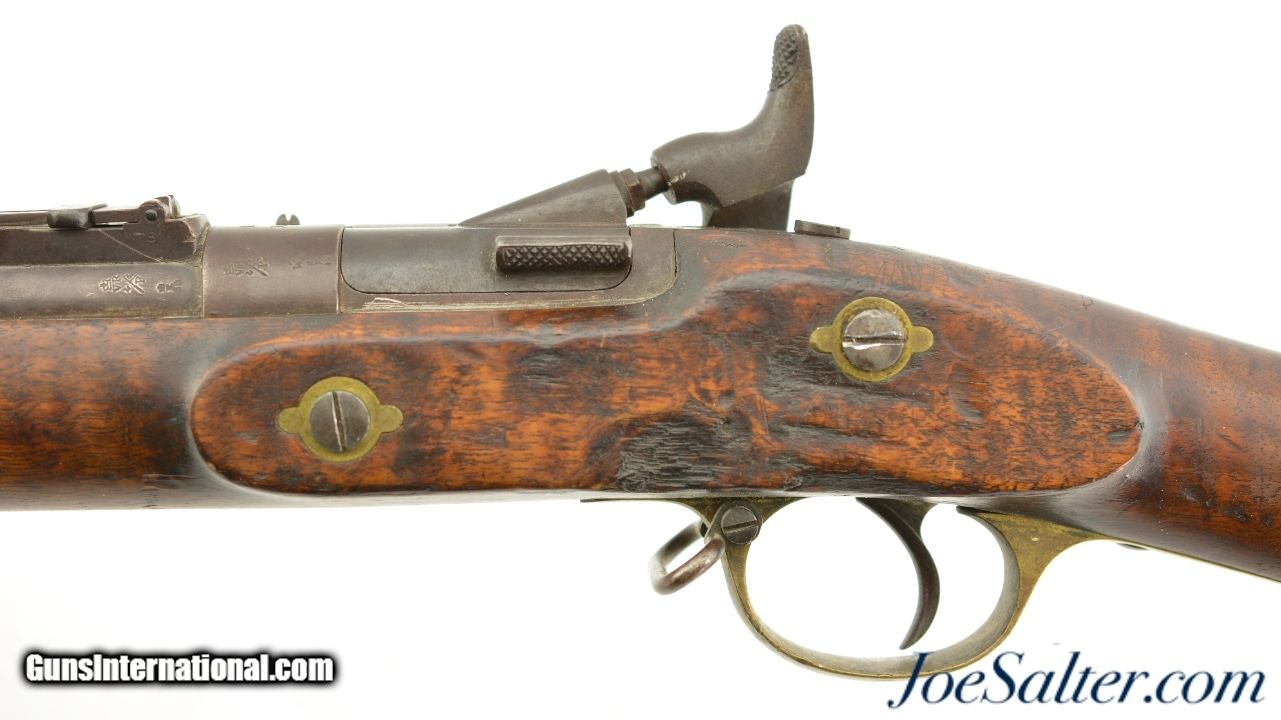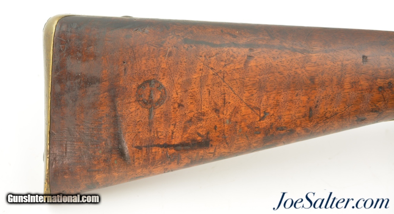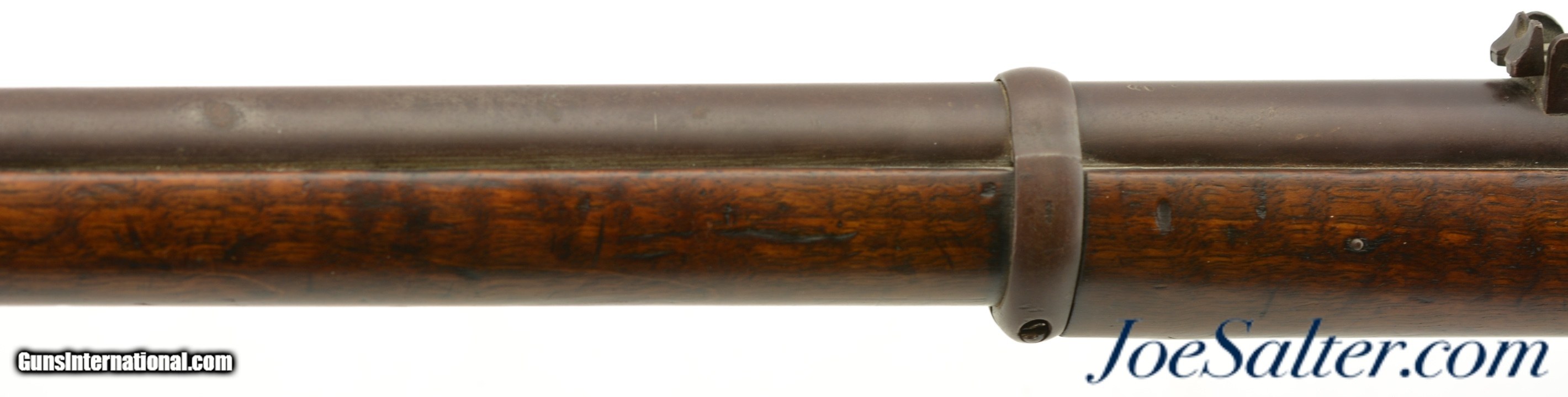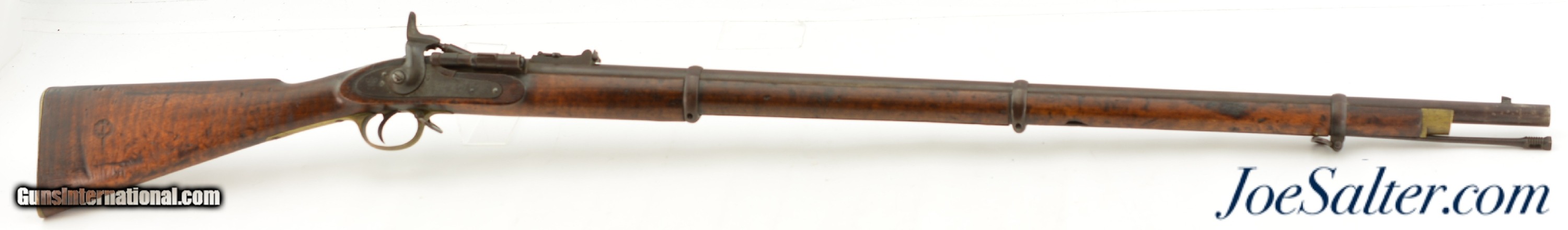 Description: NSN, .577 Snider, 36 1/2" barrel with a good bore that has spots of dark freckling and pitting along its length. This was built on an 1858-dated, "ENFIELD" marked P-53 musket that has an overall dark plum-brown patina with some freckling on the lock, and traces of original blue remaining on the receiver and bolt. All markings are still clear and legible. The stock has numerous small handling marks and bruises scattered throughout, with a fairly large gouge on the left side opposite the lock, and what looks like a small burned area on the right side of the forend a few inches back from the forward barrel band. Additionally, there is a large chip forming on the top of the wrist running from the tip of the barrel tang to the rear of the lockplate on the right side. The Enfield arsenal marking on the right side of the buttstock is still clear and legible. The brass furniture has developed a dull ochre patina over time, with unit battalion and stand numbers plainly legible on the buttplate tang: "55 / 287." The original square-tipped ramrod is still present. This is a good looking Snider conversion, in about good condition overall, and would make a nice representative example for a collection. Antique; SOLD Antique: Yes |
