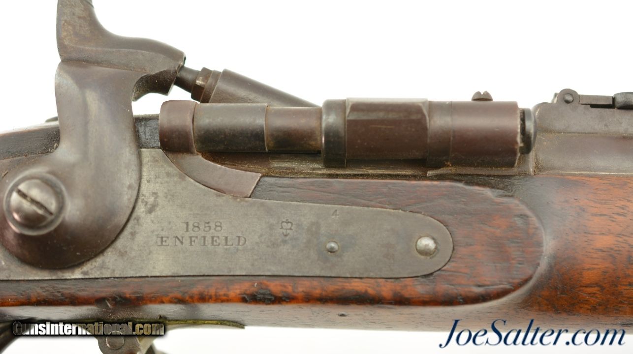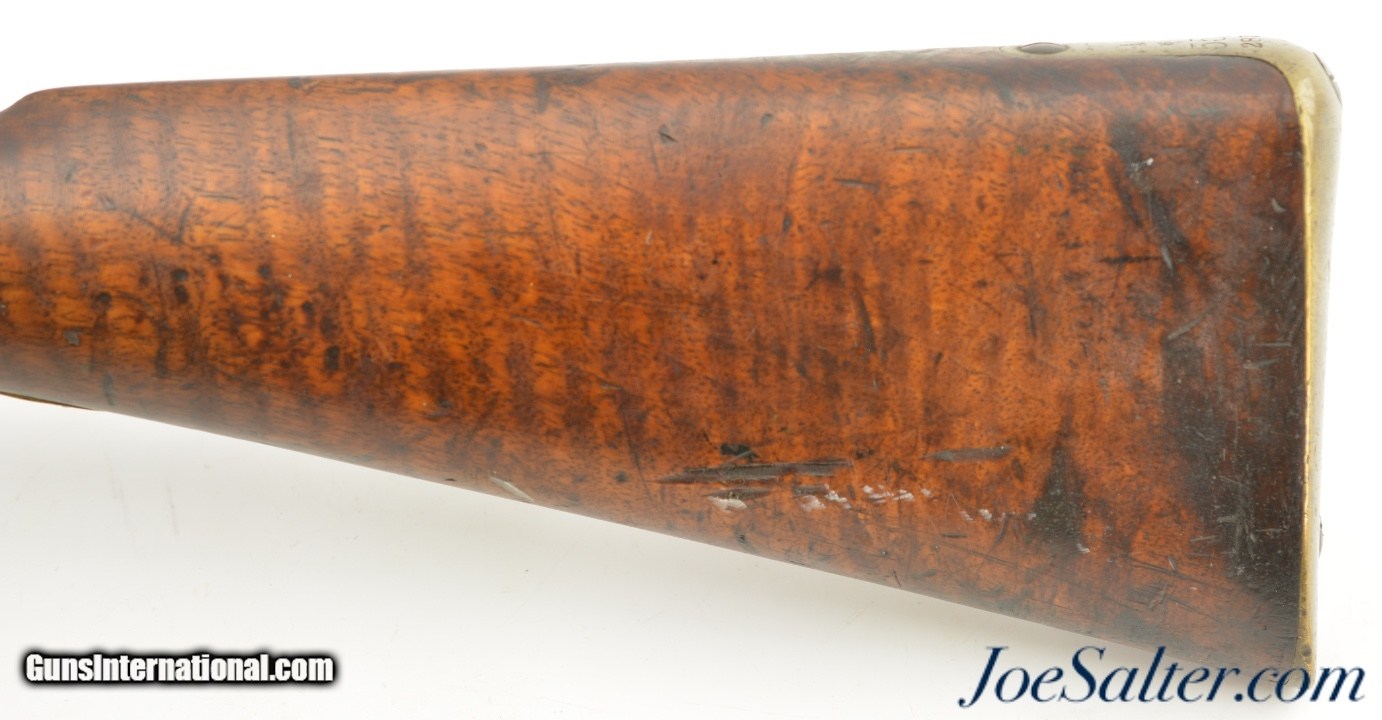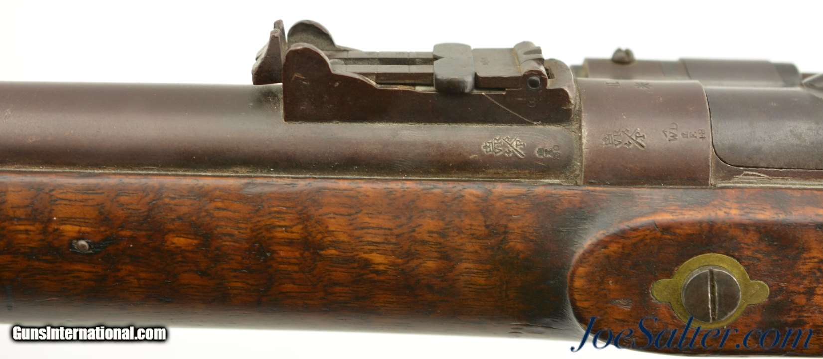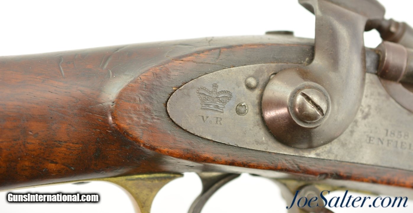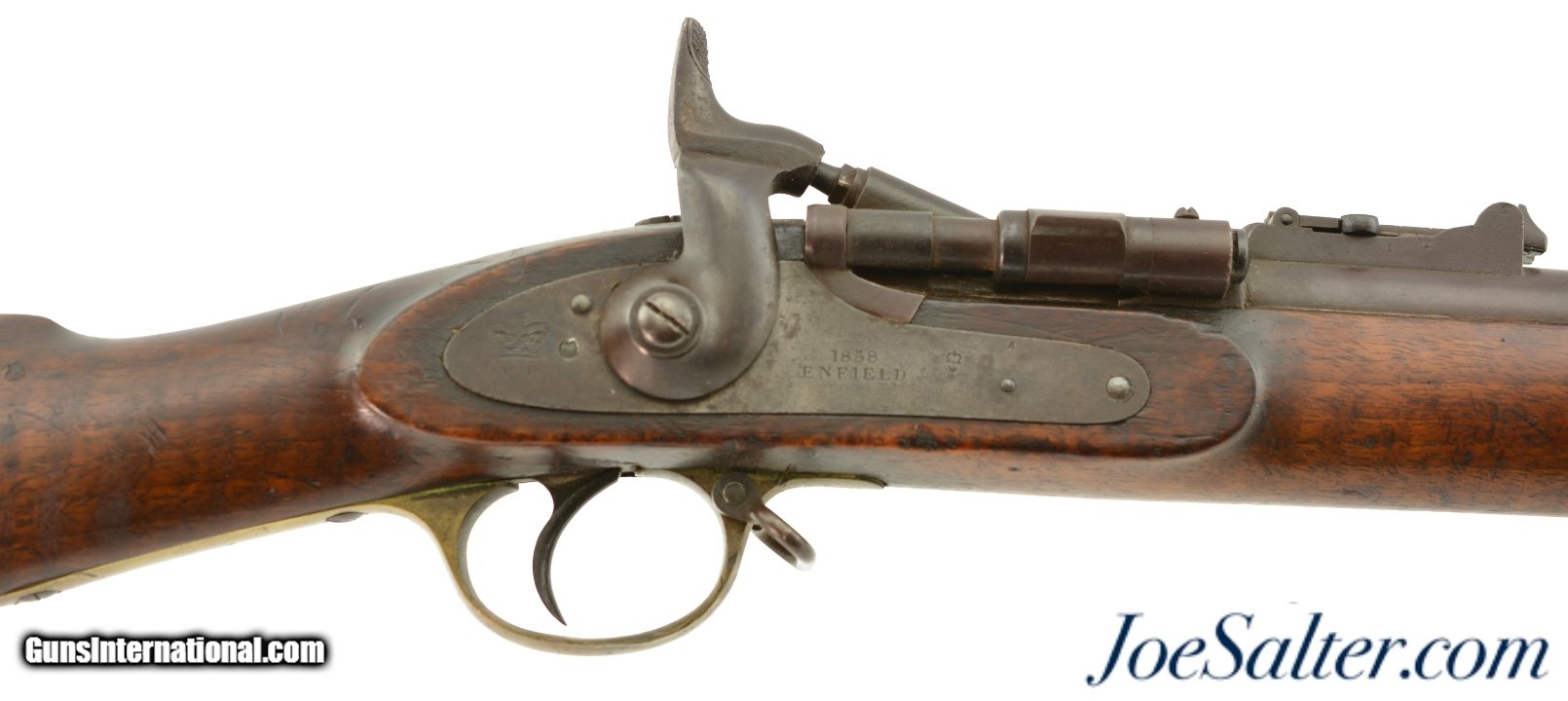 Description: NSN, .577 Snider, 36 1/2" barrel with a good bore that has spots of dark freckling and pitting along its length. This was built on an 1858-dated, "ENFIELD" marked P-53 musket that has an overall dark plum-brown patina with some freckling on the lock, and traces of original blue remaining on the receiver and bolt. All markings are still clear and legible. The stock has numerous small handling marks and bruises scattered throughout, with a fairly large gouge on the left side opposite the lock, and what looks like a small burned area on the right side of the forend a few inches back from the forward barrel band. Additionally, there is a large chip forming on the top of the wrist running from the tip of the barrel tang to the rear of the lockplate on the right side. The Enfield arsenal marking on the right side of the buttstock is still clear and legible. The brass furniture has developed a dull ochre patina over time, with unit battalion and stand numbers plainly legible on the buttplate tang: "55 / 287." The original square-tipped ramrod is still present. This is a good looking Snider conversion, in about good condition overall, and would make a nice representative example for a collection. Antique; SOLD Antique: Yes |
