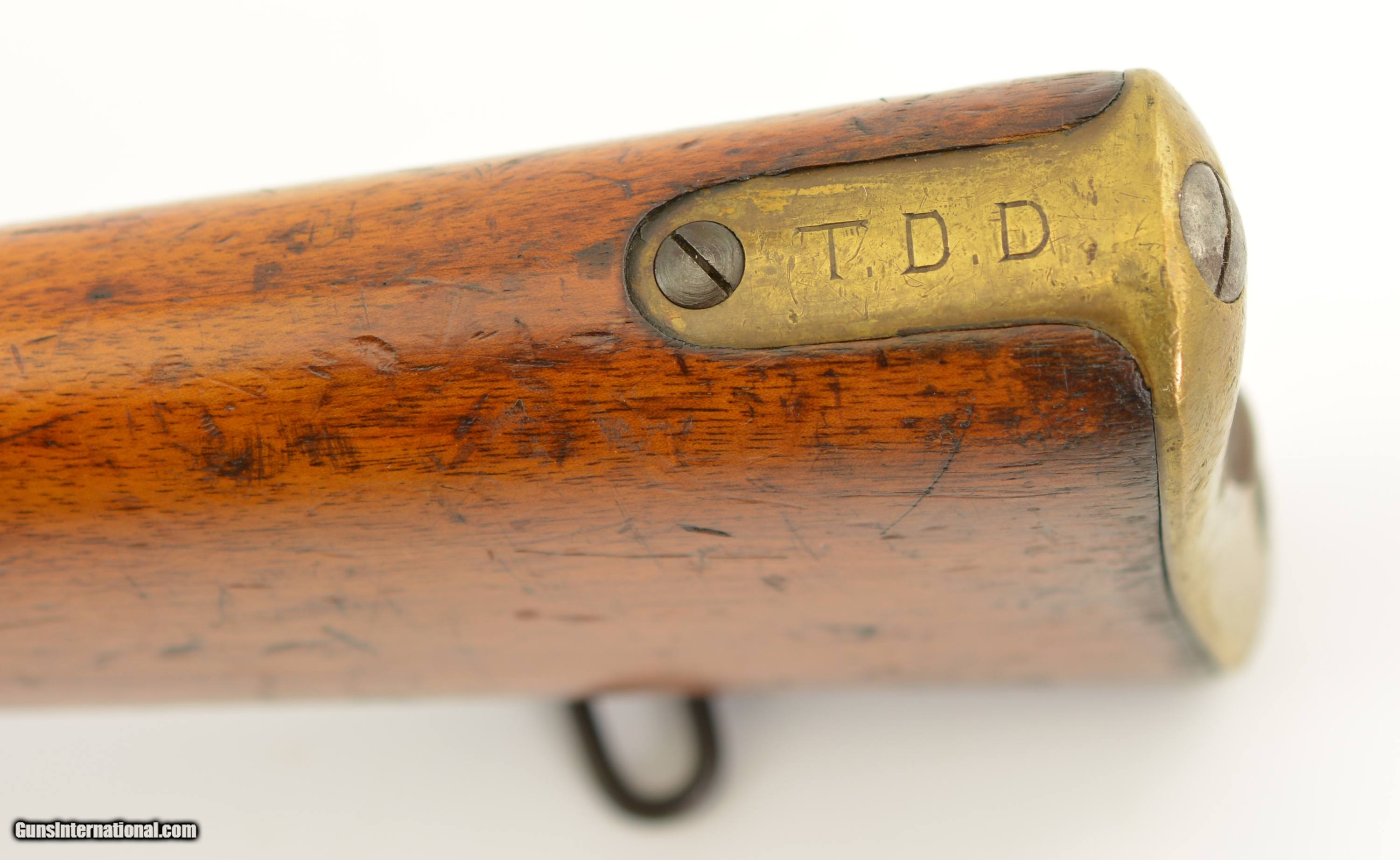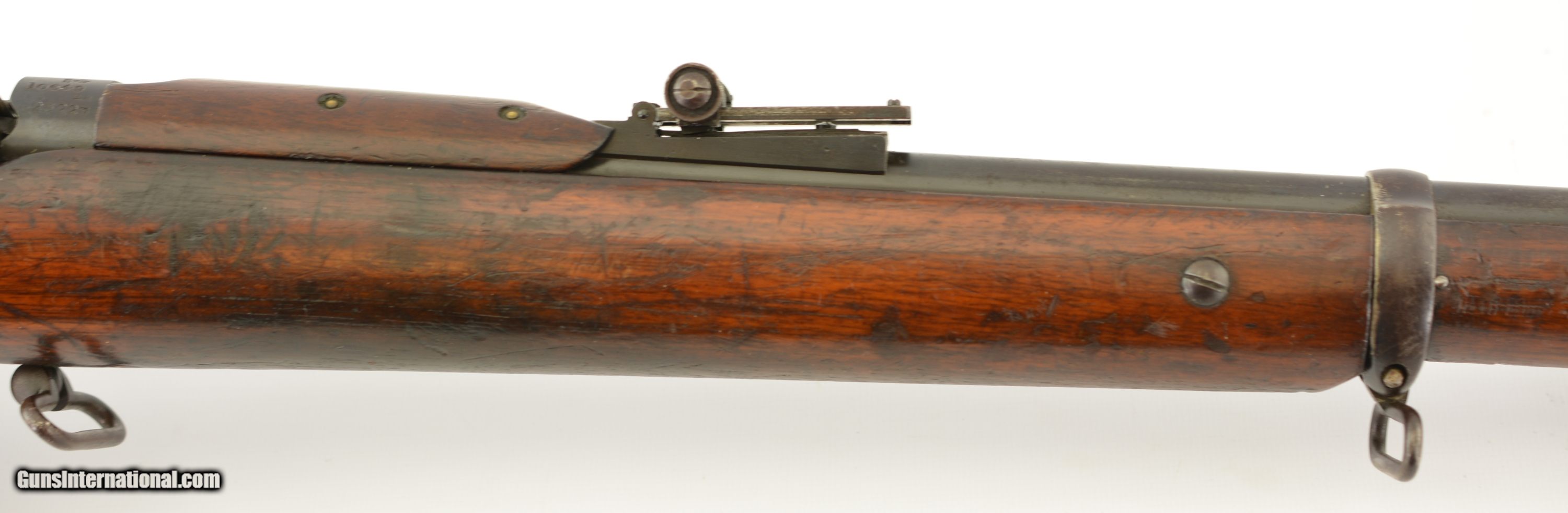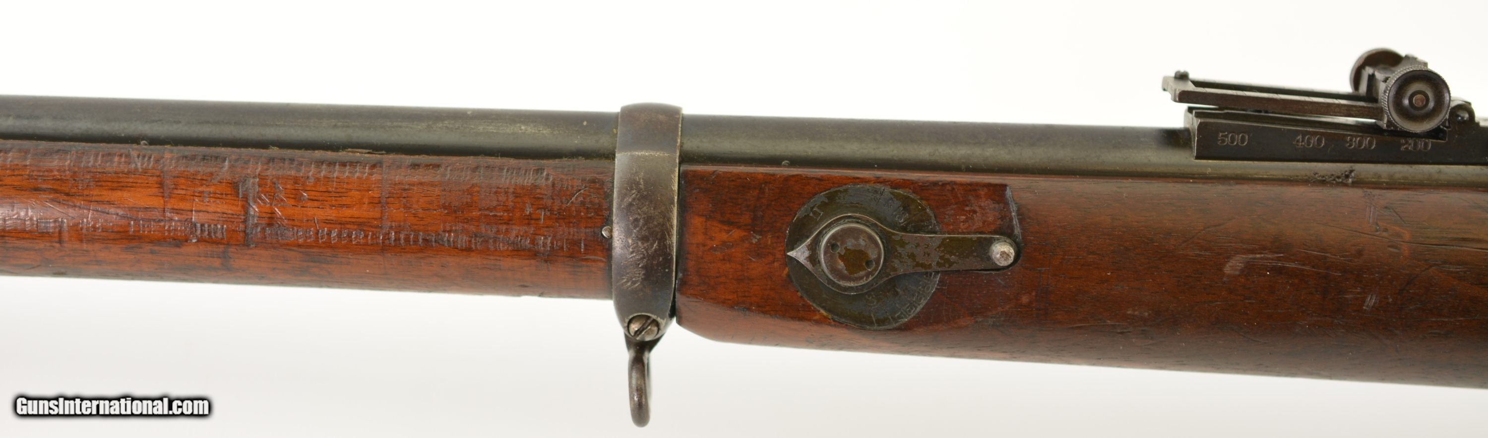 Description: Serial #10648 / 25227, .303 British, 30 1/4" barrel with a fine, bright bore that has some minor freckling within the grooves. This is a "BSA Co." marked rifle, with stacked rifles logo on the knox form. The metal retains 80-85% of the original blue finish that is blending into a smooth, dark plum-brown patina with some silvering along the edges, projections, and bearing surfaces. Some patches of thin freckling are also visible along the top of the "SUPERIOR NICKEL STEEL" marked barrel. The matching bolt is equipped with a safety, and has a mostly bright gray body with some streaks of darker freckling. The forward volley sight is still present, the front sight is equipped with protective wings, a windage adjustable 1800 yd back sight is fitted to the barrel, and a rare, BSA Tippin’s patent folding aperture sight is mounted on the receiver. The walnut stock and forend have numerous small handling marks and blemishes scattered about the added military oil finish, and a previous owner’s initials are engraved on the buttplate tang: "T.D.D." A correct magazine is fitted, and extensive commercial Birmingham proofs are present. This is a very nice Long Lee, in fine plus condition, that would make a great addition to any collection of British military match rifles. FFL or C&R SOLD Curio/Relic: Yes Manufacturer: Enfield Model: MK.1 Serial Number: 10648 / 25227 Caliber Info: .303 Gauge Info: .303 |