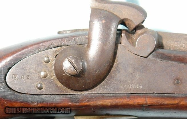 Description: CIVIL WAR ENFIELD STYLE SPANISH CONTRACT MODEL 1857 OR P1857 PERC. THREE BAND RIFLE MUSKET, DATED 1864. Quite rare possible Confederate use period copy of the P1853 rifle musket and made by various Spanish armories as well as well known Birmingham makers such as this one is. Has the the typical Birmingham makers proofs on barrel as well as tell tale lock makers marks under lock. Lock stamped Spanish Crown over "AR" (with backwards R). 39" rifled barrel with octagonal bolster area and having "26" bore diameter stamps. Rifled bore is excellent for one of these and ready to be used again if one so chooses. The bolster and nipple are excellent as well with very little pitting. Lock and two stage hammer very solid with original screws. Lock stamped with rack number at back. Other original numbers stamped in various places such as just forward of bolster on barrel, back of stock where there is another number and agent marks opposite in script. Original sights are correct. Original finish on all wood having never been sanded and markings it does have are crisp. Correct brass triggerguard, buttplate and forend cap. Rare three band type with original bands having Crown over "34" on them. 54 1/2" overall. Sling is a late replacement as is the ramrod(I think it was a re-enactor piece for a bit but well taken care of and never refinished in any way. Many of these found their way to America during the Civil War under various contracts with Spain, Belgium and the UK and are often found in poor condition due to hard Southern use. This one happens to be in better than usual condition and will fit in quite nicely with any Civil War collection. Rarer than the two band ones seldom encountered. SOLD Antique: Yes Rifle Caliber: .58 |