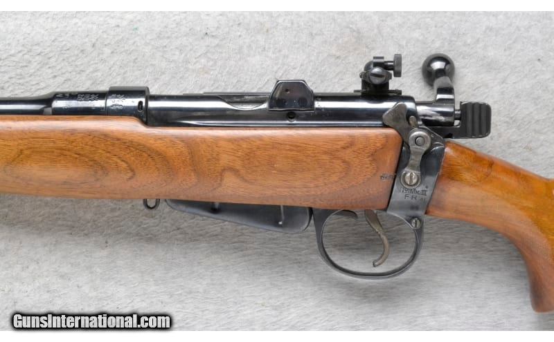Description: This Enfield Model No.1 MKIII is a right hand bolt action rifle in .303 Cal. It has a 25 inch barrel. A raised blade front sight and a Lyman adjustable aperture rear sight.The butt stock is a smooth grip hardwood pistol grip with a raised cheekpiece. The forearm is a smooth grip hardwood. S/N 13762. .303 British SOLD Chambers: Detachable Magazine. Metal Condition: Barrel has some minor freckling and a blue wear area behind the sight. Receiver has a little minor freckling. Wood Condition: Good. Some minor handling marks. Bore Condition: Good. Barrels: 25 inch. Stock Dimensions: LOP 14 1/4 inches. Fore End: Smooth grip hardwood. Butt Pad: Bishop checkered black plate. Weight: 7 lb. 12 oz. Sights: Raised blade front. Lyman adjustable aperture rear. Item Location: Richfield, WI |