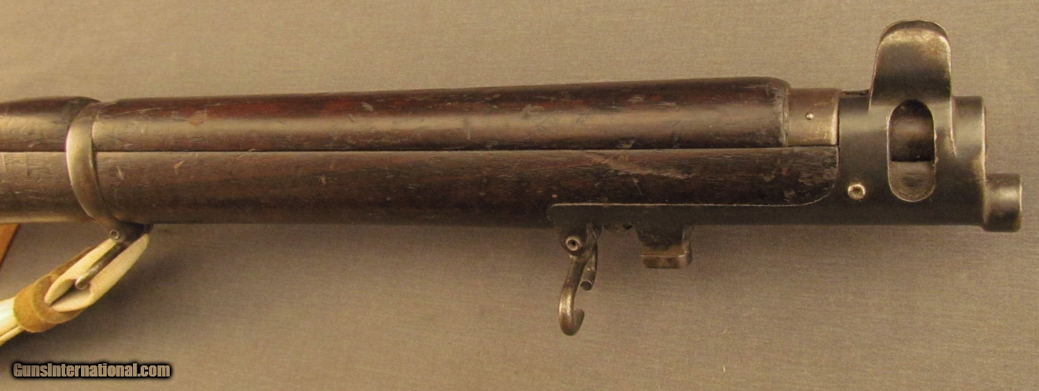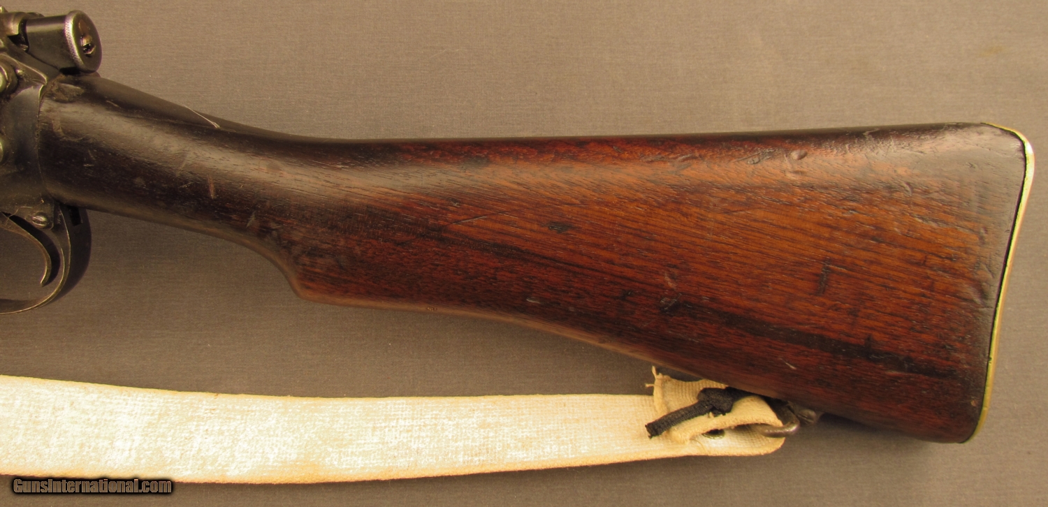 Description: Serial #AM1186, .22 LR, 25” Parker-Hale marked barrel with an excellent, bright bore. This is a BSA-made, 1916 dated, Mk. III* rifle converted to rimfire trainer that has matching numbers on the bolt and nosecap with the metal retaining 85-90% of the armory re-applied blue finish added during the rimfire conversion that has silvering with some sparse brown freckling on some of the exposed edges and surfaces. The “22No.2” marked bolt has a freckled gray bolt-head and there is a small C.A.I. import marking on the right side of the receiver. The walnut buttstock has a dark military oil finish with a rectangular repair on the right side just ahead of the charger guide and numerous small handling marks and minor blemishes scattered about the remaining wood. A canvas SMLE sling with faded whitewashed finish is installed and an empty magazine body is included (no follower or spring). This is a very nice No. 2 trainer that has rare Air Ministry markings and is in very good plus condition overall. FFL or C&R SOLD Curio/Relic: Yes Manufacturer: Enfield Model: SMLE Serial Number: AM1186 Caliber Info: .22LR Gauge Info: .22LR |