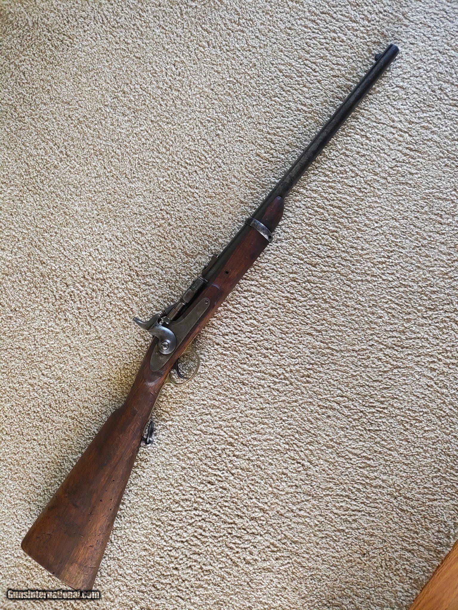 Description: Enfield snider 577 carbine English proof marks. Left side of barrel has pitting from storage. Dings and marks on stock no cracks. Has cleaning rod in stock. Original condition nice tight action excellent bore, will make a good shooter. Hard to find theses carbines with a nice bore. $800 please call 805-922-9920 SOLD |