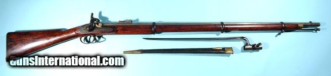 Description: FINE CIVIL WAR PARKER FIELD & SONS ENFIELD PATTERN 1853 RIFLE MUSKET W/ BAYONET. .577 caliber 39” barrel engraved at the breech “233 HOLBORN LONDON” and with London proofs at the left breech. Lock pate engraved “PARKER FIELD & SONS”. 100% original and fine overall with oil quenched case hardened lock and grey patina barrel with some very fine salt and pepper. Barrel bands with minor blue mixed with patina. Nipple still has nearly all the blue. Brass mounts with dark unpolished umber color. Extremely nice stock with about all the original finish. Original ramrod. Perfect working order and near mint bore. Excellent original bayonet with “Parker Field & Son/233 Holborn London” maker’s etched panel on the blade and engraved floral decoration as well. Original scabbard. One of the 5 Pattern 1853 contractors to the Confederacy. Two contracts are known for 1863 for 1700 and 3800 to be delivered for 65 shillings in the first instance and no more than 70 shillings for the latter. Scarce and particularly nice example. SOLD Antique: Yes |