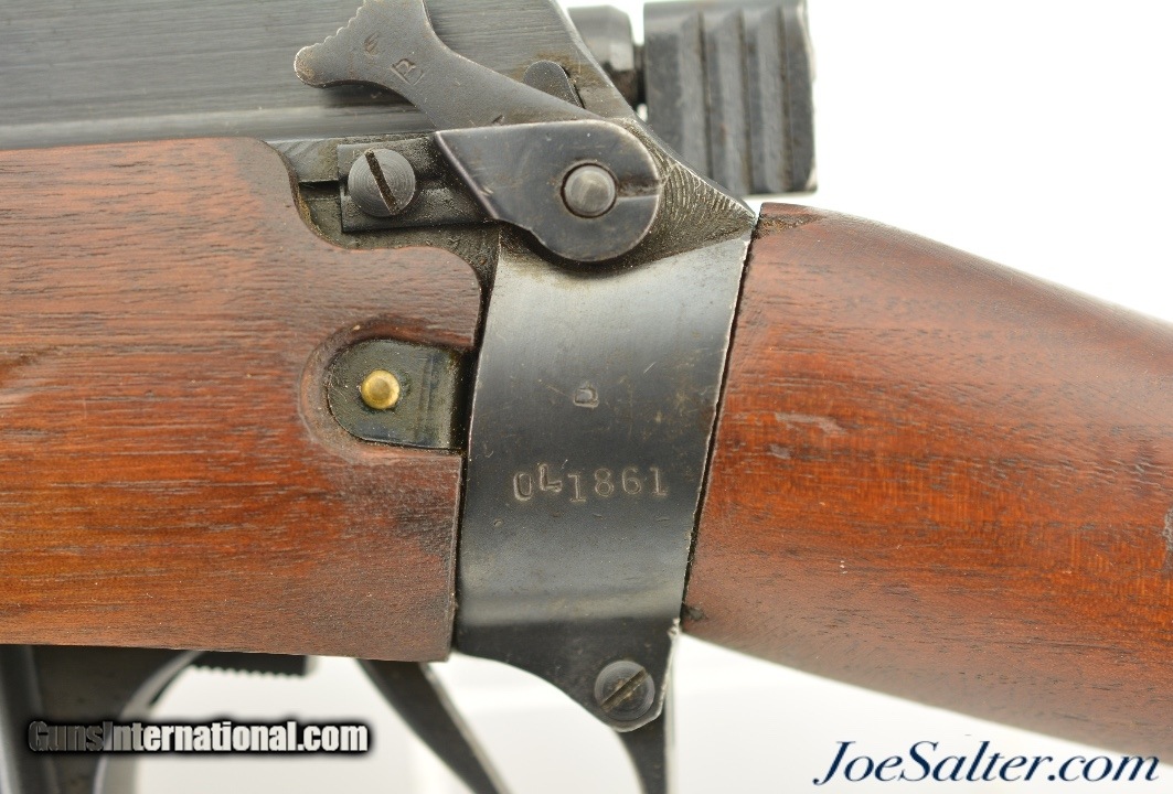 Description: Serial #0L1861, .22 LR, 25" barrel with an excellent, bright bore. This is a very handsome rifle, built in 1944, and is in virtually unissued condition. The metal retains 98-99% of the original blue finish, with only some very minor silvering at the muzzle, as well as along some of the high edges and projections, and some silvering on the bearing surfaces of the matching bolt. There is a small and unobtrusive import stamp on the underside of the barrel, and all of the original markings are crisp and clear. The walnut forend, handguards, and buttstock have only a few minor handling marks in the original oil finish, with crisp "C (Broad Arrow)" and Long Branch inspection stamps. The rifle comes with a correct "22" marked loading tray/magazine housing, as well as a sheet metal front sight cover. These are extremely well-made and accurate rifles, and this one is in excellent, little-used condition. FFL or C&R SOLD Curio/Relic: Yes |