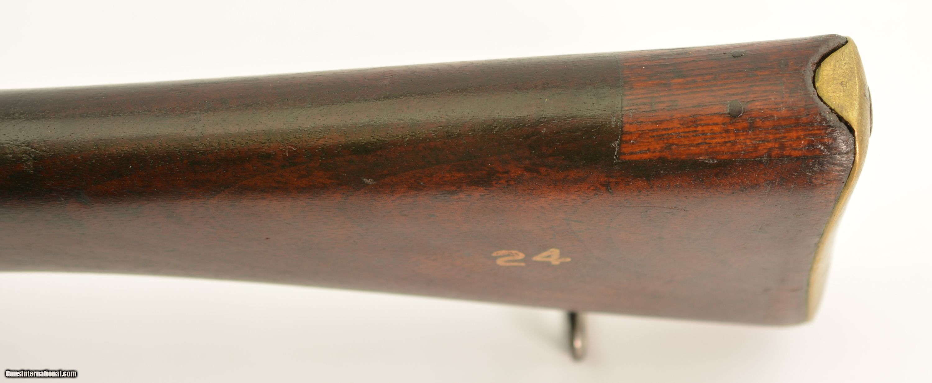 Description: Serial #H5510, .410 Bore, 25" barrel with an excellent, bright bore. This is an RFI conversion of an Enfield SMLE Mk. III* rifle and has had the barrel bored out to .41 caliber, a sheet metal loading tray installed in the receiver, and a wooden filler block added to the magazine well. The metal has retained 95-97% of an armory applied, dull blue-black finish (added during the conversion) while the matching bolt likewise has excellent matching finish with only some minor wear along a few of the bearing surfaces. The matching numbered forend, as well as the buttstock, and handguards, are in very good condition with scattered light handling marks and small blemishes throughout the otherwise thick armory oil finish. The buttstock has a white painted stripe at the wrist, and white painted numbers on either side of the butt: “24" on the left, “R (4)" on the right. These interesting guns were developed for use against unarmed crowds and fired rounds based on a straight case .303 loaded either with a single round lead ball or twelve shot pellets (quite lethal at close range but at longer ranges very unpleasant). Amazingly, many of these remain in Indian police armories today and are still issued for crowd control purposes. This example is in very good-near fine condition and would make a neat addition to a collection of Lee-Enfields. FFL or C&R SOLD Curio/Relic: Yes Manufacturer: Indian Model: SMLE Serial Number: H5510 Caliber Info: .410 Gauge Info: .410 |