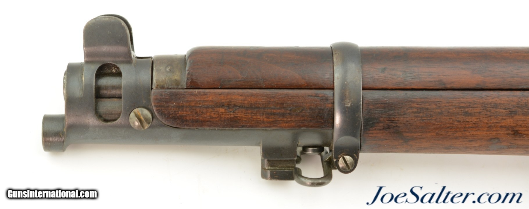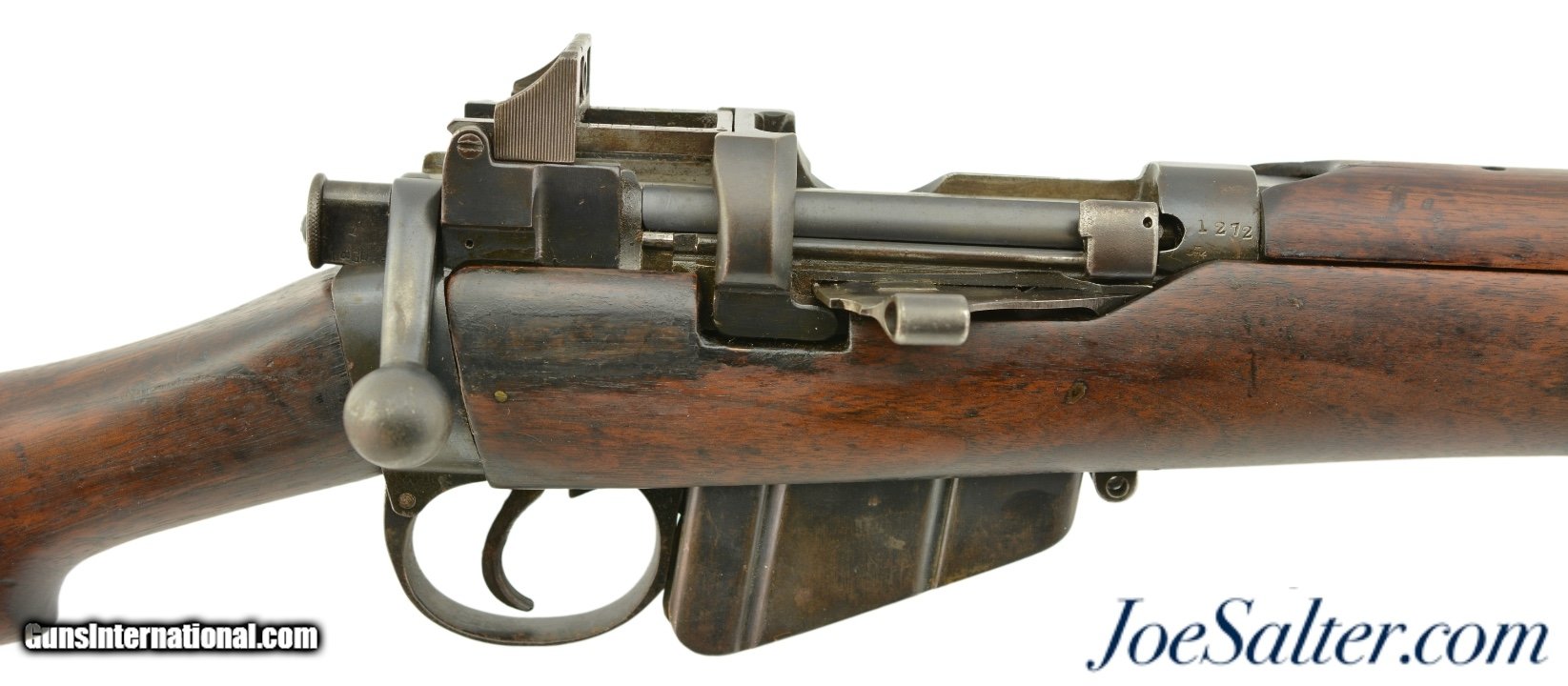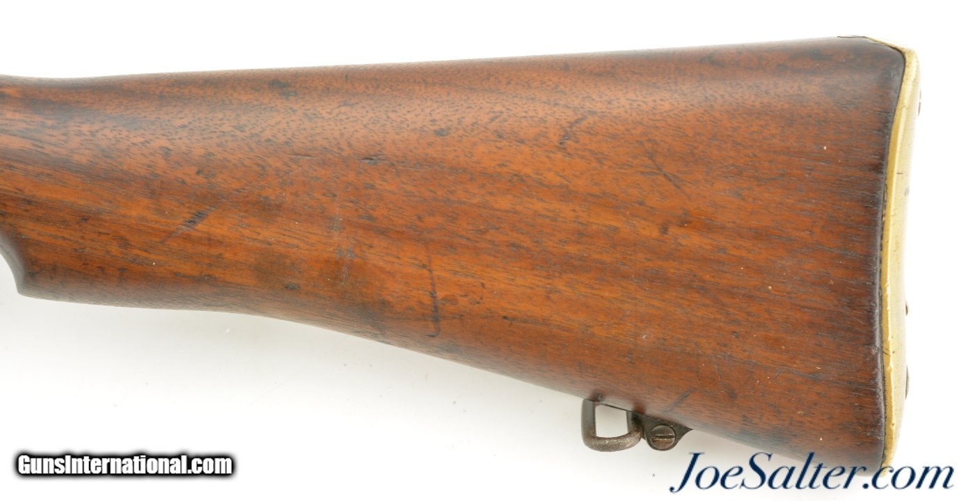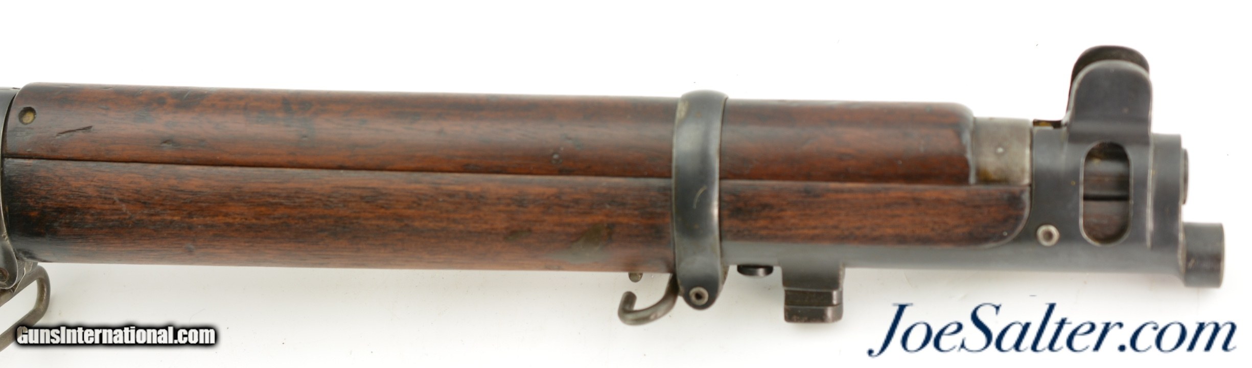 Description: Serial #1272, .303 British, 25" barrel with an excellent, bright bore. This 1922 dated, "ENFIELD" marked rifle retains 90-92% of the original blue finish with some silvering and fading along the exposed edges, projections, and contact points. The matching numbered bolt has some brown freckling along the handle and some areas of darker mottling the brightly finished body. The original flip-up aperture rear sight is complete, the distinctive Mk. V safety is present, as is the magazine cut-off. The forend, handguards, and buttstock have been arsenal refinished to excellent condition with nice added military oil finish, and minor handling marks scattered about.There is a hairline crack at the top rear of the lower handguard. A single Broad Arrow-stamped magazine is included, that has a mixed blue and plum-brown patina throughout. The SMLE Mk. V is a fascinating model, a link between the No. 1 and No. 4 series rifles, with about 20,000 manufactured between 1922 and 1924. While not a general issue rifle, the Mk. V saw limited use and many were subsequently sent to Greece and Ireland where they did see service. This desirable example is in fine condition overall, and would make a great addition to a collection. FFL or C&R; SOLD Curio/Relic: Yes |