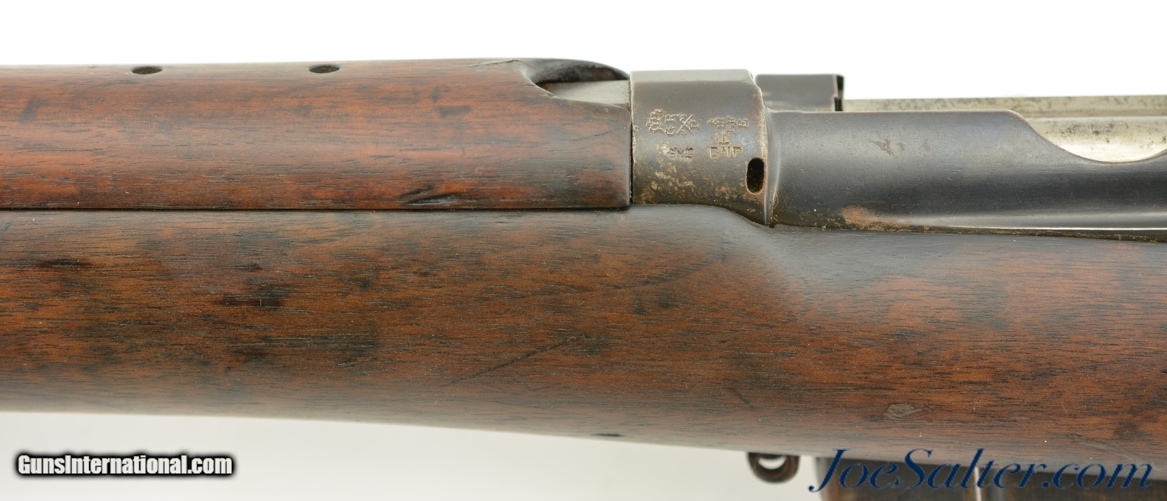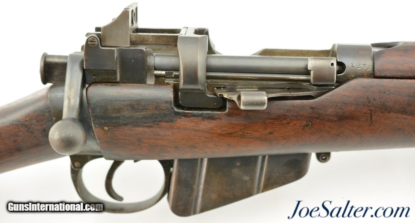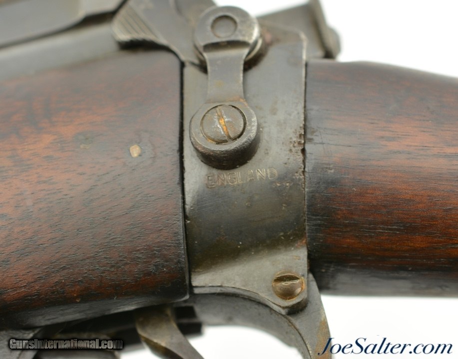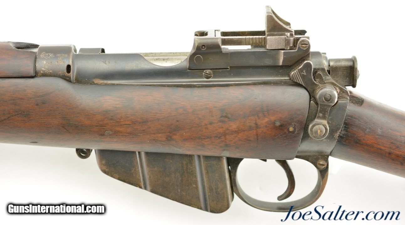 Description: Serial #1272, .303 British, 25" barrel with an excellent, bright bore. This 1922 dated, "ENFIELD" marked rifle retains 90-92% of the original blue finish with some silvering and fading along the exposed edges, projections, and contact points. The matching numbered bolt has some brown freckling along the handle and some areas of darker mottling the brightly finished body. The original flip-up aperture rear sight is complete, the distinctive Mk. V safety is present, as is the magazine cut-off. The forend, handguards, and buttstock have been arsenal refinished to excellent condition with nice added military oil finish, and minor handling marks scattered about.There is a hairline crack at the top rear of the lower handguard. A single Broad Arrow-stamped magazine is included, that has a mixed blue and plum-brown patina throughout. The SMLE Mk. V is a fascinating model, a link between the No. 1 and No. 4 series rifles, with about 20,000 manufactured between 1922 and 1924. While not a general issue rifle, the Mk. V saw limited use and many were subsequently sent to Greece and Ireland where they did see service. This desirable example is in fine condition overall, and would make a great addition to a collection. FFL or C&R; SOLD Curio/Relic: Yes |