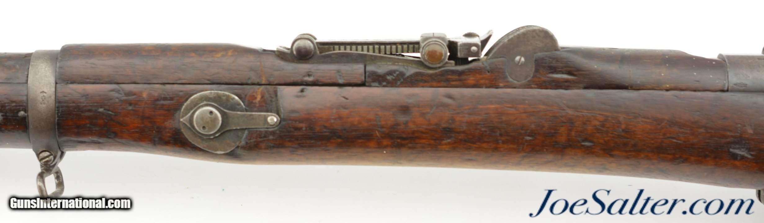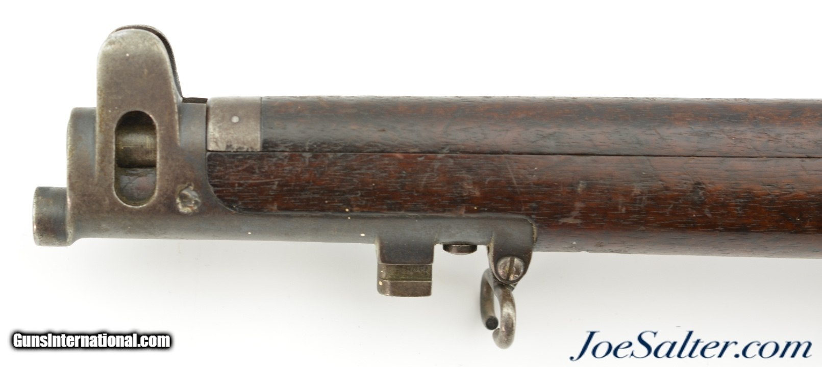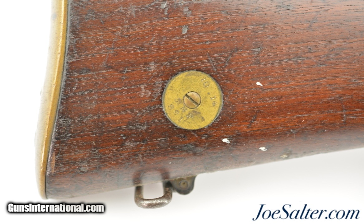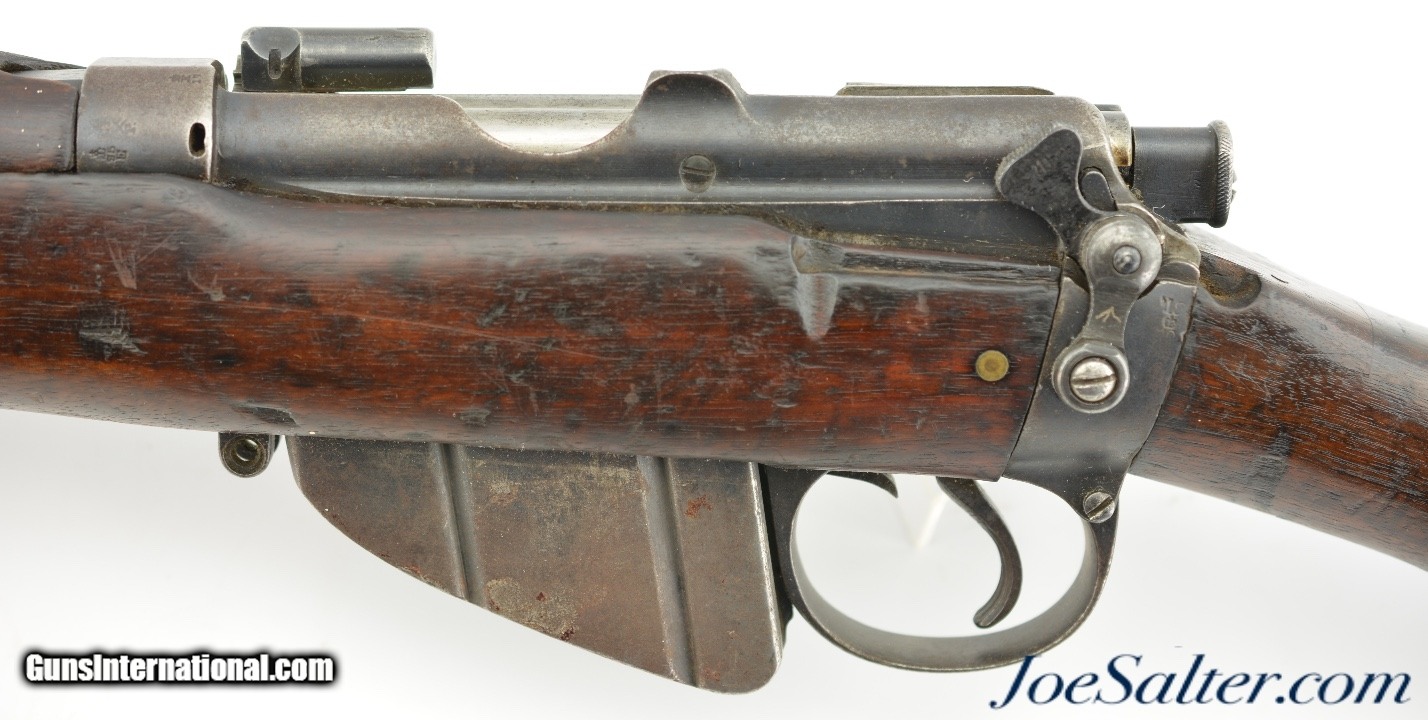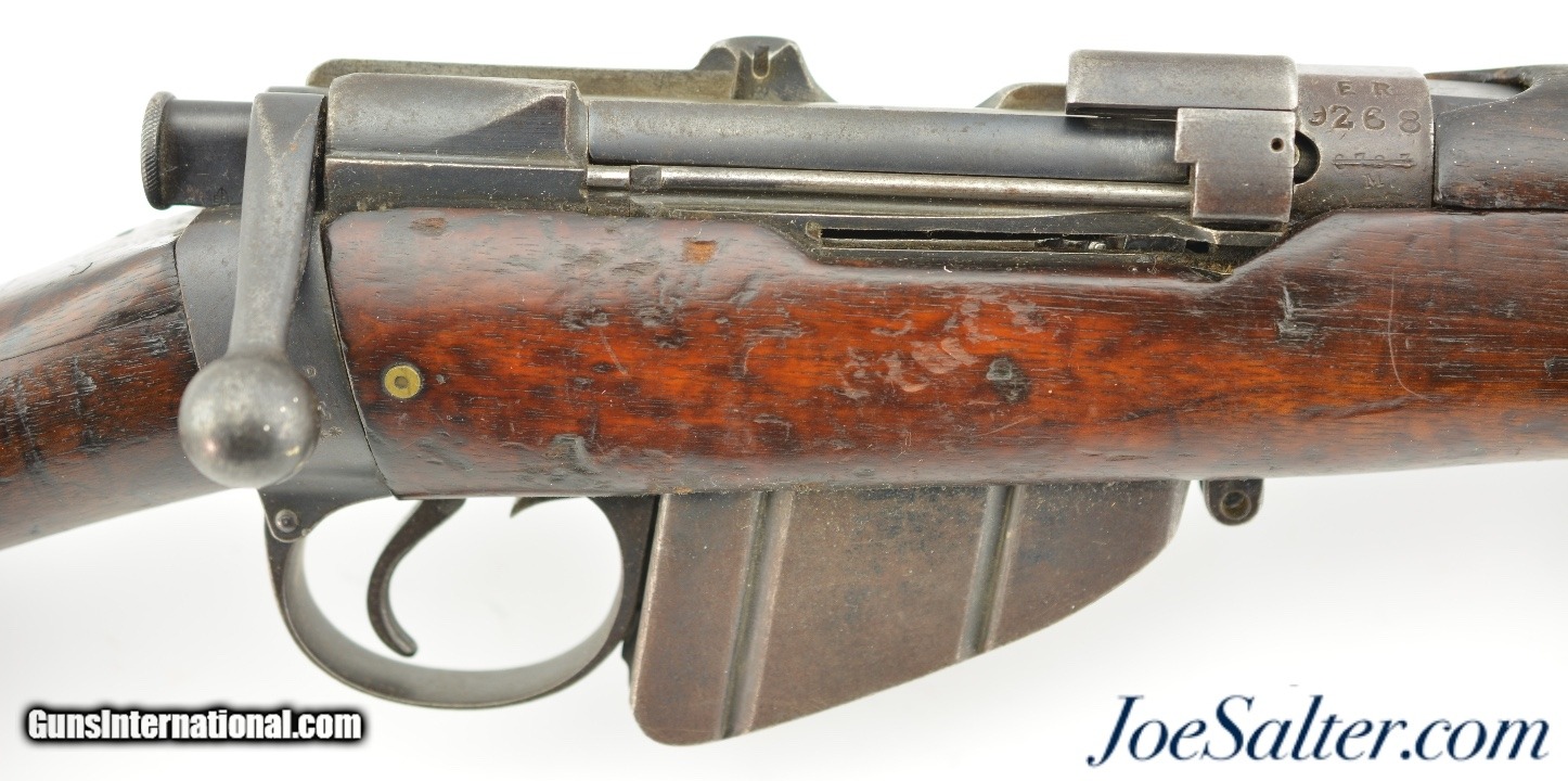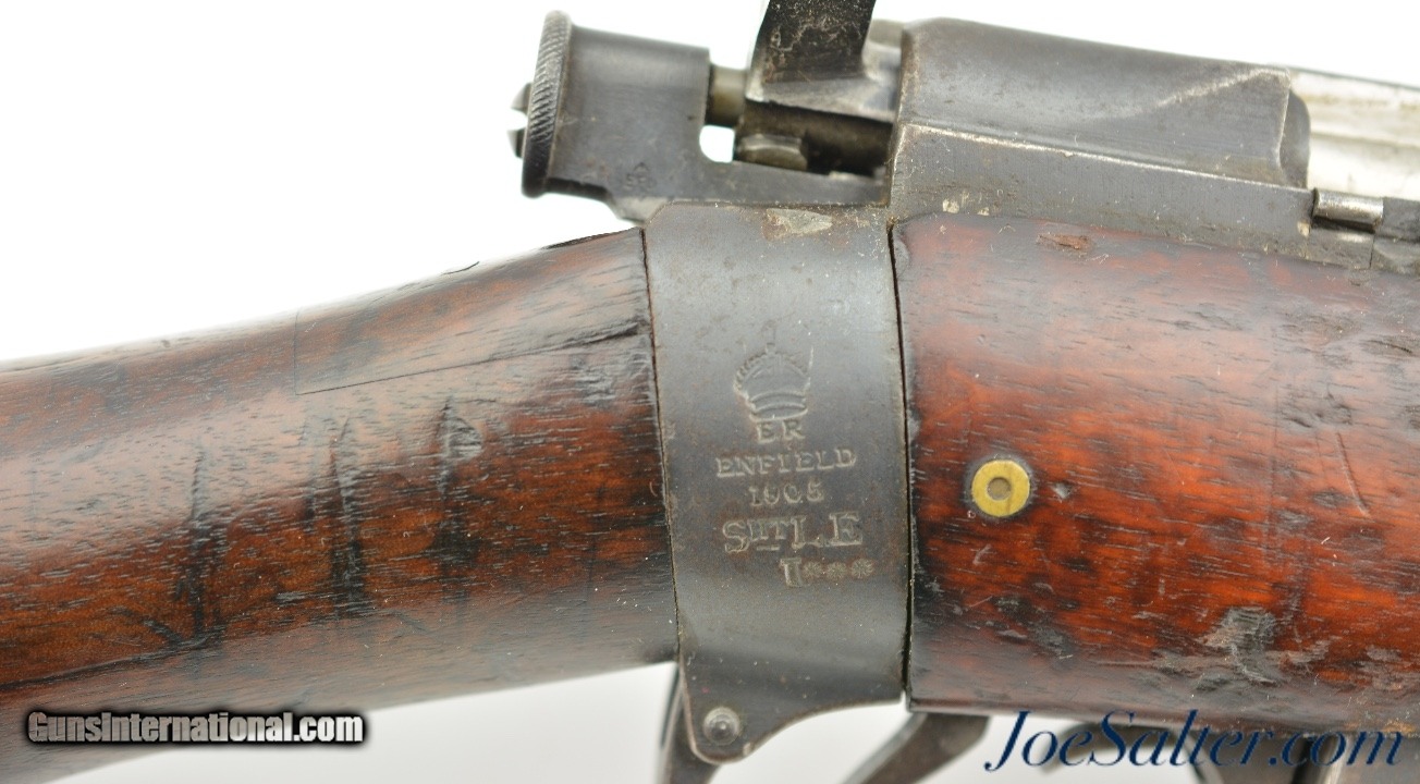 Description: Serial #ER3268, .303 British, 25" barrel with a very good bore that has some minor freckling within the grooves. This is a 1905 dated rifle that retains about 85% plus of the original blue finish with gray fading and mild plum-brown freckling on the balance. The bolt has been armory renumbered to match the rifle and is equipped with the sliding charger guide with some silvering along the bearing surfaces as well. The walnut forend, buttstock, and correct early handguards have an excellent dark added military oil finish over scattered minor handling marks and small surface blemishes throughout. The front volley sight stud is still present but the flip-up rear aperture is no longer installed and the brass stock disk is unit marked ("10.14/3NF/821"). These "ER" prefix guns were updated for the Mk.7 ammunition and sent to Ireland in the early 1920s. About 4000 of these rifles qwere imported into the U.S. in the 1960s-70s. Ref. "The Lee-Enfield - A Century of Lee-Metford & Lee-Enfield Rifles & Carbines" by Ian Skennerton; 2007} FFL or C&R; SOLD Curio/Relic: Yes |