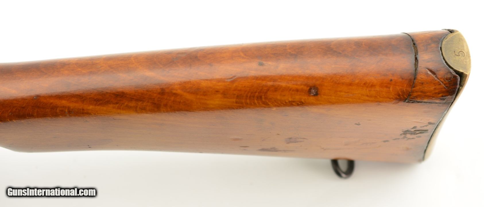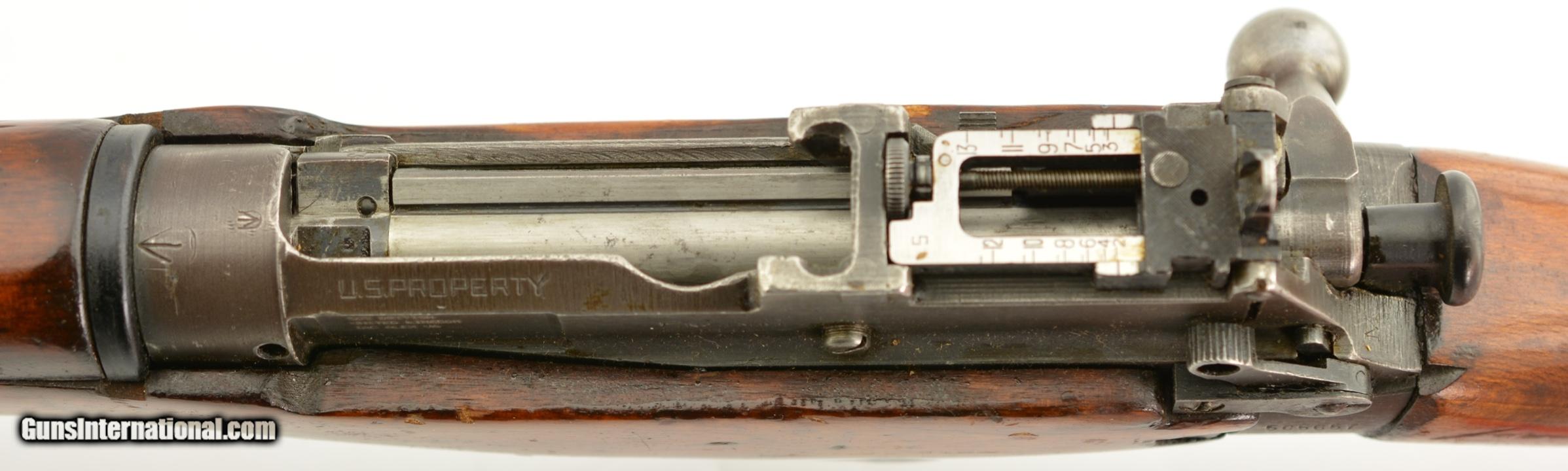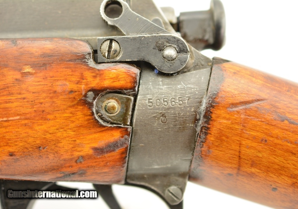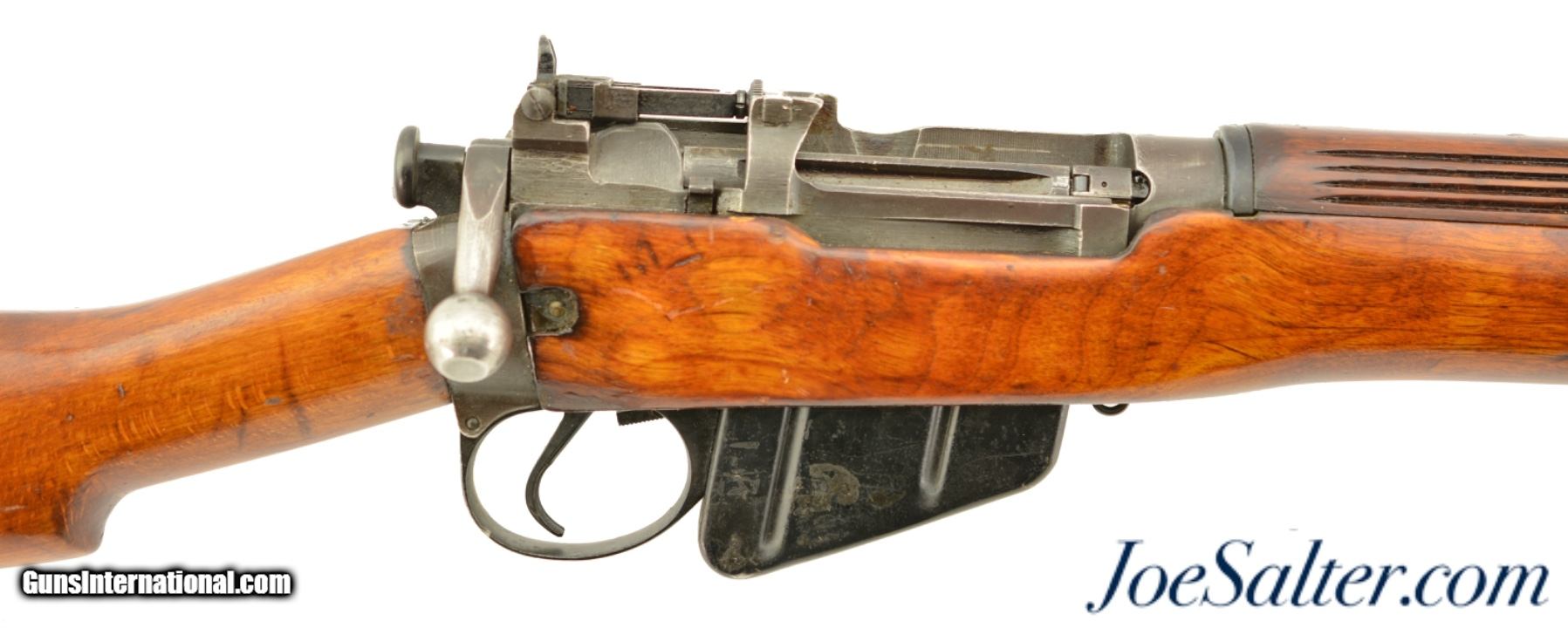 Description: Serial #5C567, .303 British, 25" barrel with a fine, bright bore that has some mild freckling within the grooves. This is a 1942-dated, "US PROPERTY"-marked rifle that has traces of original blue remaining on the receiver and barrel, as well as large areas of a lightly flaked Suncorite finish on the front sight protectors barrel bands, rear sight, and matching numbered magazine (armory renumbered to match). The matching numbered bolt exhibits some further finish loss on the bearing surfaces, and the handle has worn to dark gray underlying metal. The early button-type cocking-piece has a mixed blue and Suncorite finish remaining. The receiver has a small import stamp on the left side, as well as a large "U (Broad Arrow)" Union of South Africa property stamp on the top of the receiver ring. Additionally, an "S"-marked Mk. 1 adjustable rear sight is fitted. The walnut buttstock, matching numbered forend, and handguards are in about good-very good condition with numerous small handling marks scattered about the added slightly glossy varnish finish. This is a very good example of a very early production Savage & Stevens No. 4, with rare South African property markings, and would make a terrific addition to any collection. FFL or C&R SOLD Curio/Relic: Yes |