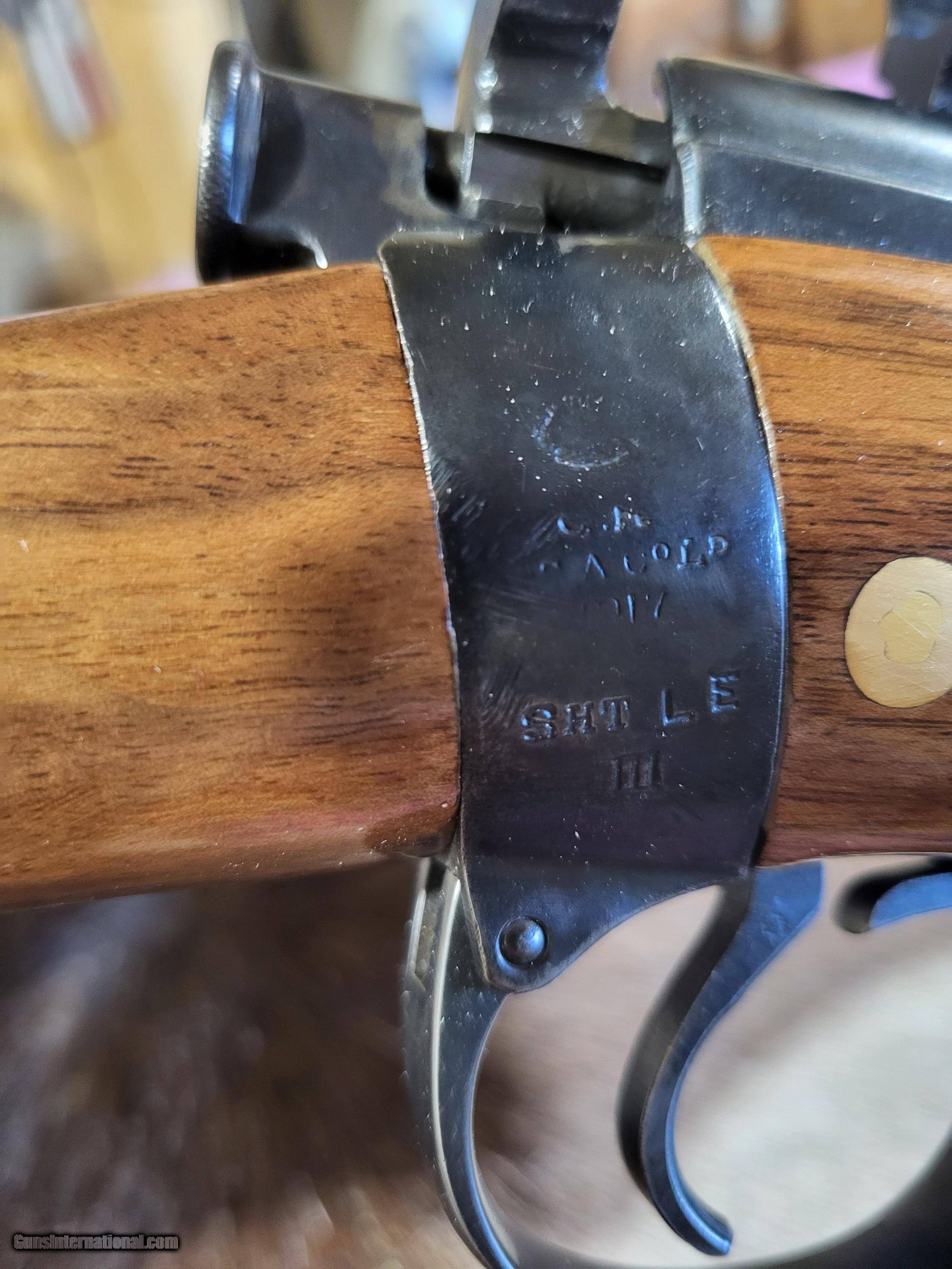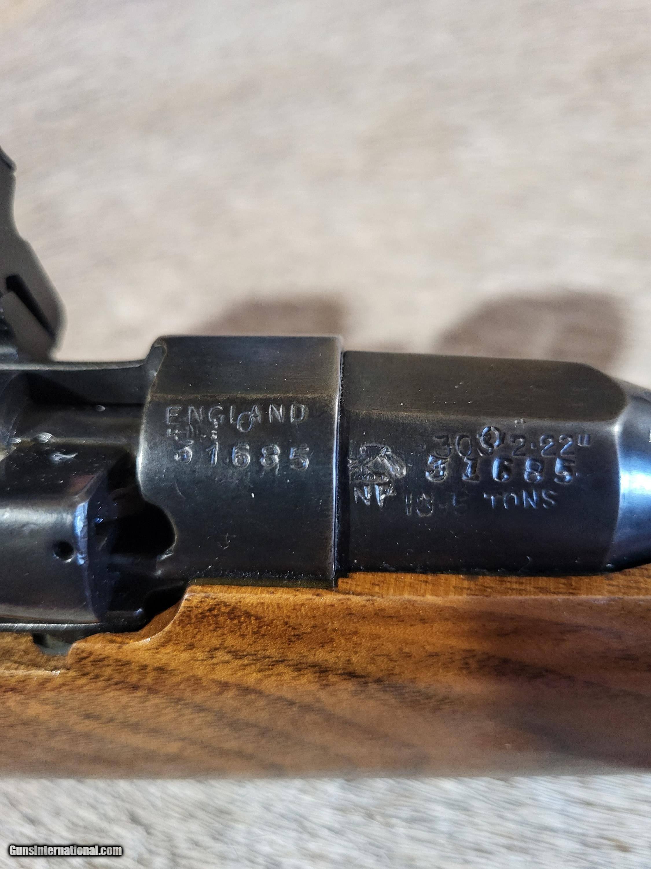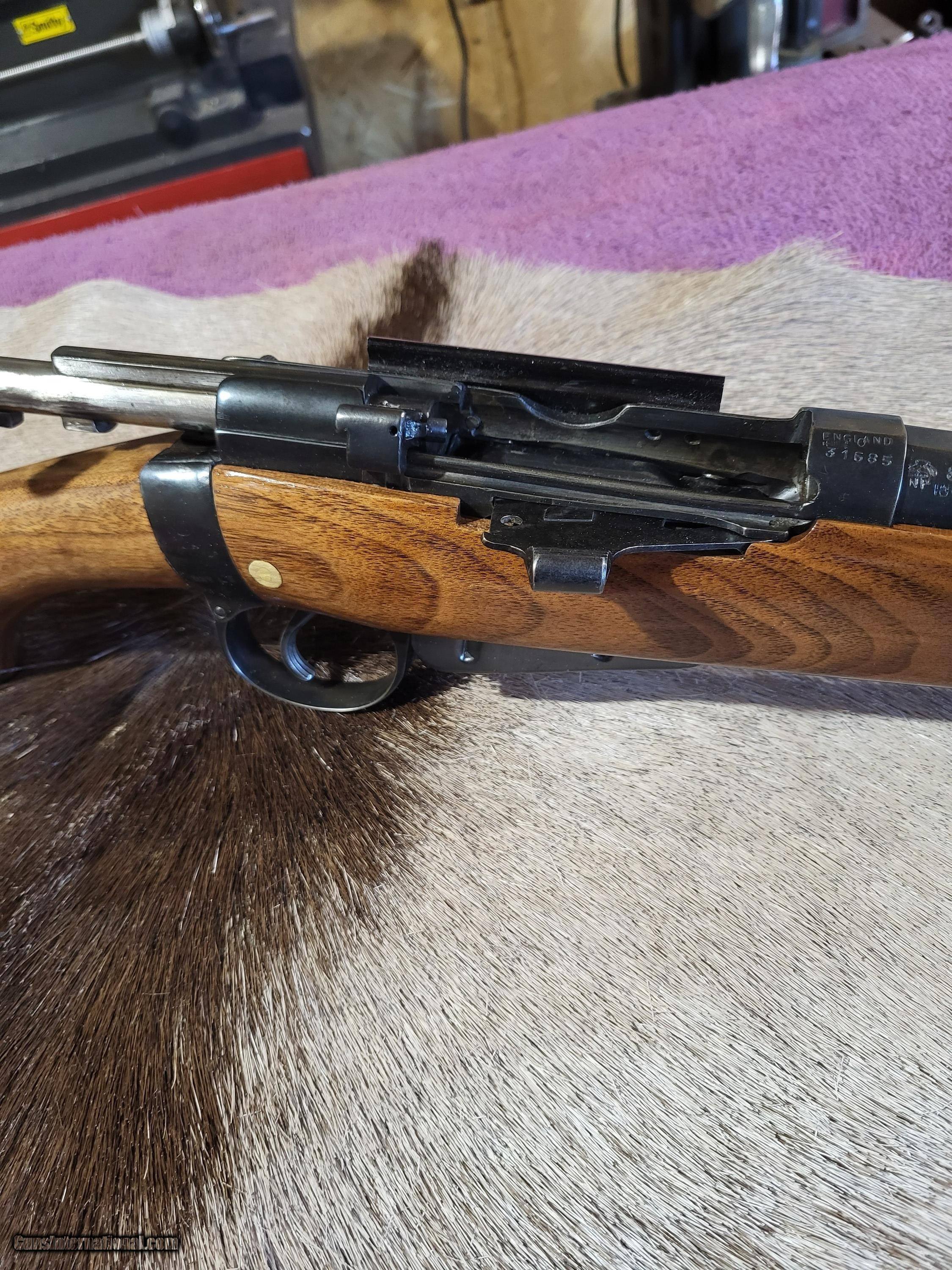 Description: Early (1917) British .303 sporter styled after the famed Lee-Speed used by Col. Patterson to hunt the man-eating lions of Tsavo. Excellent walnut stock. Ebony forearm tip and cap. Custom forearm screw(shown). Very good bore on 25" barrel. Safari style open V with 2 leaves. Rear sight is adjustable for windage. Banded front sight. Barrel band front sling swivel. Detachable weaver #2 scope base and rings. 5 rnd. magazine. Period correct magazine cutoff. Exceedingly accurate with 125 gr.,7.62 bullets as well as heavier. L.O.P. is 13 3/4". Wt. 7.6 lbs. Unloaded. Buyer pays $40 shipping. $575.00 O.B.O. SOLD Rifle Caliber: .303 British Manufacturer: British Model: #1, Mark III Barrel Length: 25 Condition: Very good Metal Condition: Very good Wood Condition: Excellent Bore Condition: Very good Action: Short throw Lee Enfield Butt Pad: Decelerator LOP: 13.75 Weight: 7.6 lbs. Sights: Open and scope mts. Manufacture Date: 1917 |