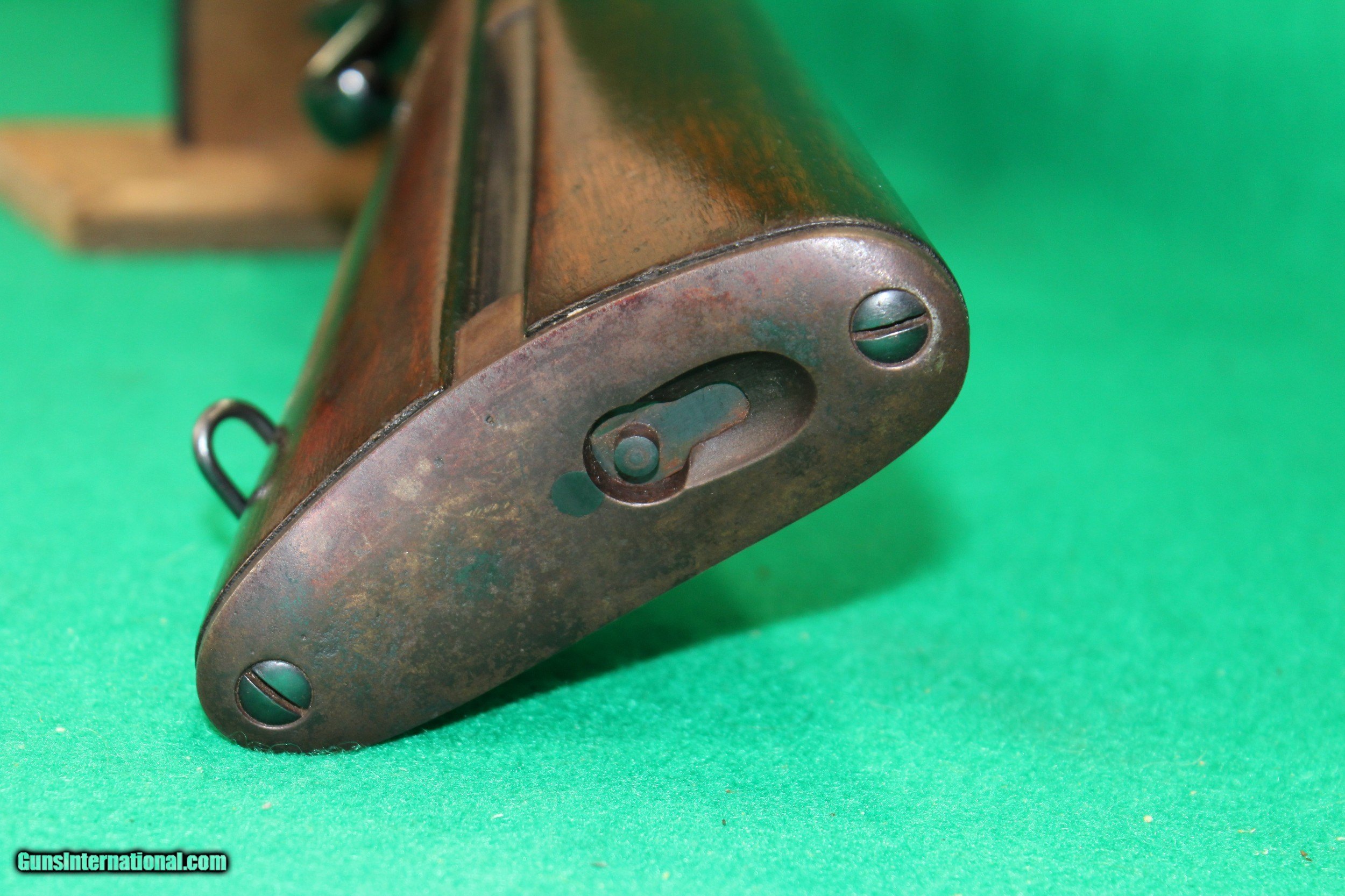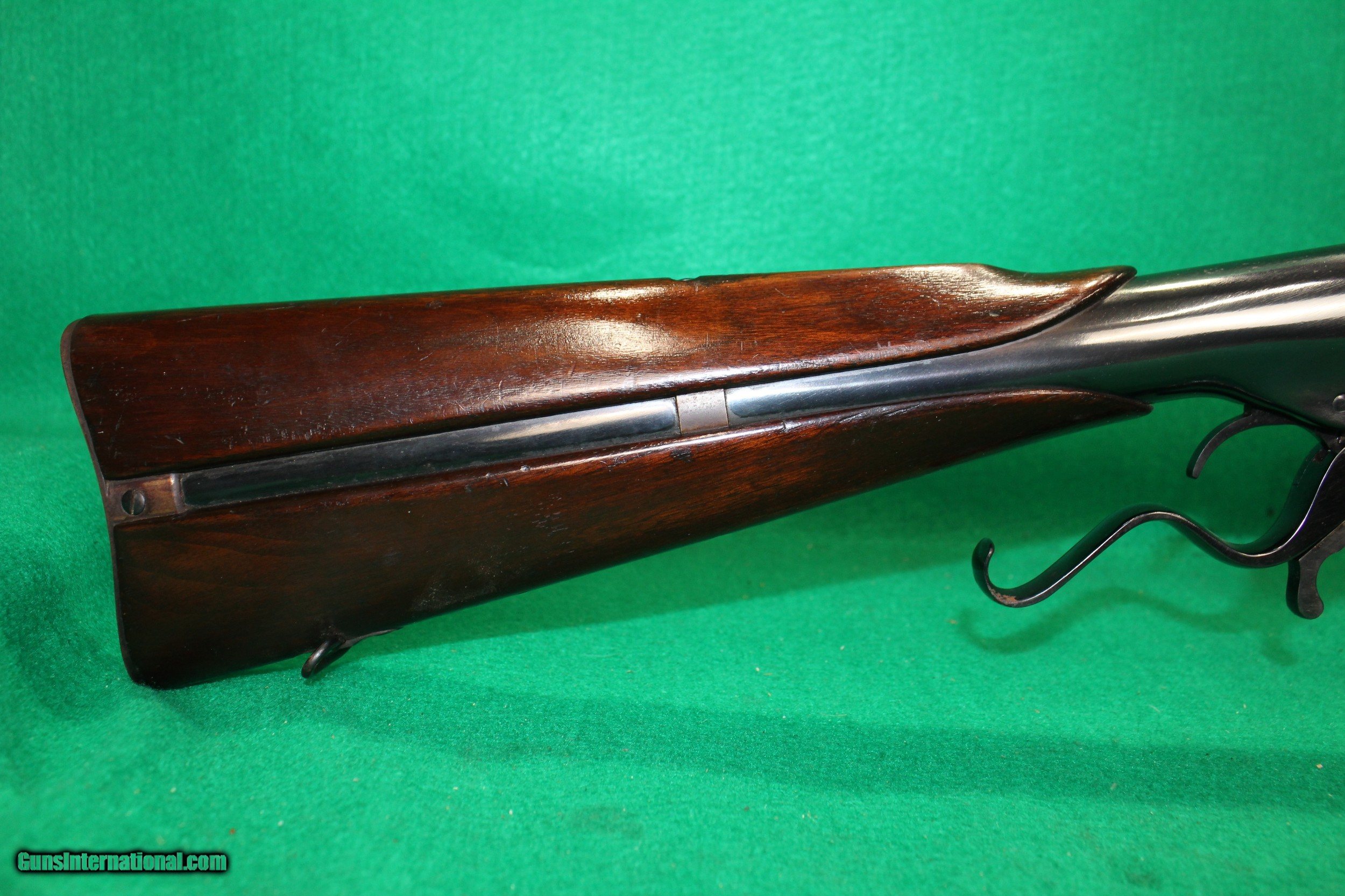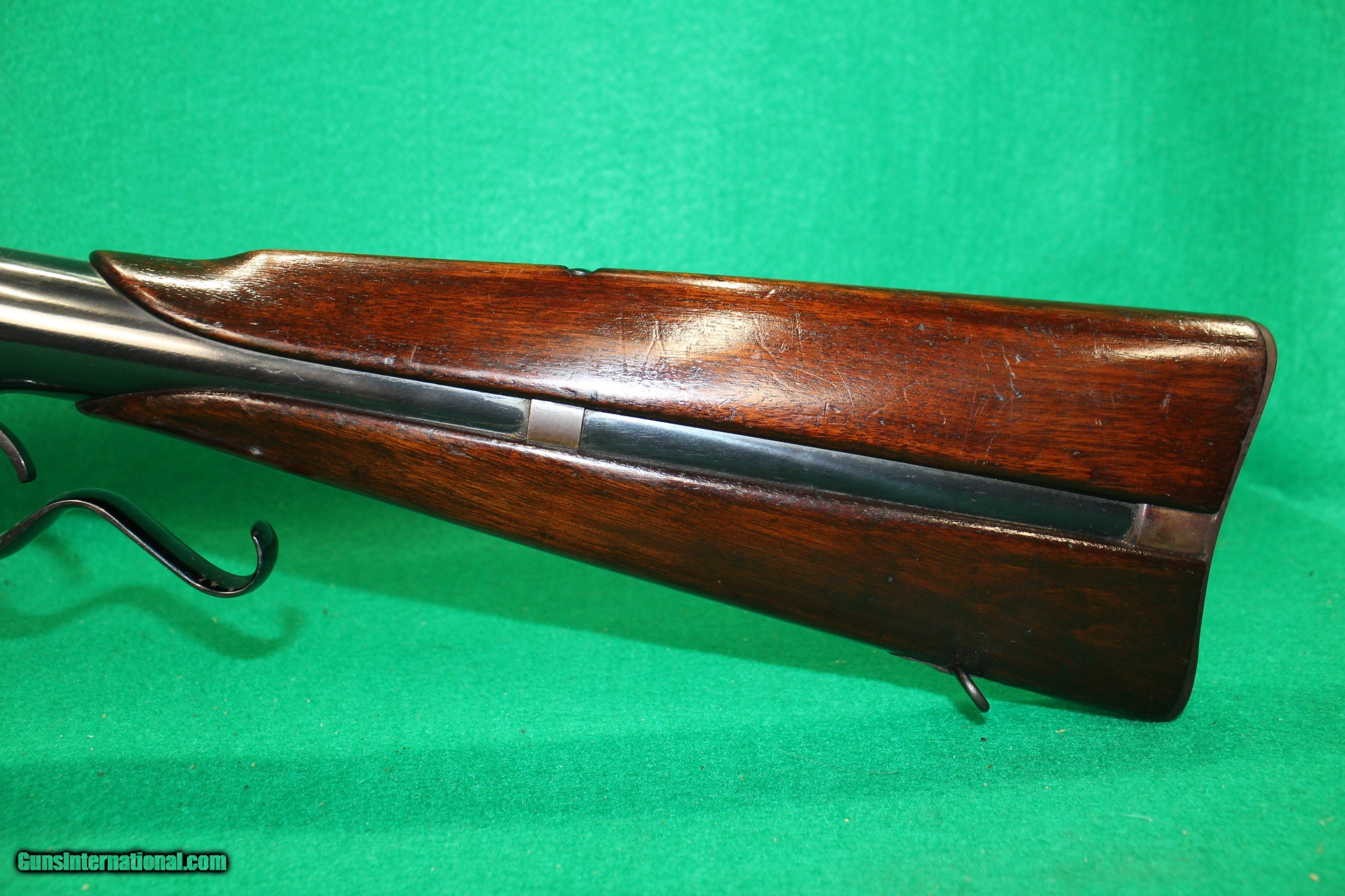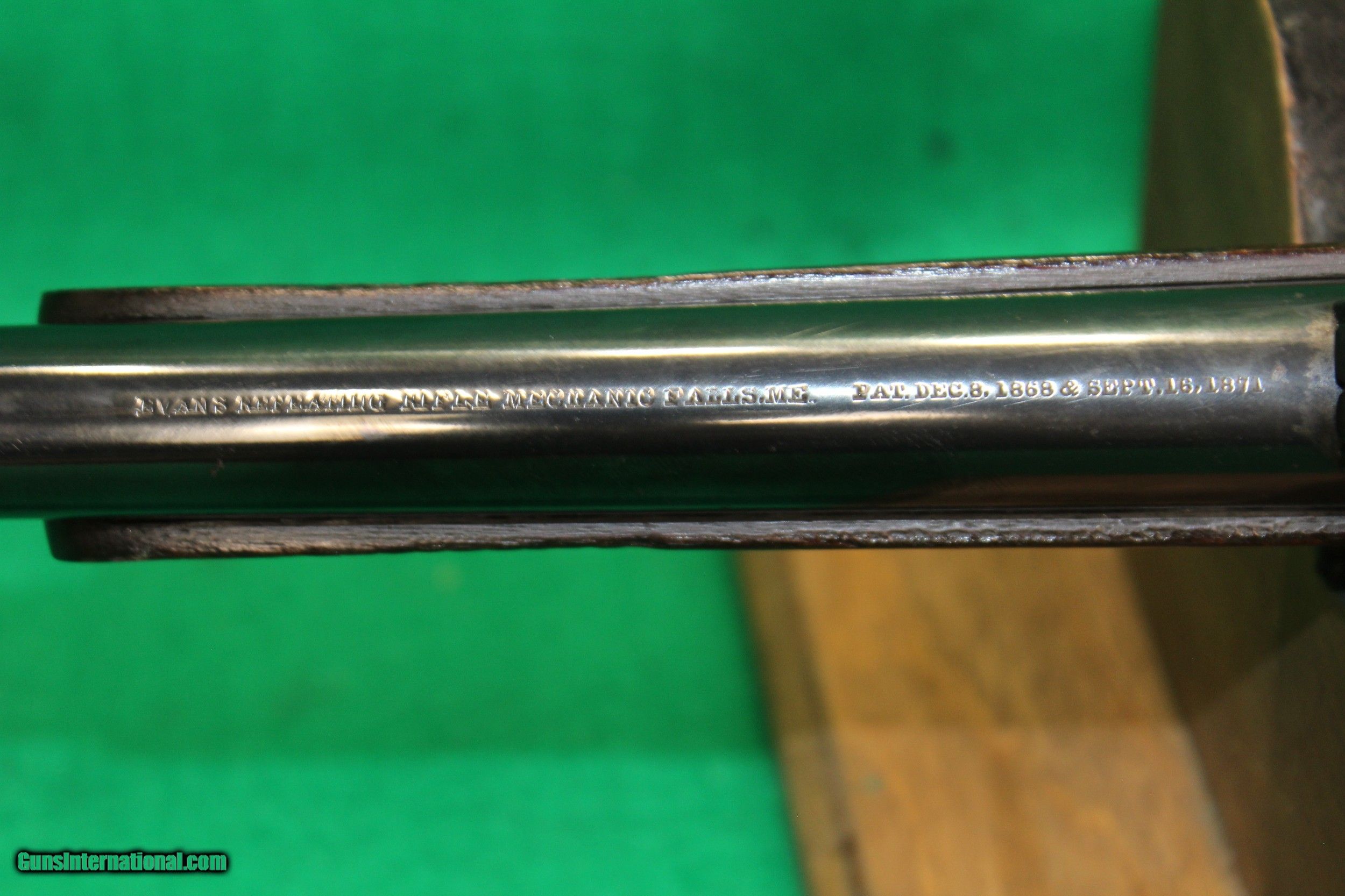 Description: Invented by Warren R. Evans of Thomaston, Maine production started in 1873 by "Evans Rifle Manufacturing Company of Mechanic Falls, Maine." Only 15,000 Evans firearms were manufactured in a six year period and then the company declared bankruptcy in 1879, a victim of the Post Civil War arms industry glut and stiff competition. The Evans has a rotary magazine in the buttstock. Cartridges are fed to the breech by cycling the cocking lever/trigger guard. The magazine tube of the Evans is much larger than that of the Spencer. It holds four rows of cartridges which are loaded through a trapdoor in the buttplate. Each time the action is cycled, the magazine feeds the next cartridge to the breech in the barber pole fashion. New Model rifle, which fires.44 cartridge called the ".44 New Model", which was 1 1/2 inches long. The magazine capacity is 28 rounds. A dust cover for the ejection port to avoid dirt getting into the magazine.The majority of Evans repeaters produced were of the "New Model", and around 4000 carbines with the 22" round barrel were produced. The barrel on this example is marked: EVANS REPEATING RIFLE. MECHANIC FALLS ME. PAT. DEC.8,1867 & SEPT.16,1871 This carbine is in nice condition, and has been fully cleaned and blued. The action functions, and you can see the rotating magazine through the ejection port. The bore is mirror bright with good rifling. The rear sight is adjustable. SOLD |