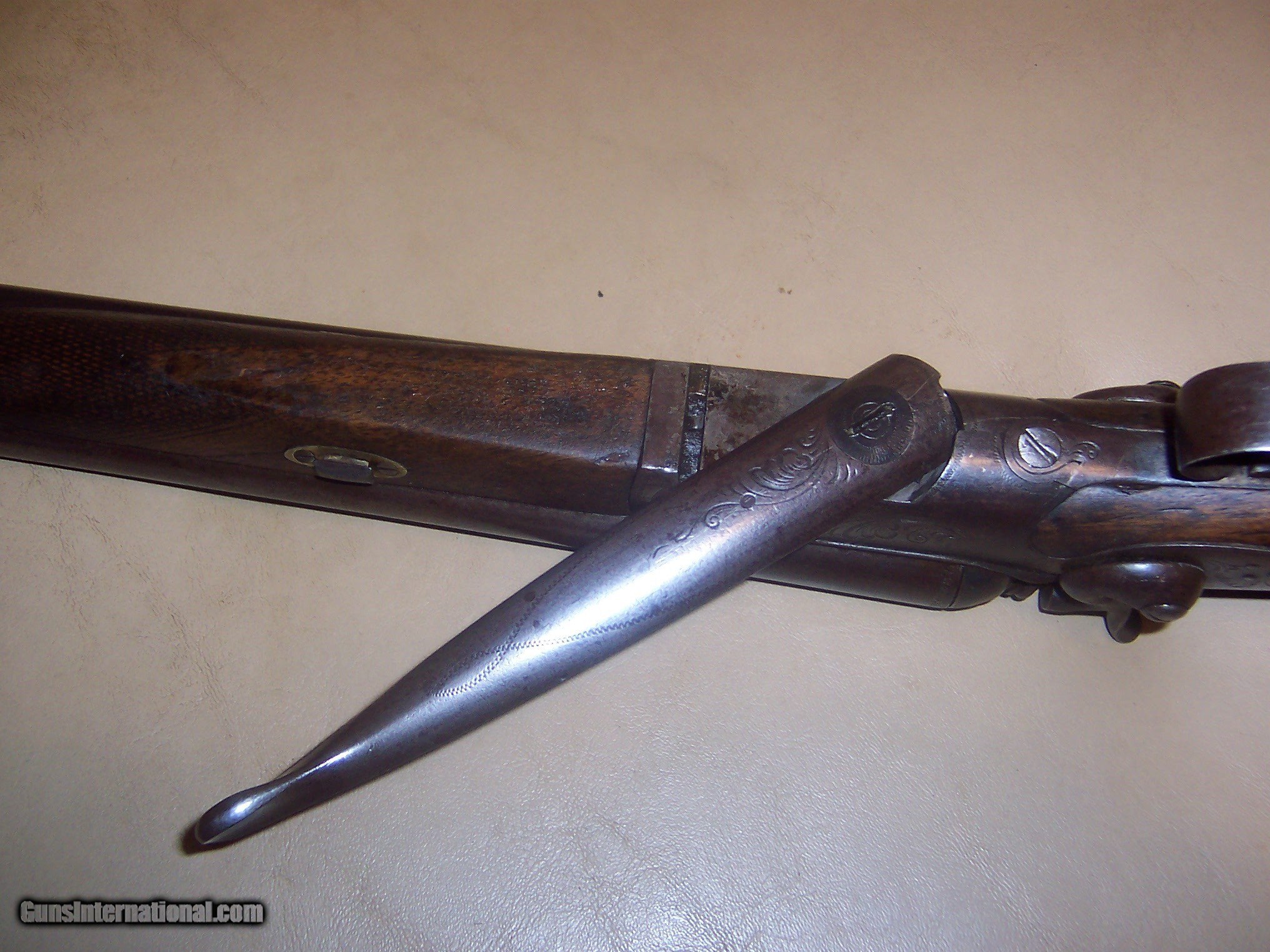 Description: cape gun about 14 gage bore and 32 caliber rifle bores are vg rifle bore is vvg steel barrls with most original blue rest of metal has naturel grey look,, no pitting stock has been revarished but checkering is good rebounding hammers work fine locks up tight minor amount of engraving name on barrel rib SOLD Antique: Yes Manufacturer: ferlach Model: cape gun |