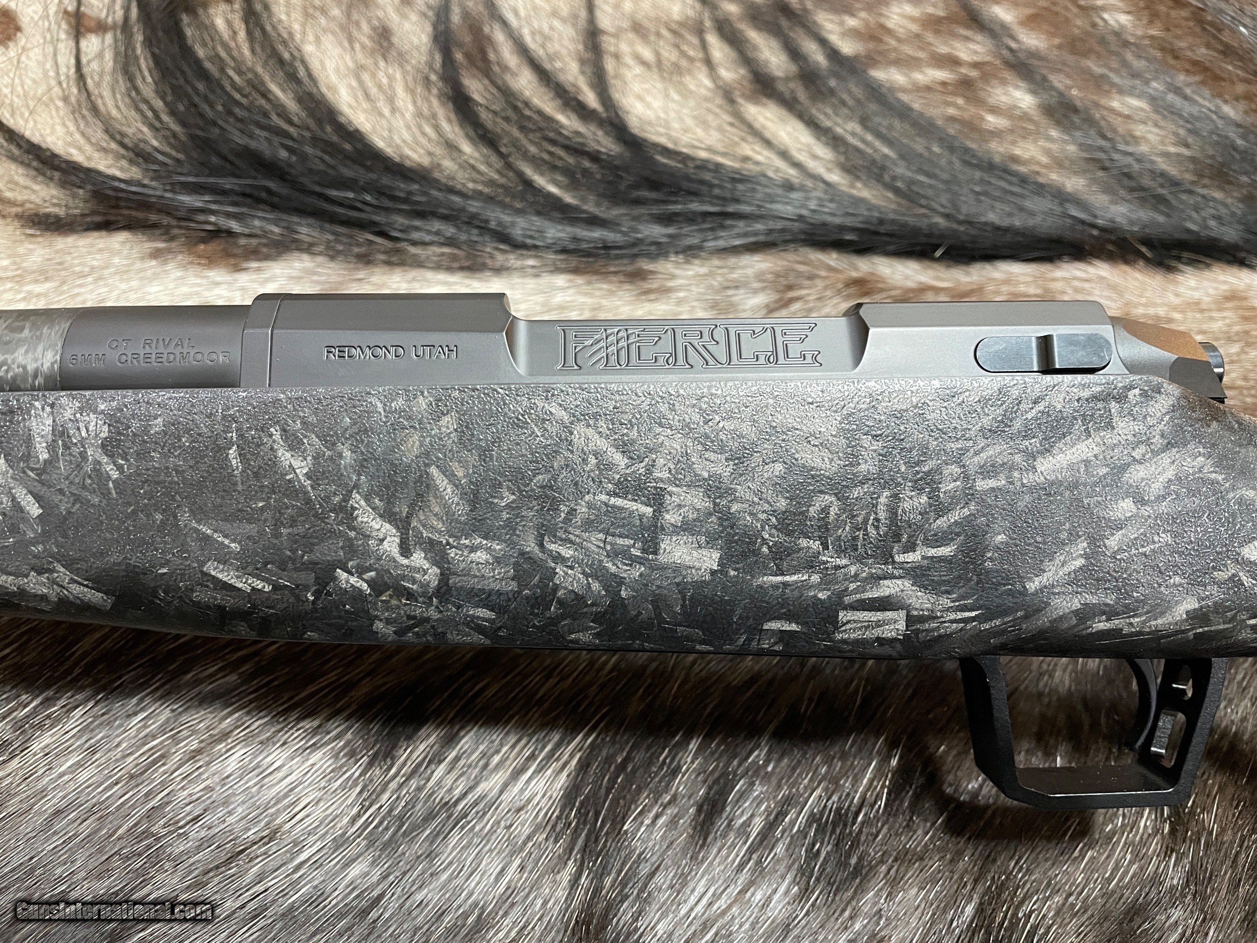 Description: NEW JD OUTFITTERS EXCLUSIVE - FIERCE FIREARMS CT RIVAL RIFLE IN 6mm CREEDMOOR WITH CHOPPED CARBON FIBER STOCK - LAYAWAY AVAILABLE. THIS LIMITED PRODUCTION FIERCE RIFLE COMES WITH A CUSTOM-DESIGNED "CHOPPED CARBON FIBER" STOCK AND FLOORPLATE ENGRAVING. THIS UNIQUE RIFLE IS MADE EXCLUSIVELY FOR, AND SOLD ONLY, BY JD OUTFITTERS. GET YOURS WHILE YOU CAN! FREE AFRICAN SAFARI WITH KUCHE SAFARIS (: KUCHE.CO.ZA) INCLUDED WITH THIS RIFLE! SAFARI IS FOR 1-HUNTER / 5-DAYS / 3-ANIMALS (IMPALA, BLESBUCK, WARTHOG). SAFARI IS CUSTOMIZABLE WITH ADDITIONAL DAYS AND ANIMALS AVAILABLE. THE CERTIFICATE IS GOOD FOR 3-YEARS FROM DATE OF PURCHASE AND WILL BE EMAILED TO YOU. NOTE: THE SAFARI IS FREE AND DOES NOT ADD ANY COST TO THE RIFLE. BUY A SCOPE AND RINGS/BASES FROM JD OUTFITTERS AND RECEIVE FREE MOUNTING. FEATURES OF THIS GREAT AMERICAN MADE BOLT ACTION RIFLE INCLUDE: