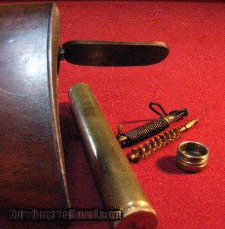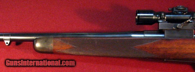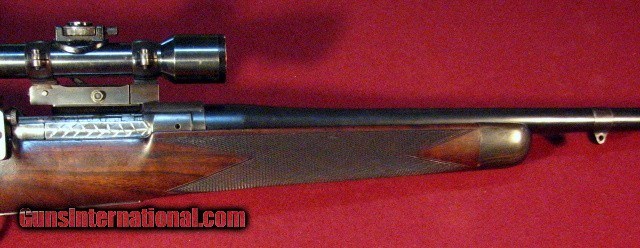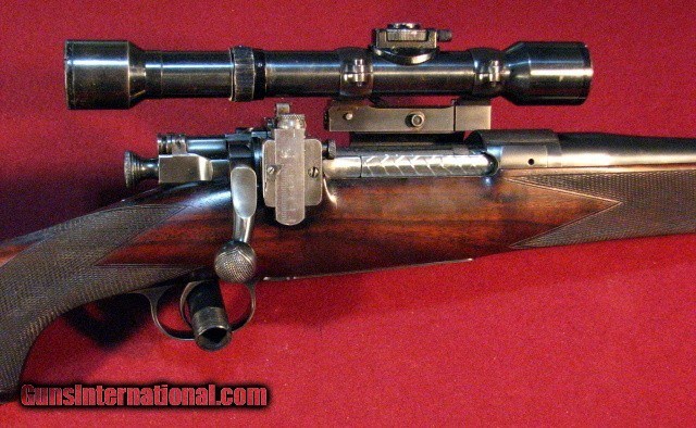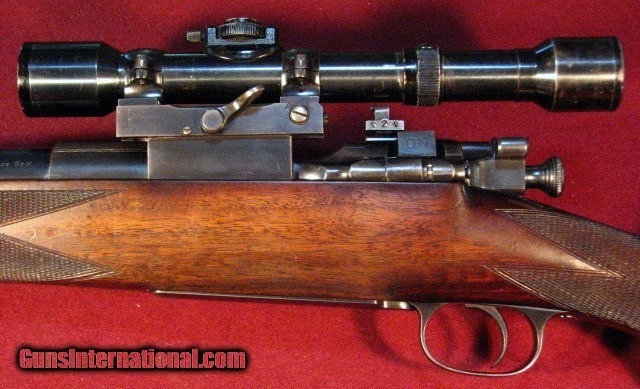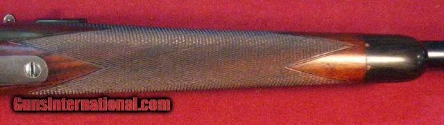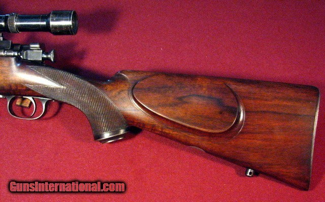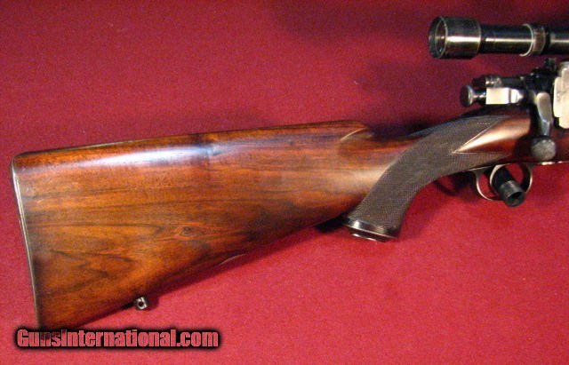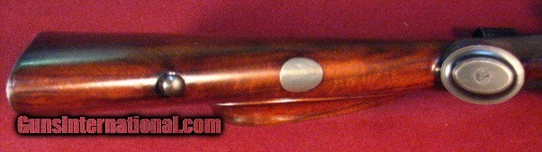 Description: Griffin & Howe 30-06 built on a Sprinfield action circa 1934 with a 22" barrel with banded ramp front sight and banded sling stud. Bore is excellent. Action features a Lyman 48 receiver peep sight with 125' slide and single lever windage adjustable G&H sidemount with 1931 patent date holding a Hensodt Wetzlar Zielvier 4X scope with clear optics. Two panel bolt knob checkering and a checkered trigger face. Stocked in European Walnut with a pancake cheekpiece, point pattern checkering, steel grip cap, and horn forend tip. Vacant brass stock oval. LOP is 13 3/4" to a checkered and engraved trap buttplate containing a cleaning kit and room for two extra cartridges. Weighs in at 9lb 1oz as scoped. This is an outstanding example of early 20th century American gunmaking by the premier gunmaker of that era and remains in all original and unmolested condition. Excellent value. SOLD |