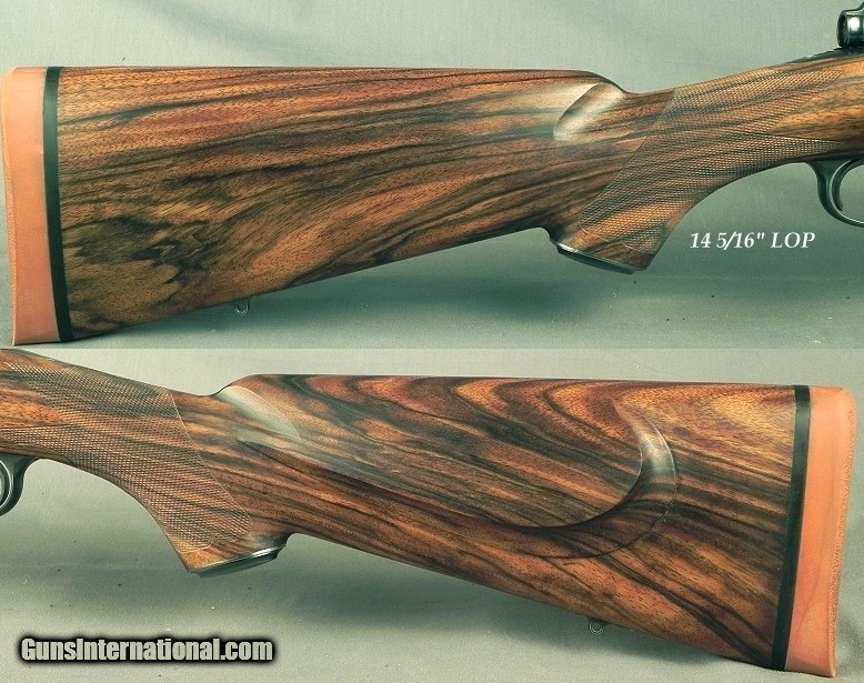 Description: #559165, Jim Kobe, Bloomington, Minnesota: A Super Nice 9.3 x 62 Mauser on a Pre-64 Model 70 Action, The action was made in 1962, 23" barrel, No open sights, Very nice profiled 2 piece scope bases set up to take the detachable Talley rings, Blackburn straddle hinged floorplate with a center bow release, A 3-position Model 70 wing safety, Model 70 trigger, Action rails inside and out are polished, Built-up & checkered bolt stop release, Profiled rear receiver tang like a pre-war Model 70 with a blind rear guard screw hole at the top of the tang, A classic style stock, Full wrap around point pattern checkering, Shadowline cheekpiece, Ebony forend tip, Double screw sling eyes on the stock, Jerry Fisher 2 screw steel grip cap, 14 5/16" LOP over a 1" pad, 8 lbs. 1 oz., An excellent piece of English Walnut with a lot of black/brown contrast that carries the entire length of the stock, The original satin rust blue remains at 99%, The original stock finish at 99%, The checkering is at 100%, The bore is brand new. This is a very well-built custom bolt rifle with excellent metal and woodwork with true classic lines. It comes to hand with ease and feels like a part of you. Jim Kobe operates as Jim's Custom Gunworks in Bloomington, Minnesota, he specializes in accuracy work, action trueing, barreling, Sako extractors and of course custom stocks. He absolutely knows right from wrong. SOLD Rifle Caliber: 9.3x62mm |