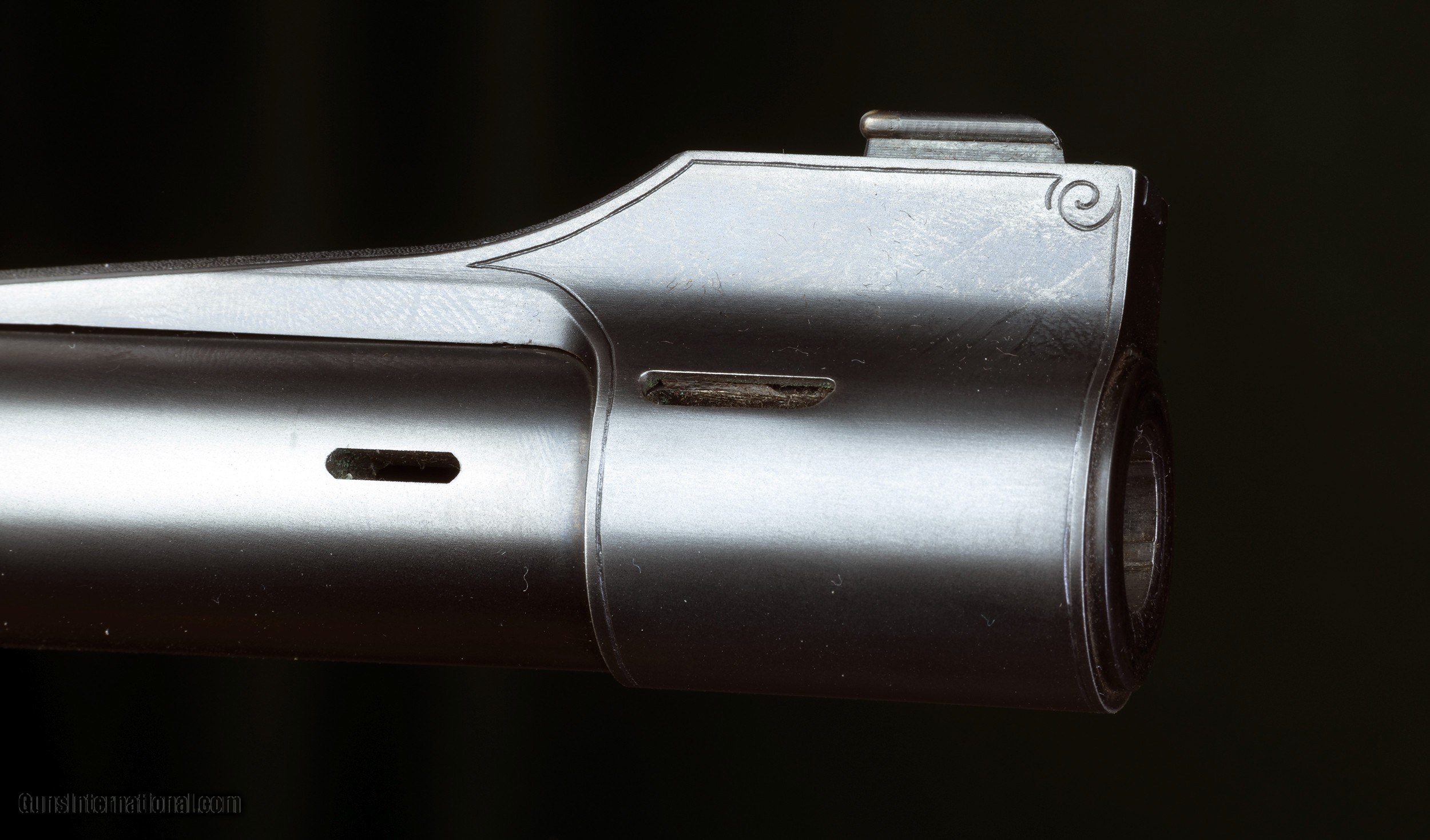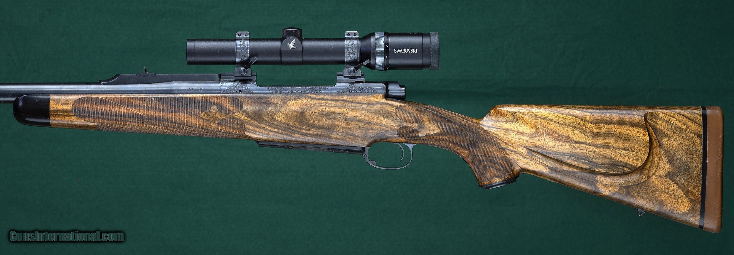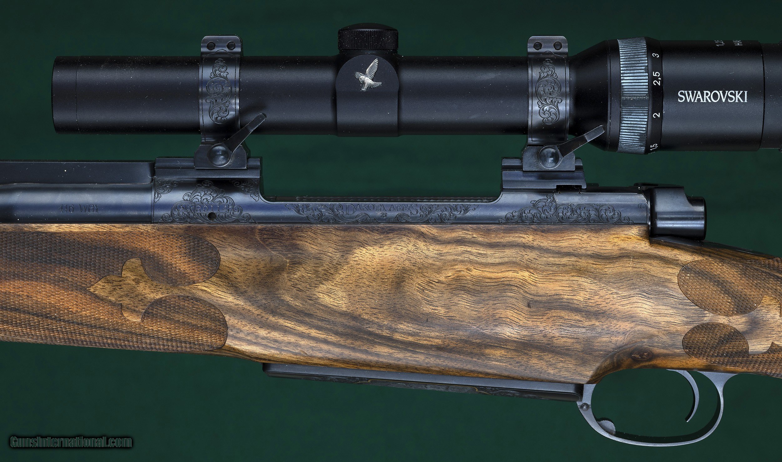 Description: 23" Marquart tapered round barrel with full-band front sight, Magnaporting, full-band swivel base, integral recoil lug, and matted quarter rib with 1 standing gold-lined express sight. Fully figured Moroccan walnut stock with ebony forend tip, tie-down escutcheon, 26-LPI wrap-around ribbon and fleur-de-lys checkering, steel trapdoor pistol grip cap, gold initial oval, classic comb, beaded cheekpiece, inletted rear swivel and solid brown Decelerator recoil pad. Dakota 76 Magnum action with lapped and jeweled bolt and follower, 3-panel checkered bolt knob, Model 70-type safety, and drop box magazine with hinged straddle floorplate and release inside triggerguard. Scroll engraving on action grip trapdoor, triggerguard and floorplate enhanced with a grey-etched, gold-bordered bull elephant, by Marty Rabeno. Swarovski 1.25-4x24 Habicht scope with 30mm tube and CD-1 duplex reticle in Wisner quick-detachable rings on Talley bases. Finish work by Pete Mazur. Pull: 14 3/8". Weight 10lbs, 10 1/2oz with open sights; 11lbs, 12oz, scoped. Trigger let-off: 3 1/4lbs. Built 2008. 99%+ blue. Excellent bore. SOLD Rifle Caliber: .416 Weatherby Magnum Manufacturer: Keith Heppler Model: Custom Dakote Model 76 --- .416 Weatherby Magnum Serial Number: R0114 Barrel Length: 23 Stock: Fully figured Morrocan walnut LOP: 14 3/8 Rib: Matted quarter rib with 1 standing gold-lined express sight Weight: 11lbs, 12oz, scoped. Sights: Full-band front sight; standing gold-lined express rear sight Item Location: Livingston, Montana |