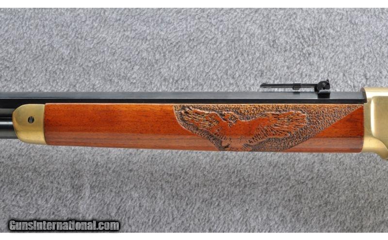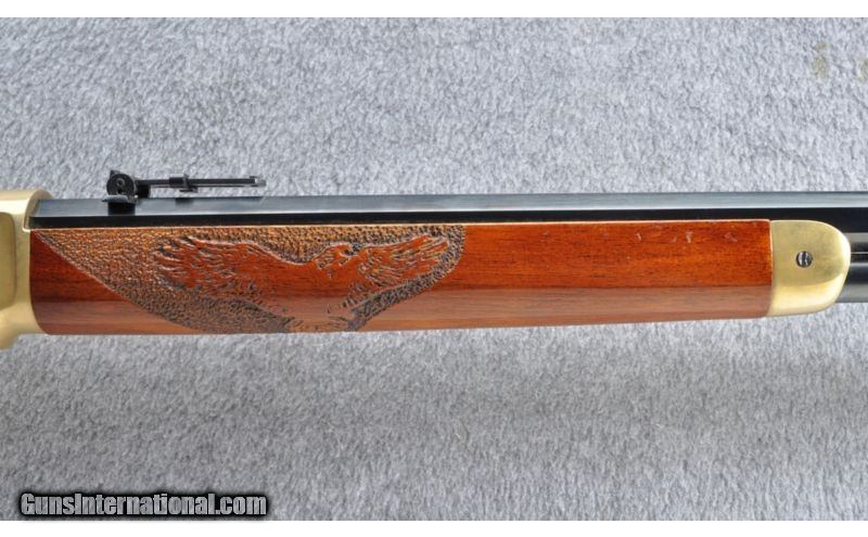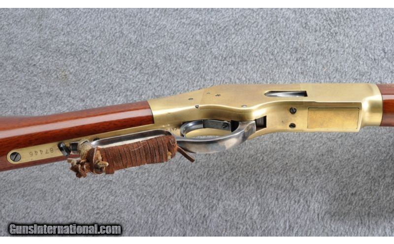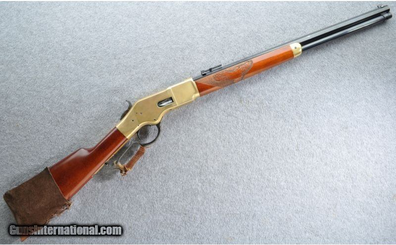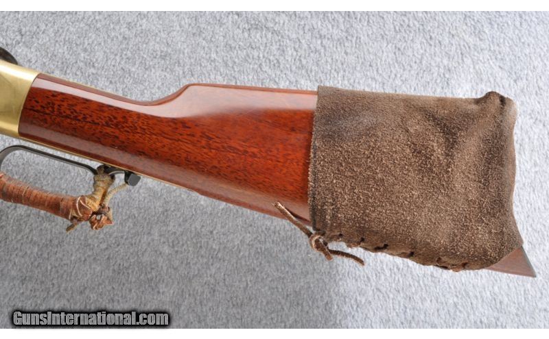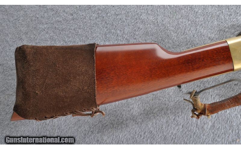 Description: Great cowboy action carbine SOLD Caliber Info: .38 S&W Special Metal Condition: The brass receiver show some minor scratches & marred screw heads. The magazine cap also exhibits some marring. The lever shows good case color with leather wrapping. Wood Condition: Wood is in very good condition Bore Condition: Bright & sharp Barrels: 21" Octagonal Stock: Uncheckered straight grip Stock Dimensions: 13" LOP Fore End: Showing a folk art stippled bird of prey on each side, with brass fore end tip Butt Pad: Metal crescent with leather cover Weight: 8 lbs 8 oz Sights: Blade front & flip-up Ladder rear Item Location: Grand Junction, CO |