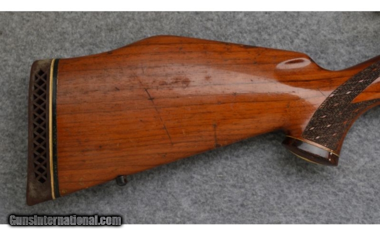 Description: Good condition overall with handling wear over the entire firearm. Manufactured in West Germany for Weatherby. SOLD Manufacturer: Circa: 1959 to1973 Caliber Info: .300 Weatherby Magnum Metal Condition: Good Wood Condition: Good Bore Condition: Good Barrels: 26 Stock: Skipline Checkered Deluxe Walnut in the Weatherby Style Stock Dimensions: LOP: 13 1/4 Fore End: Rosewood Tip Butt Pad: Ventilated Recoil Pad Weight: 9 lbs. 9 ozs. Sights: Redfield 3-9x Widefield Scope with Range Finder Item Location: Hamburg, PA |