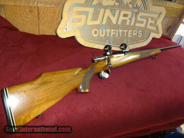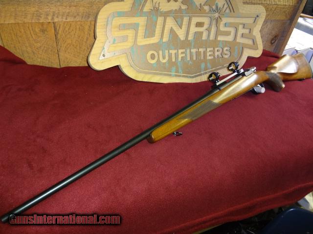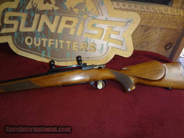 Description: F.N Custom rifle in 7mm mag, 24" barrel, with redfield one piece base and mediudm rings. Adjustable trigger. Really nice straight grain walnut stock that is checkered. Has a black pachmayr rifle soft plate. The barrel and action has a soft matte finish. The floor plate and trigger guard are the only areas that are not perfect. It appears to have been painted instead of blued, as it is of alloy. Overall a really nice commercial Mauser sporter. SOLD |