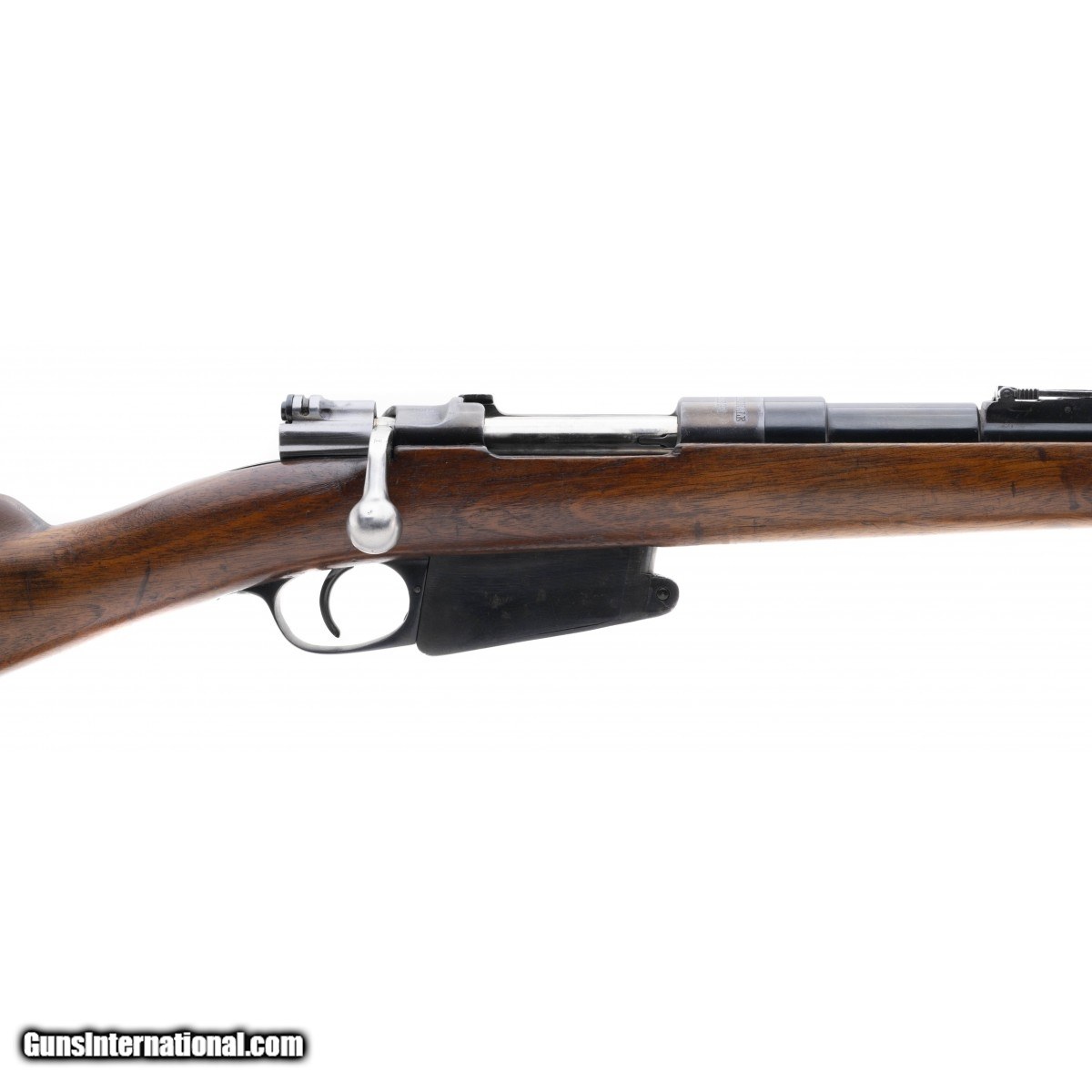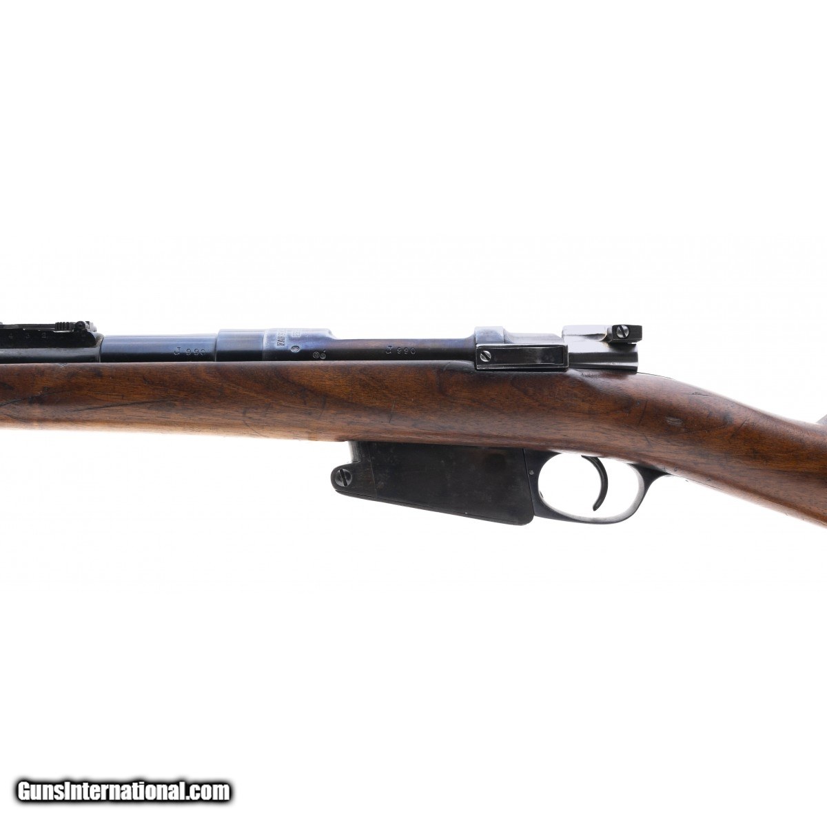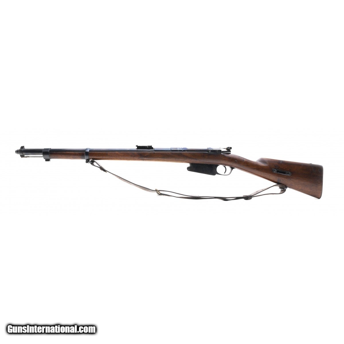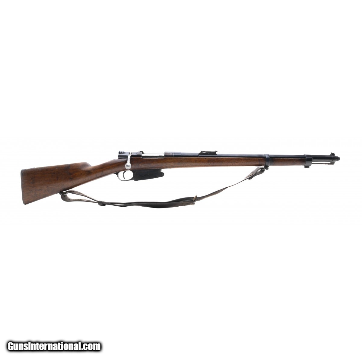 Scarce early model Mauser carbine made by FN for the Belgians. The bolt is mismatched, the barrel, receiver and magazine all match. The barrel has been refinished, the rest of the gun is original. The bore is very good, etched dark with strong rifling. The stock shows typical wear, overall very good condition.