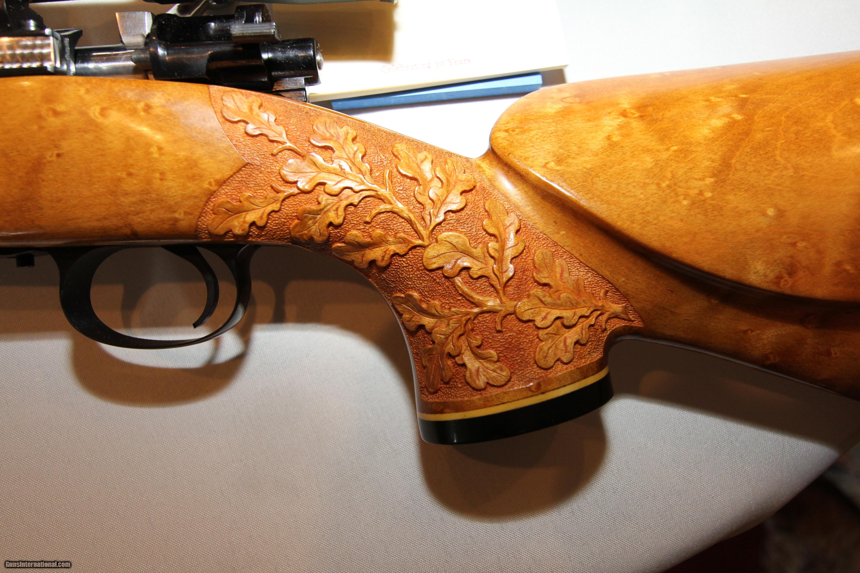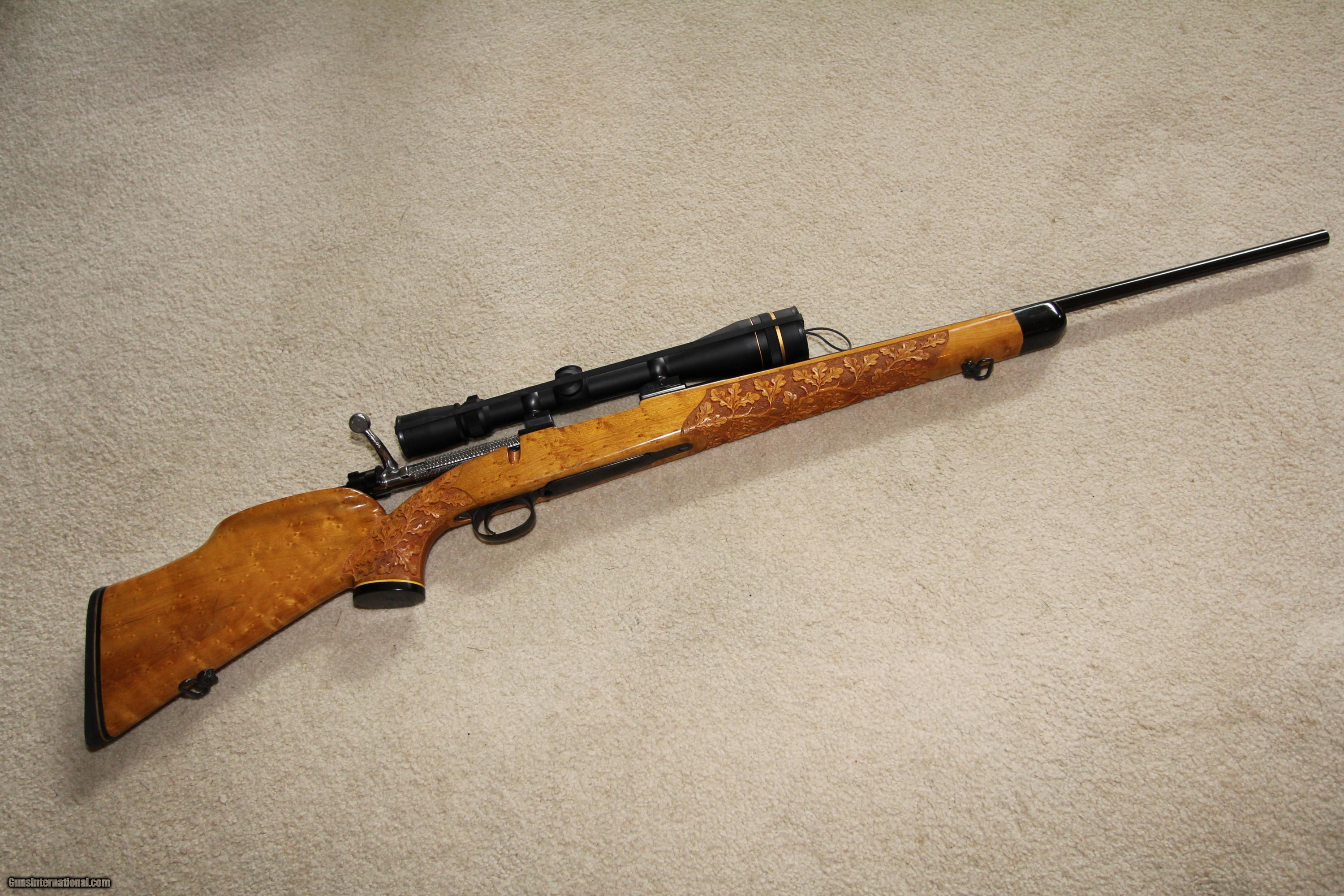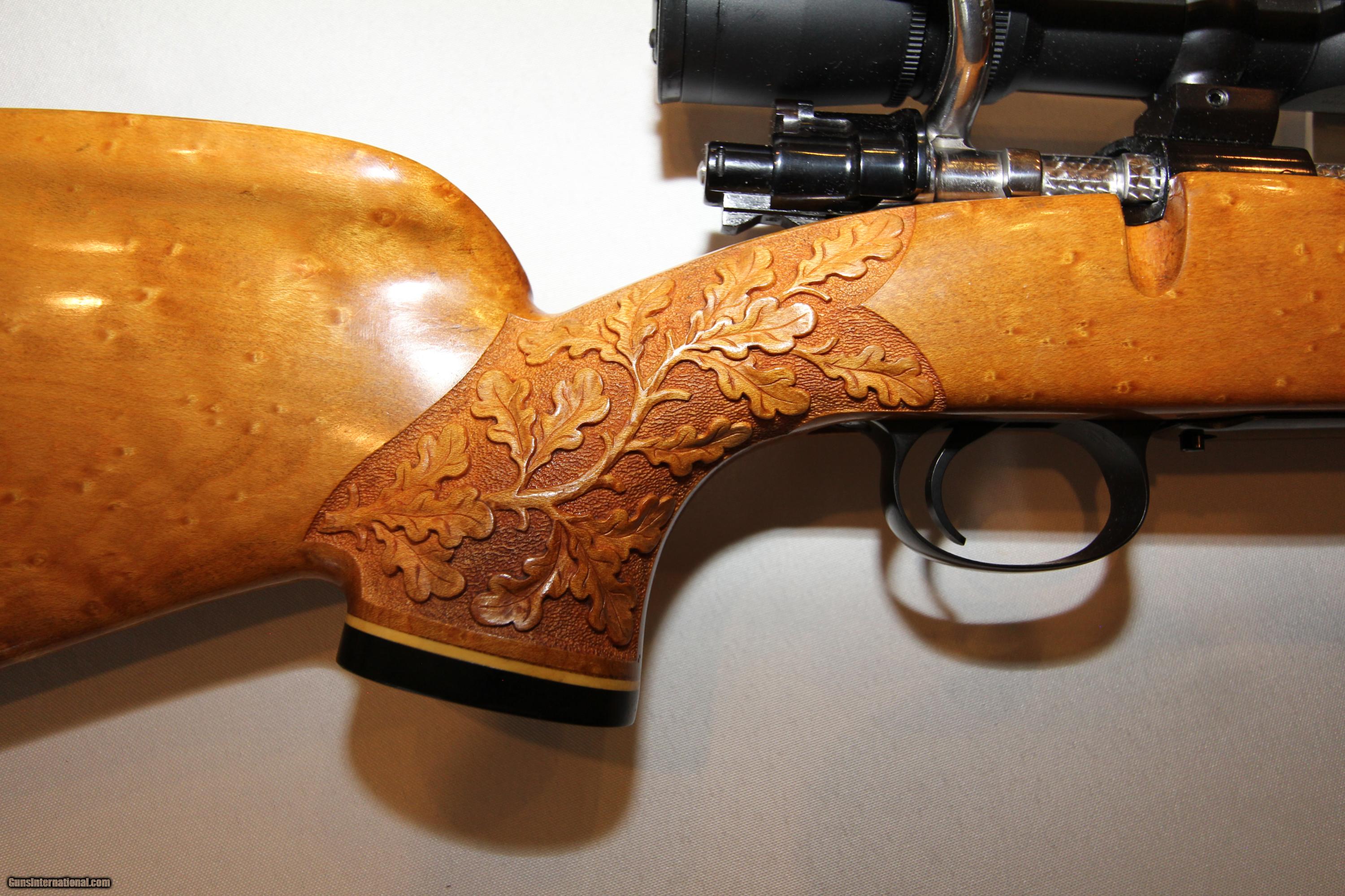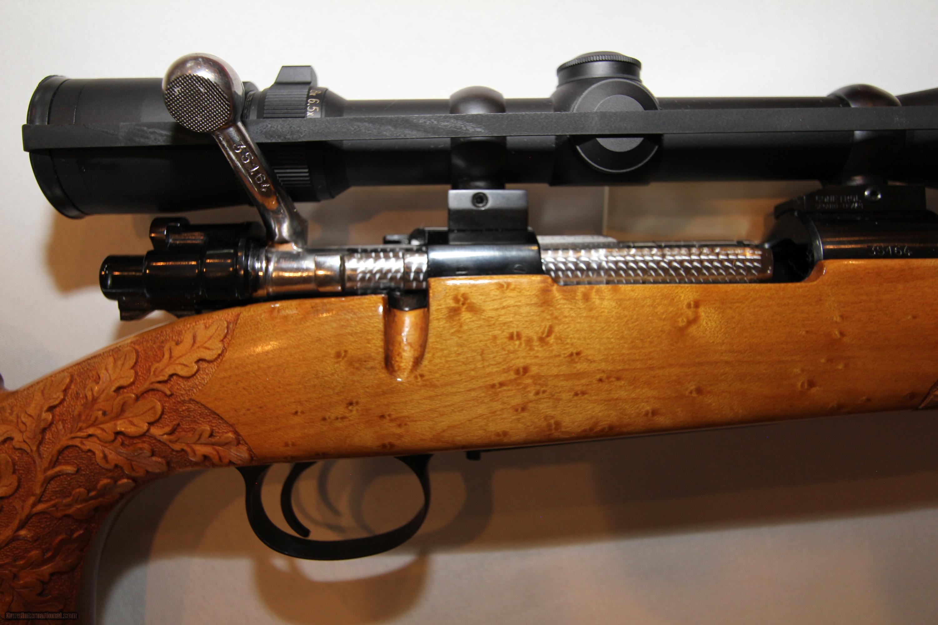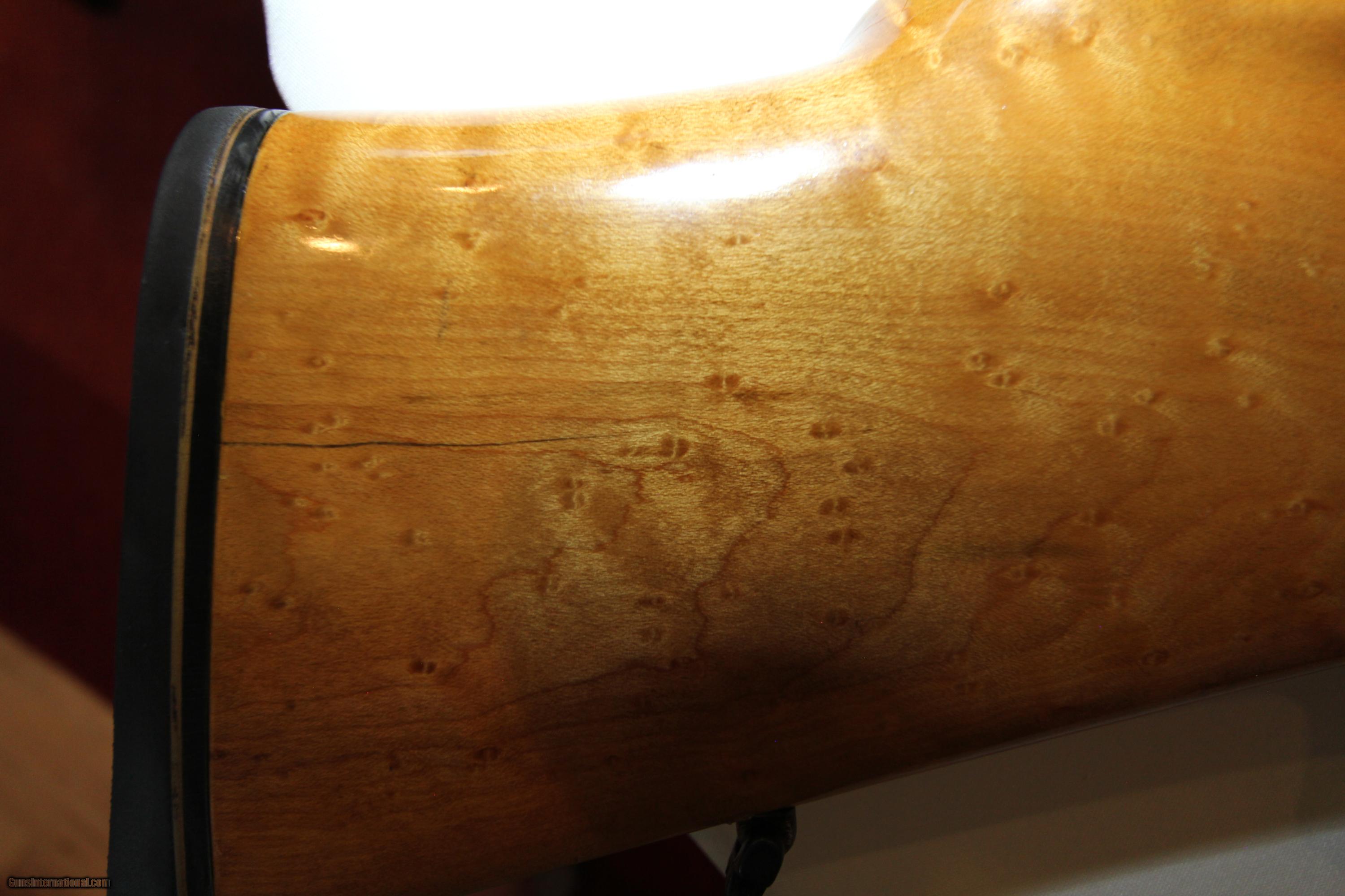 Description: SALE PENDING Fabrique National, Herstal Belgium Barreled Action in 220 Swift. This remarkable custom rifle is equipped with a Mauser Long Action with a Jeweled bolt, claw extractor, and bolt release. It is stocked in Birds Eye Maple with Ebony fore-end and pistol grip caps. The stock is well carved with VERY Germanic Oak Leaves and Branches at the pistol grip and fore arm. The fit and finish on this rifle is well above average. The bore is in very good condition with lands and grooves easily seen. Without a doubt, this rifle was built in Europe by an old school crafts person, right down to the Rammstein Rod and Gun Club butt pad. Unfortunately, somewhere along the line, the butt stock acquired a 2 and 1/2" hairline crack, as seen in the pictures. I believe that the crack is "fixable" by a good gunsmith and I believe it is probably shootable as well. But, you should seek the opinion of a trusted gunsmith!!! The rifle is wearing a Leupold VX-III, 6.5X20X40MM with duplex reticle scope Mounted in Conetrol mounts and rings. If this gun did not have this crack, the price would be much higher. I rate this rifle at 90% wood and 95-96% metal. No California sales, sorry. We offer a 3 day NON-FIRING inspection period with return (at buyers expense). Shipping, Insurance and Packaging will be at actual cost. This gun, as with all used guns should be inspected by a trusted gunsmith before firing. SOLD |