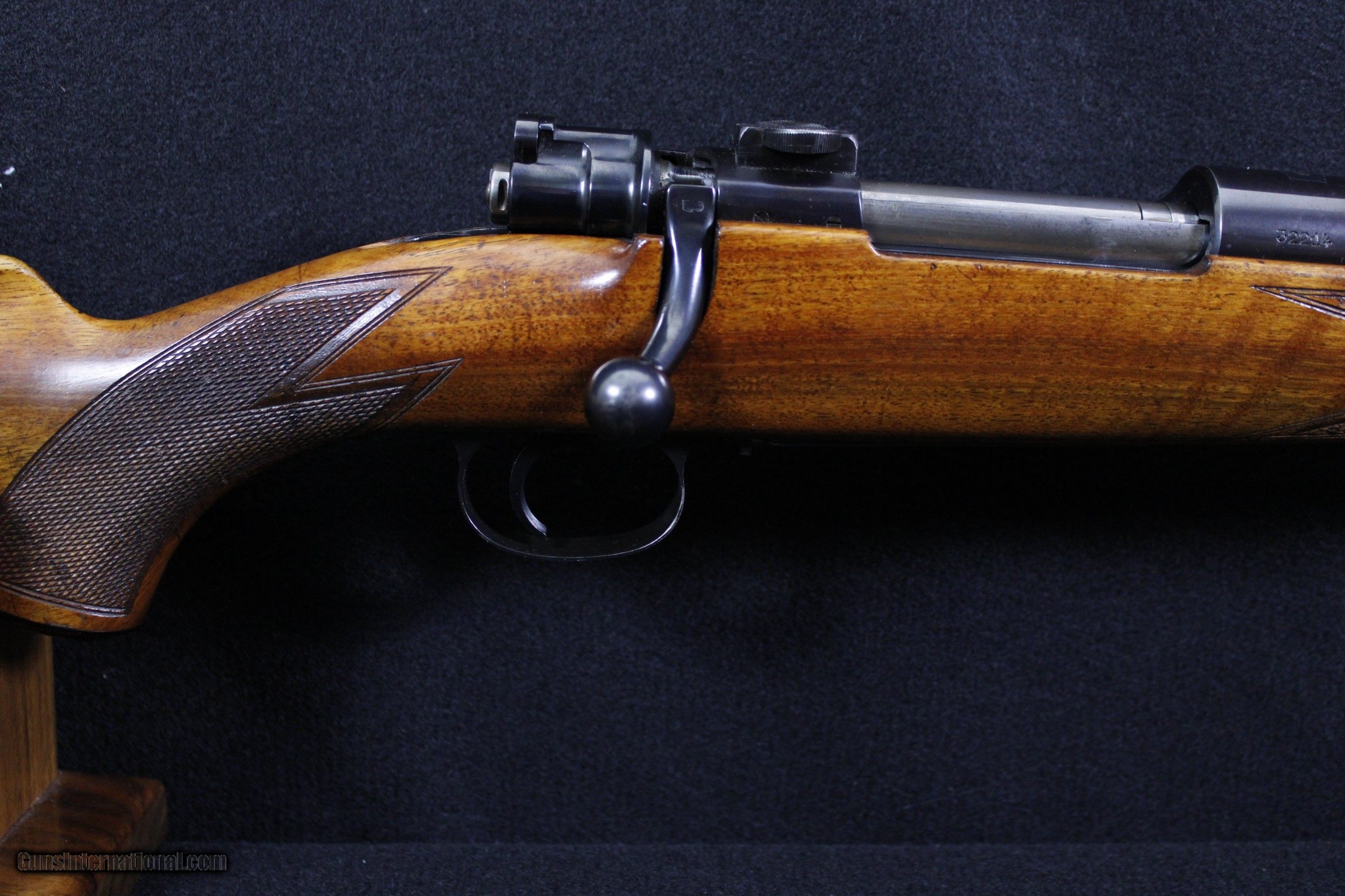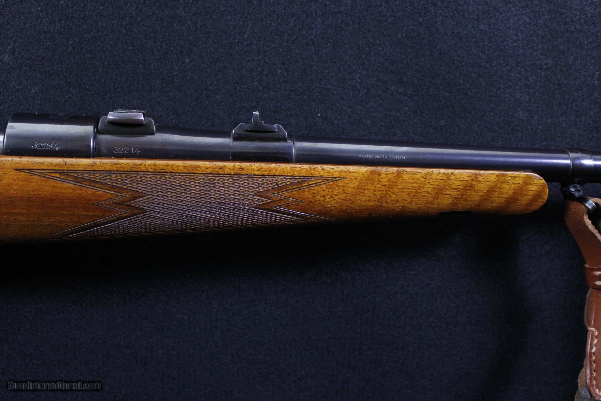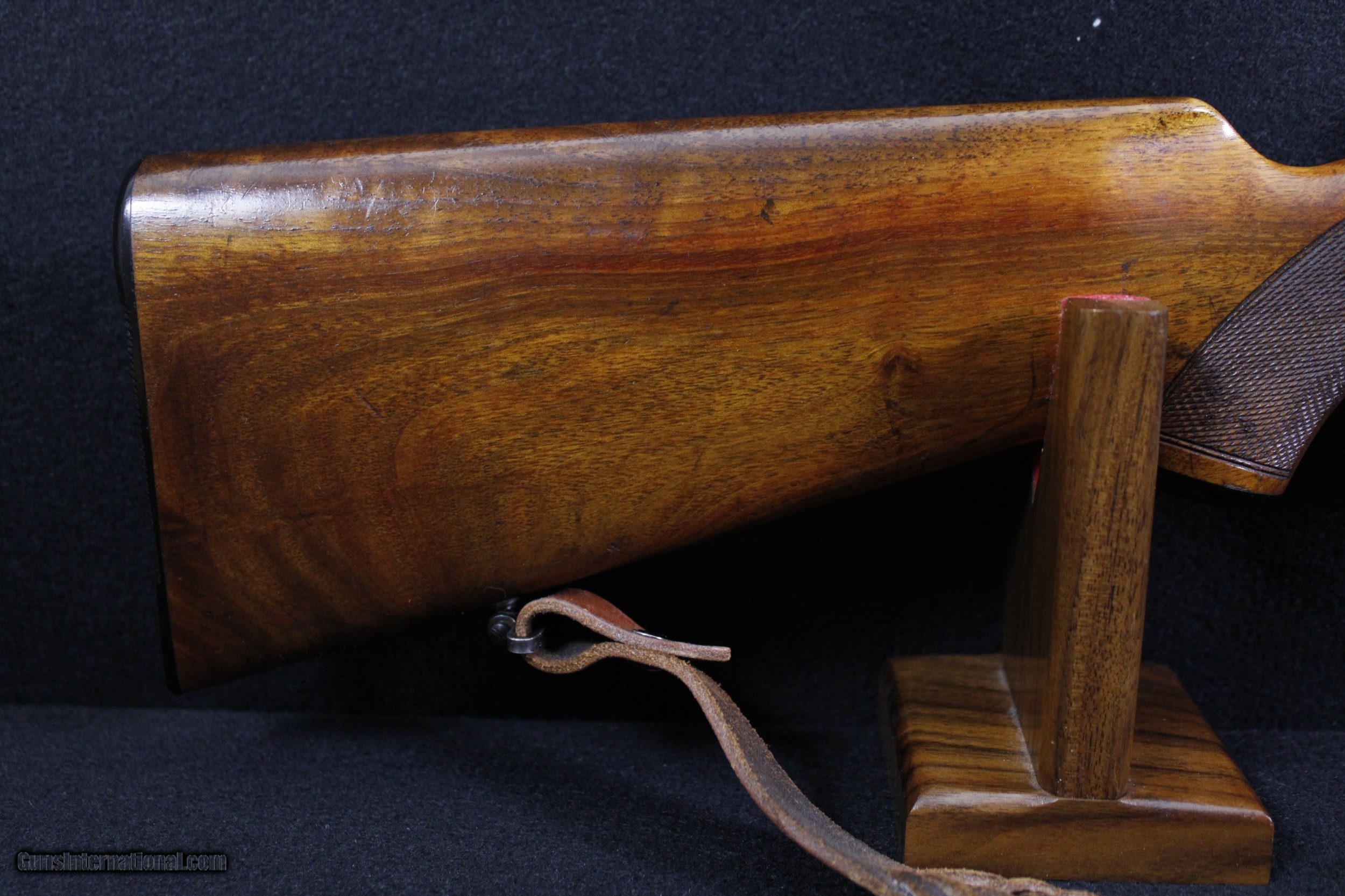 Description: Really nice Fabrique Nationale Model 98 Sporter chambered in 7x57mm Mauser. Rifle shows some minor wear to the finish, about 98% finish remains. The beautiful Monte Carlo stock has minor handling marks throughout and a ding on the cheekpiece. Checkering has remained crisp. Bore is bright and clear with well defined lands and grooves. Mechanically excellent. Dimensions are as follows; BBL. 24" WT. 7lb. 10oz. DIM. 13 3/4" L.O.P. SOLD |