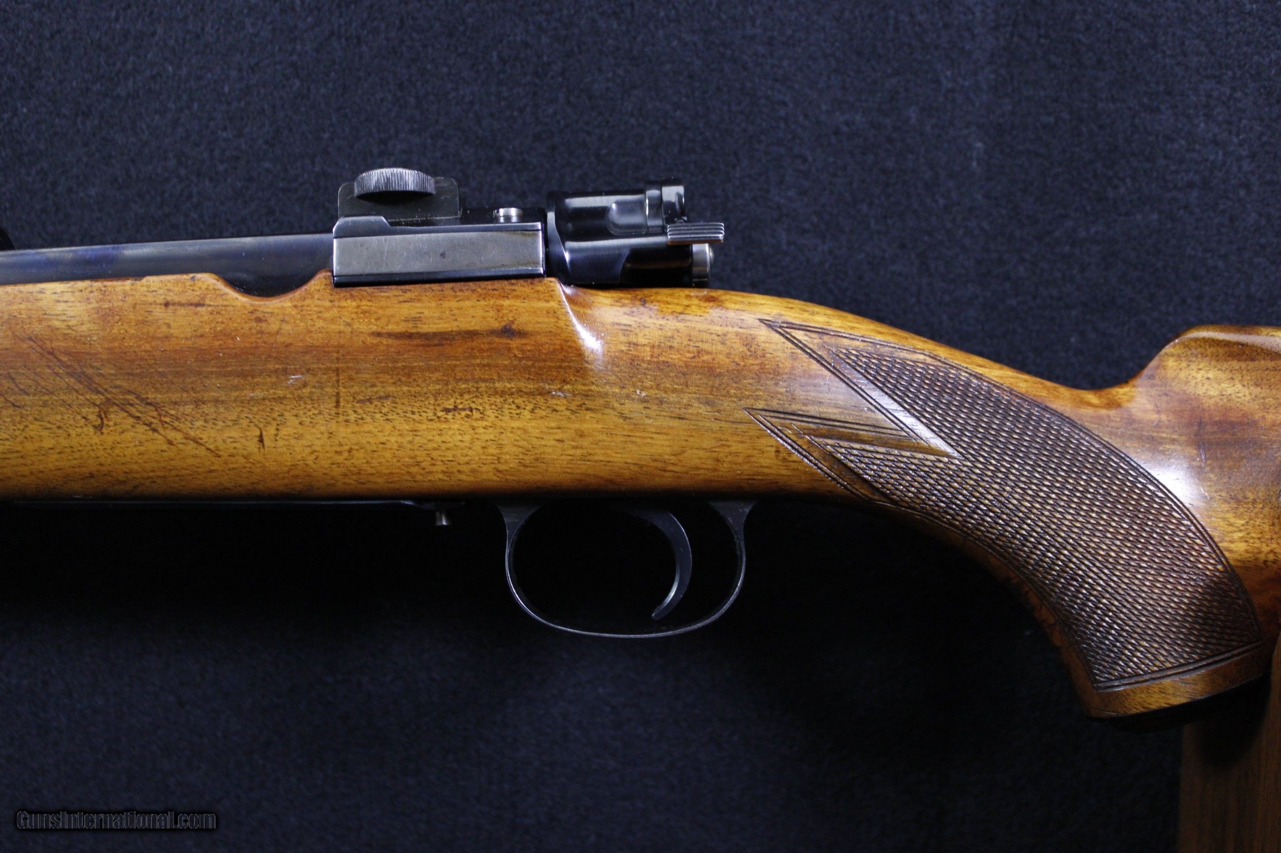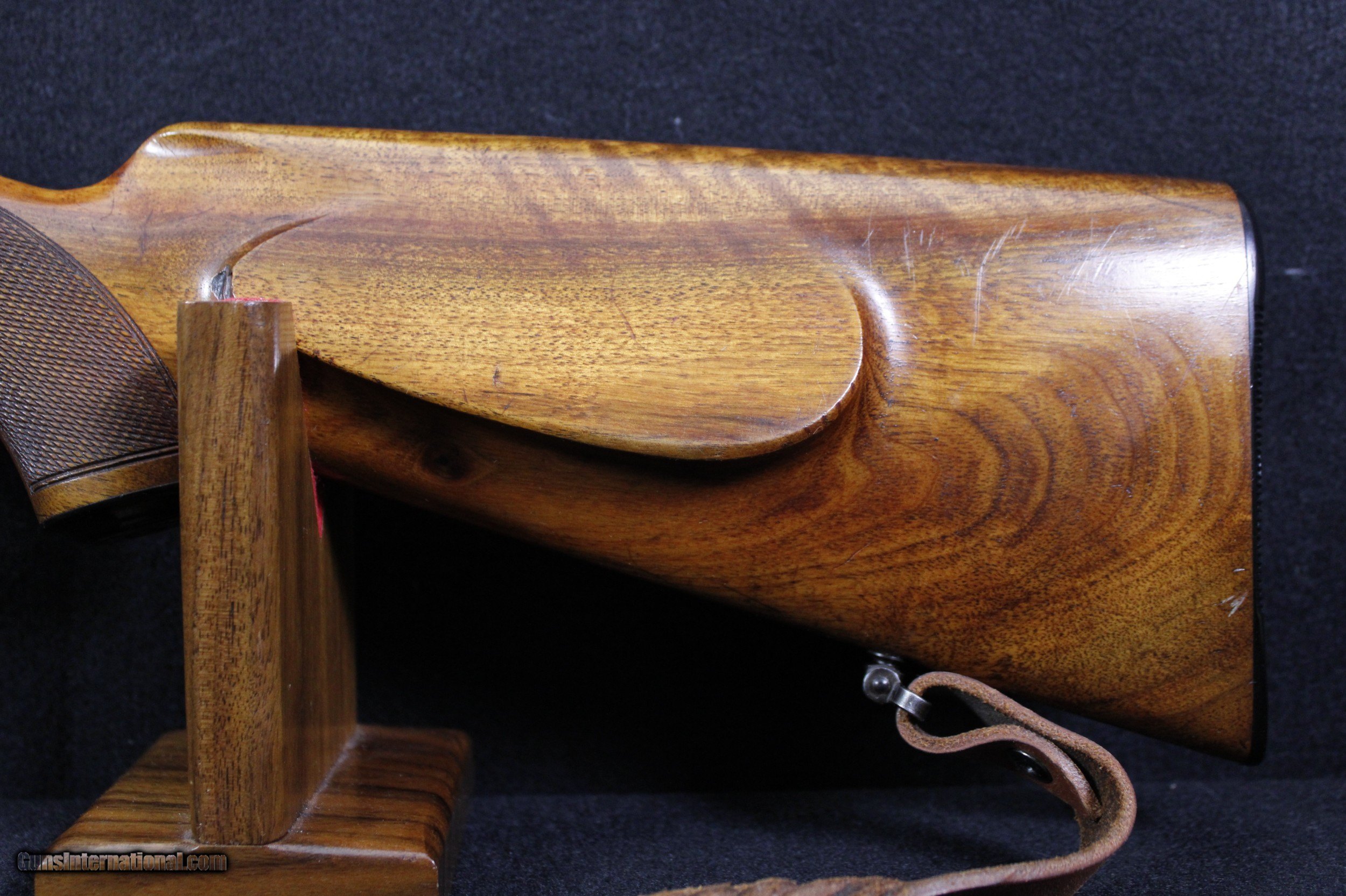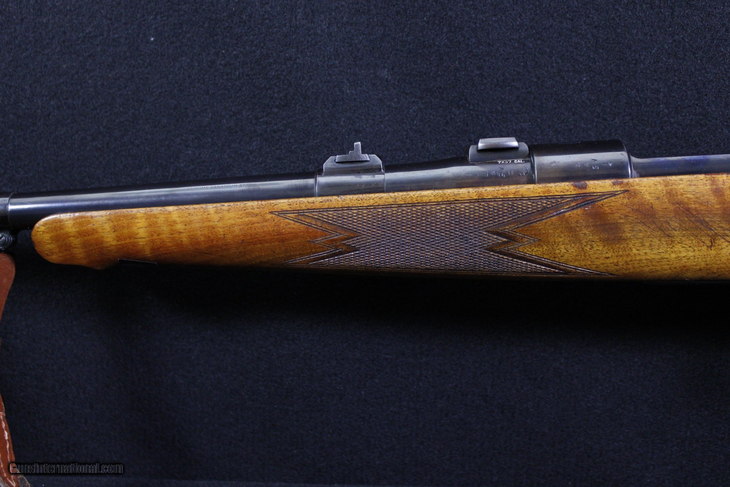 Description: Really nice Fabrique Nationale Model 98 Sporter chambered in 7x57mm Mauser. Rifle shows some minor wear to the finish, about 98% finish remains. The beautiful Monte Carlo stock has minor handling marks throughout and a ding on the cheekpiece. Checkering has remained crisp. Bore is bright and clear with well defined lands and grooves. Mechanically excellent. Dimensions are as follows; BBL. 24" WT. 7lb. 10oz. DIM. 13 3/4" L.O.P. SOLD |