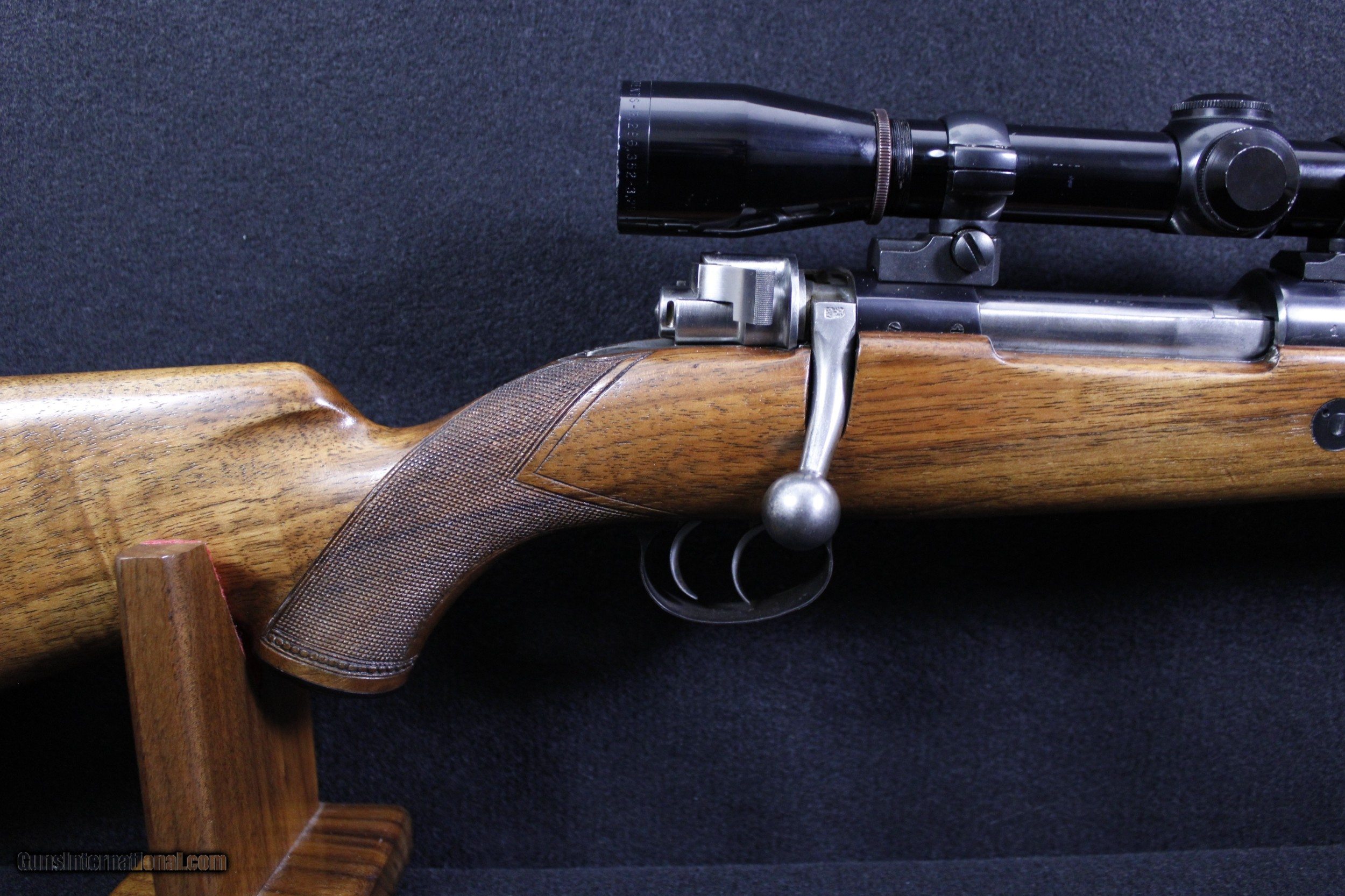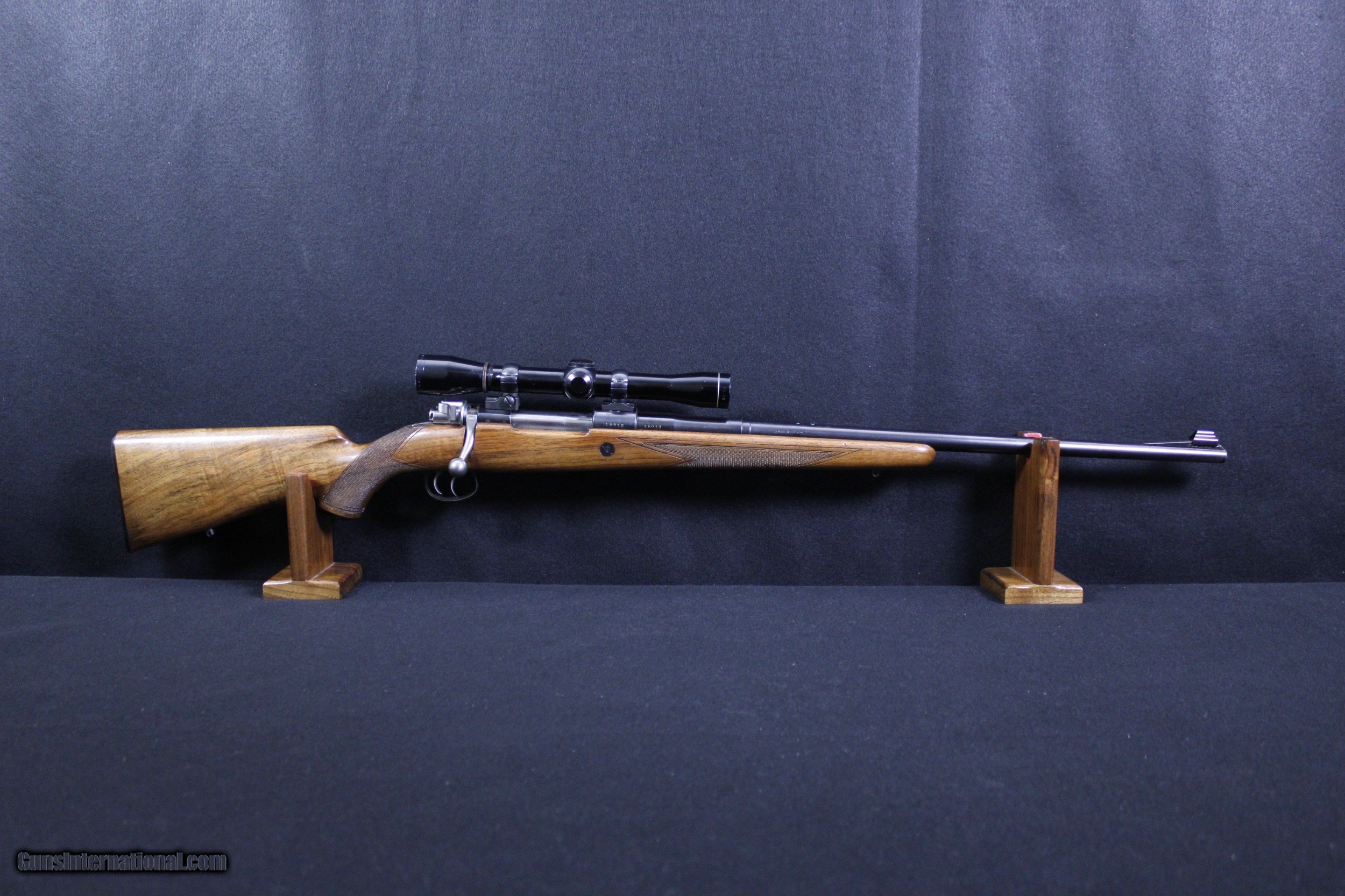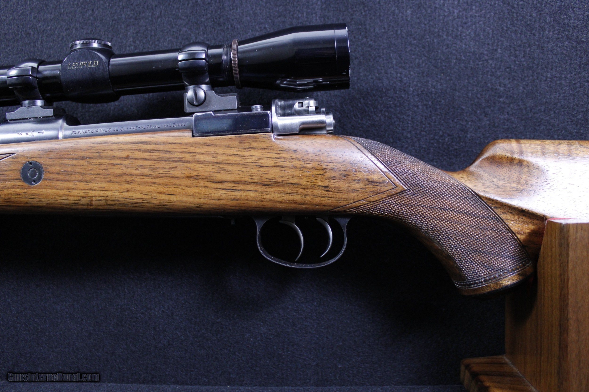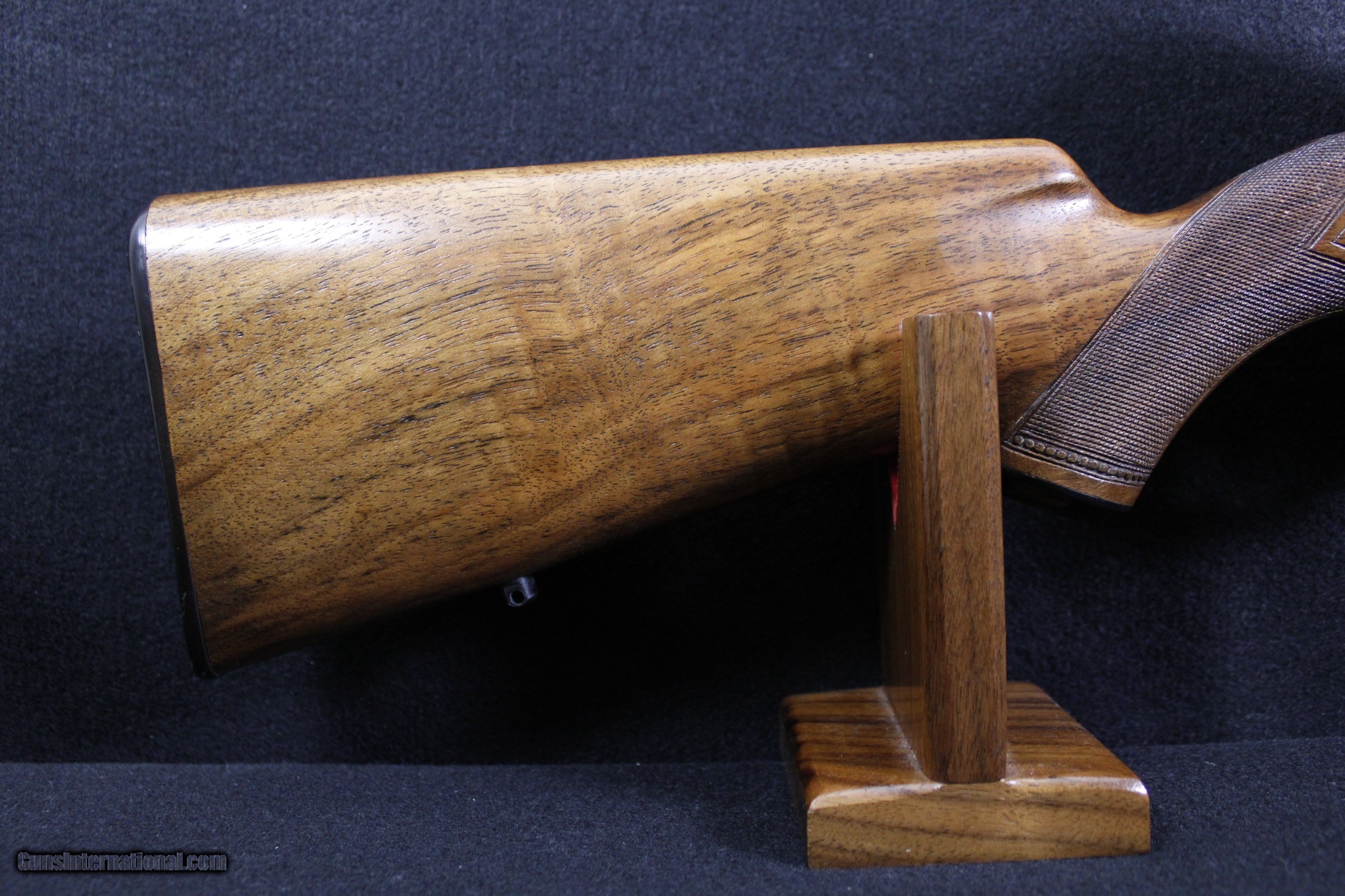 Description: Nice Fabrique Nationale Deluxe chambered in .270 Win. Rifle has a double set trigger, M70 safety and comes equipped with Leupold M8 4X rifle scope. Wood shows some minor handling marks throughout. Checkering has remained crisp. Some minor wear to the blued finish is to be expected. Bore is bright and clear with well defined lands and grooves. Mechanically excellent. Dimensions are as follows; BBL. 24" WT. 9lb. 1oz. DIM. 13 1/2" L.O.P. SOLD |