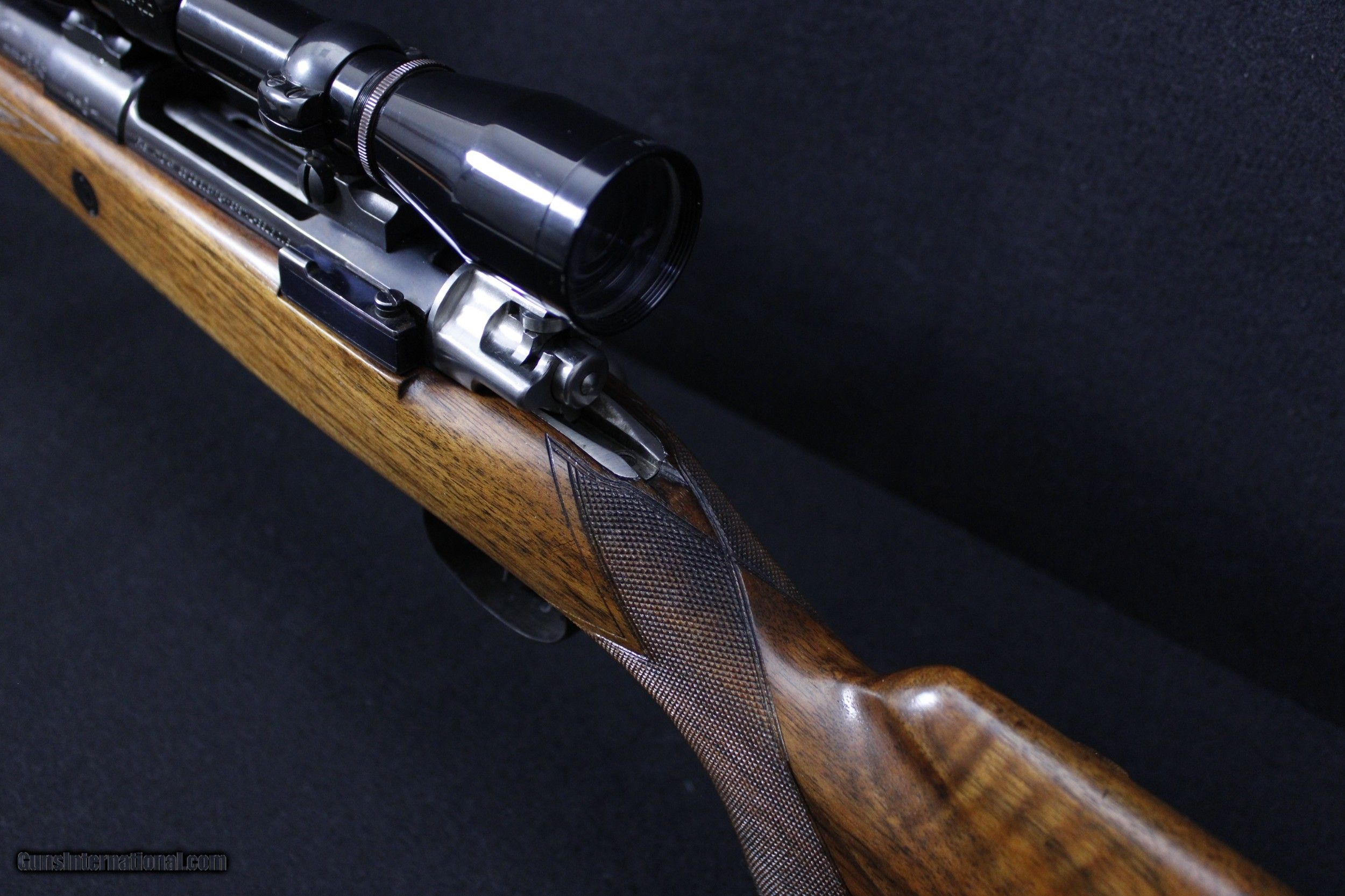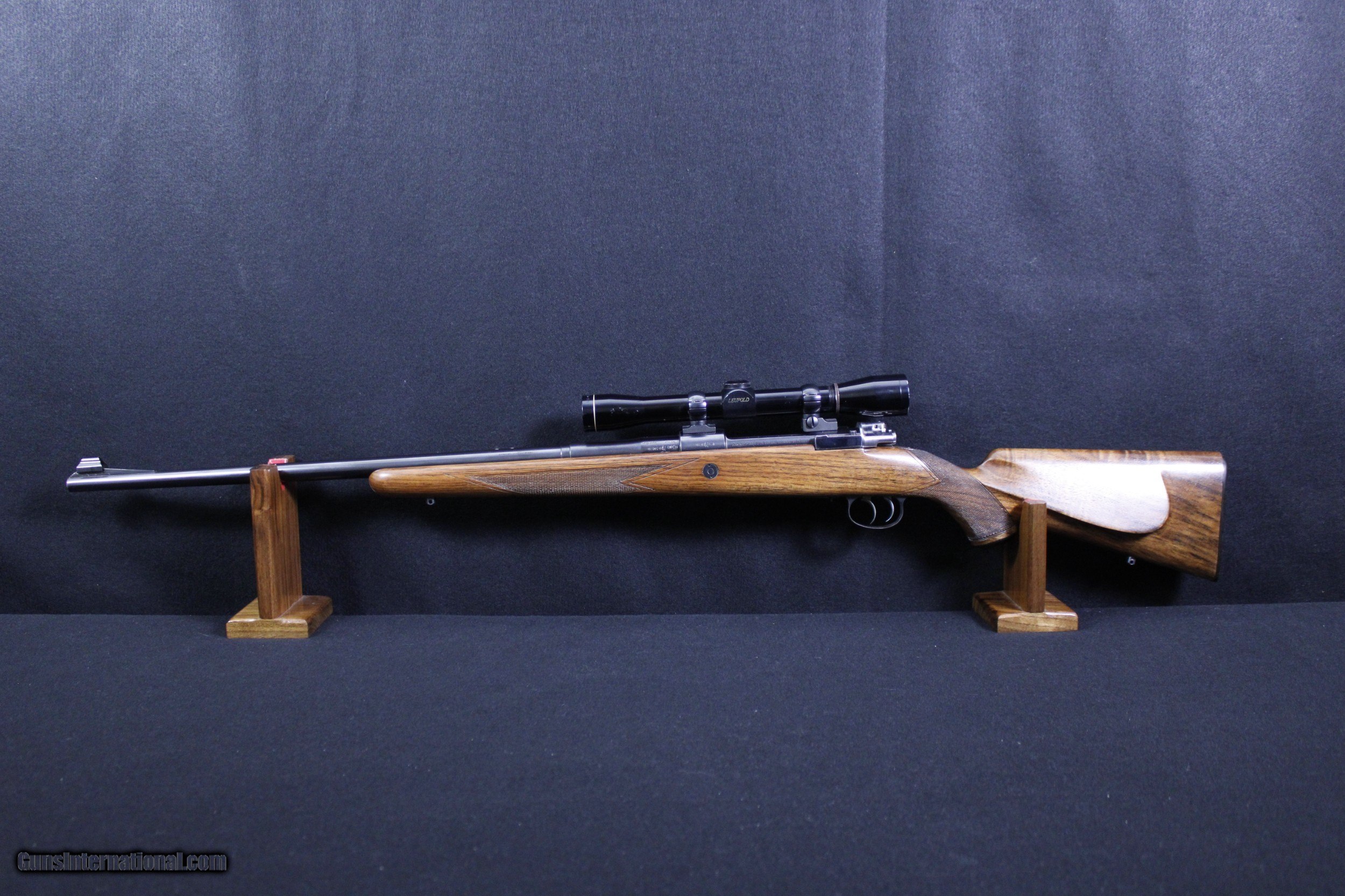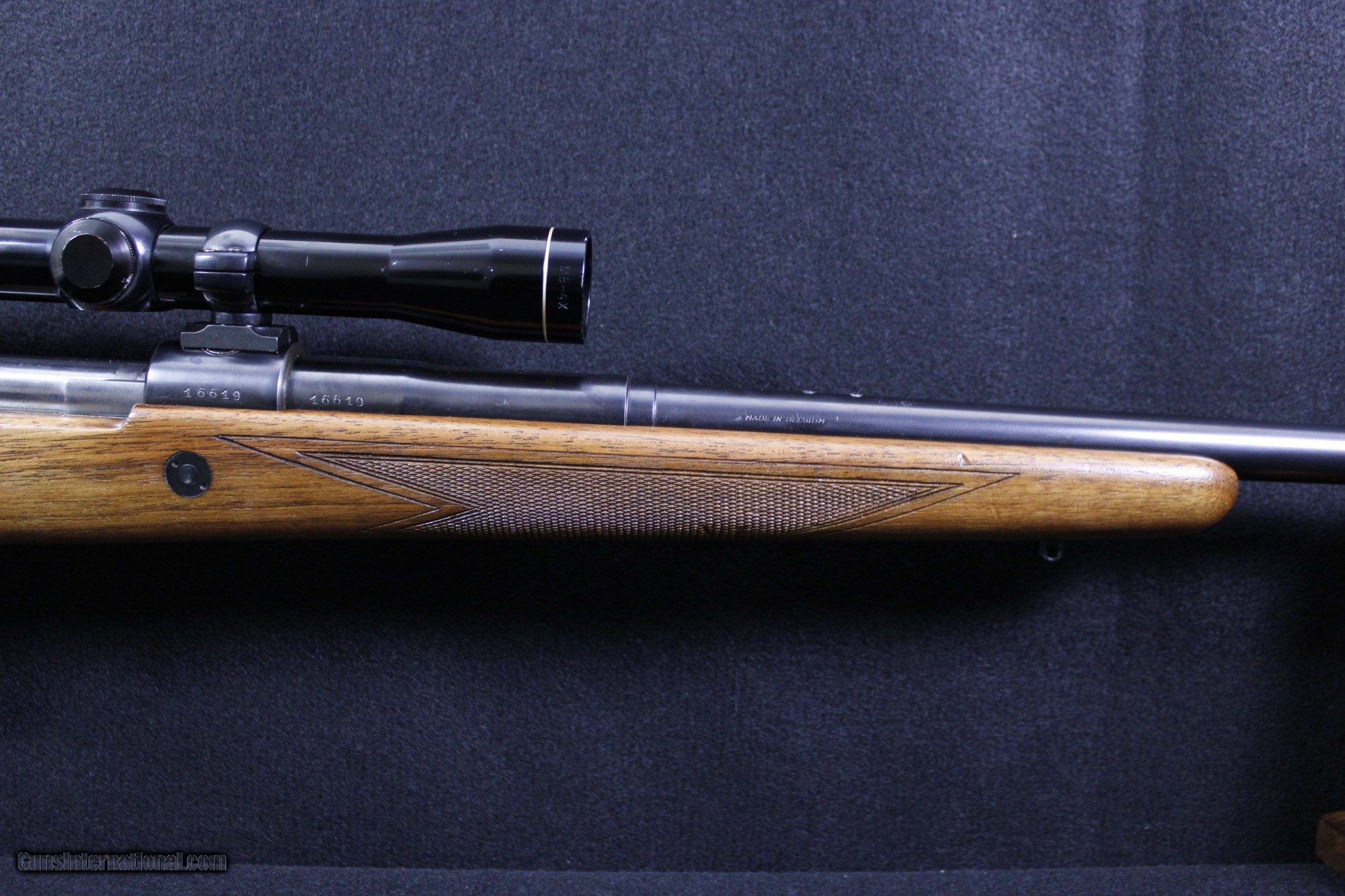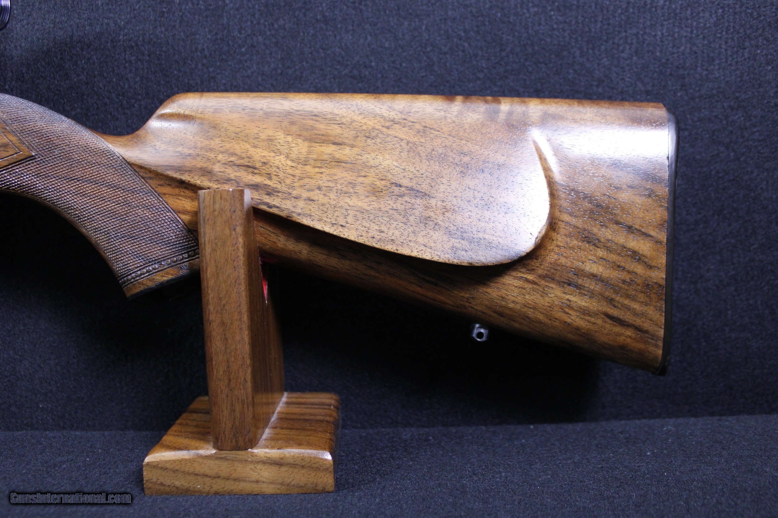 Description: Nice Fabrique Nationale Deluxe chambered in .270 Win. Rifle has a double set trigger, M70 safety and comes equipped with Leupold M8 4X rifle scope. Wood shows some minor handling marks throughout. Checkering has remained crisp. Some minor wear to the blued finish is to be expected. Bore is bright and clear with well defined lands and grooves. Mechanically excellent. Dimensions are as follows; BBL. 24" WT. 9lb. 1oz. DIM. 13 1/2" L.O.P. SOLD |