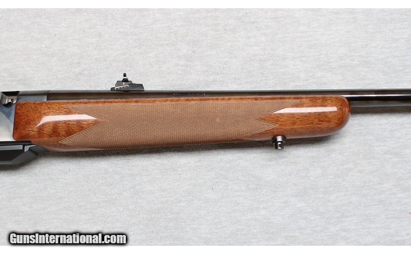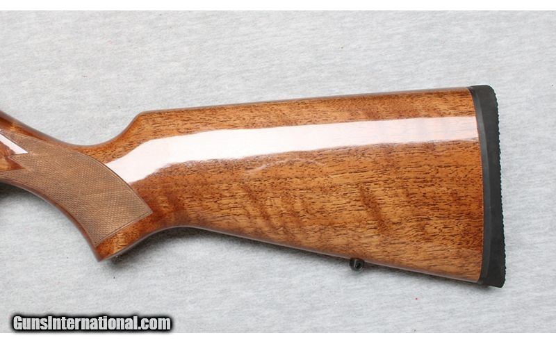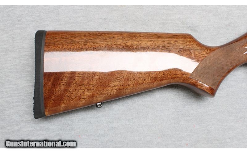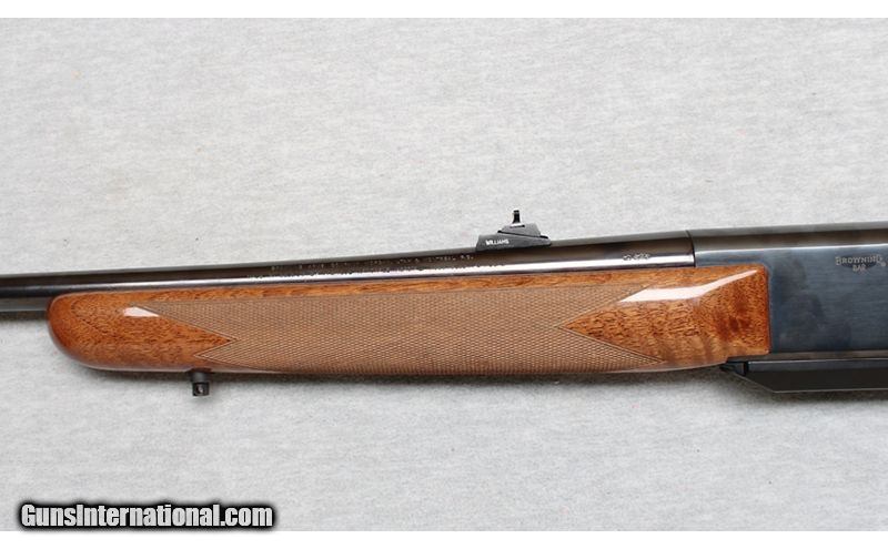 Description: FN Browning BAR High Power Rifle in .338 Winchester Magnum. This is a Semi-Automatic Belgium (assembled in Portugal) BAR (Browning Automatic Rifle). It has a 3 round box magazine clipped into the magazine floorplate. The front sight is a beaded blade dovetailed to a serrated, ramped base fixed to the front of the barrel. The rear sight is a U-notch that is adjustable for elevation and dovetailed to the barrel. The top of the receiver is drilled, tapped, and filled in four places for mounting an optic. The metal is excellent and is in near new condition. The stocks are two-piece checkered walnut with pistol grip, straight comb, basketweave textured black rubber Browning buttpad, and sling studs front and rear. The wood is in excellent condition with only very minor handling marks. The LOP measures 13 3/4". The bore is bright with sharp rifling. The rifle was made in 1990. .338 Winchester Magnum SOLD Metal Condition: Excellent Wood Condition: Excellent Bore Condition: The bore is bright with sharp rifling Barrels: 24 Inches Triggers: Factory Stock Dimensions: LOP 13 3/4 inches Fore End: Checkered walnut Butt Pad: Basketweave textured black rubber Browning buttpad Sights: "Beaded blade front, rear sight is a and adjustable U-notch, receiver drilled and tapped for optics. Item Location: La Vista, NE |