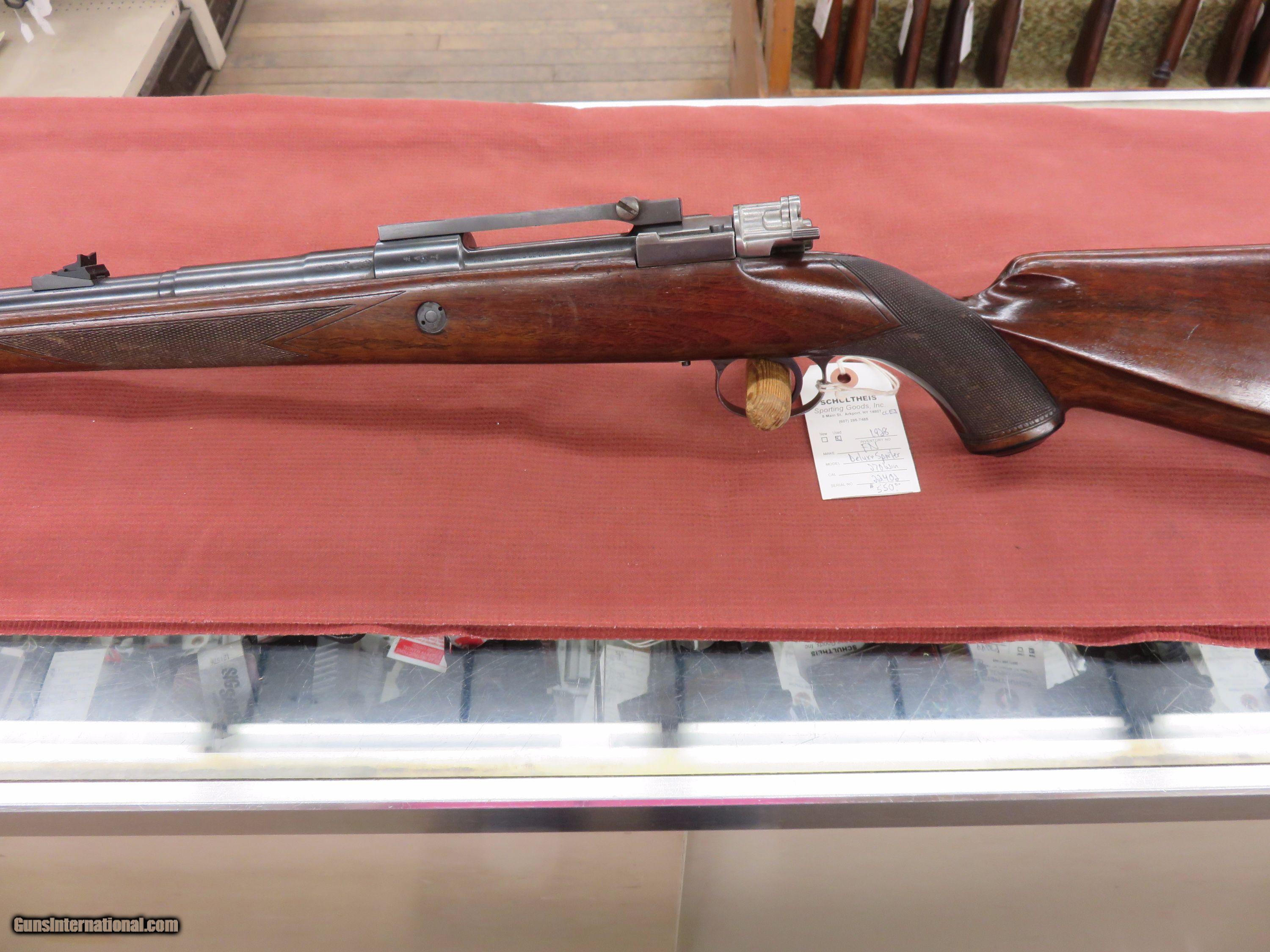 Description: FN Deluxe Sporter .270 Win. Leupold scope base. Original front sight. A barrel rear sight has been added. Excellent bore and wood. 95% barrel and receiver blue. Floor plate and trigger guard is 60% blue. SOLD |