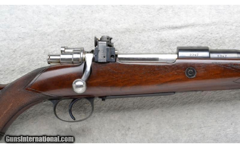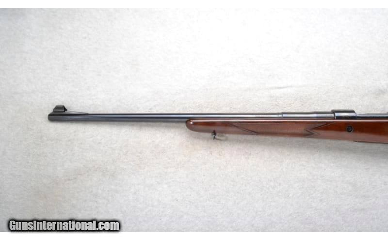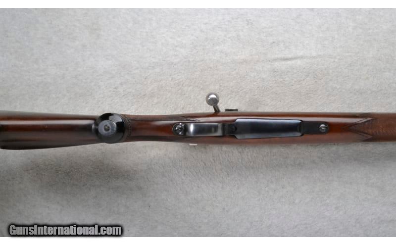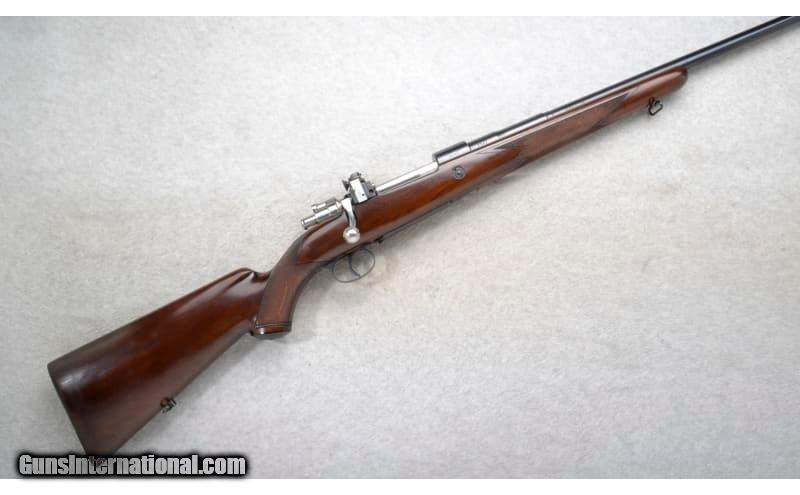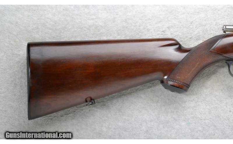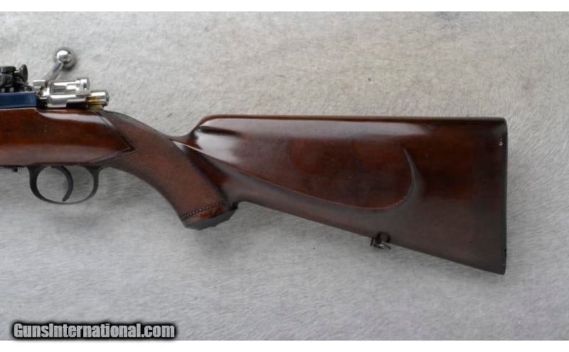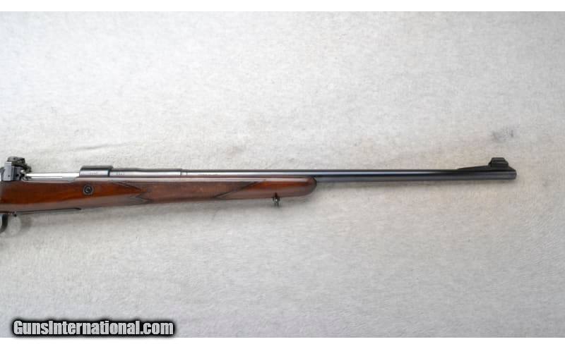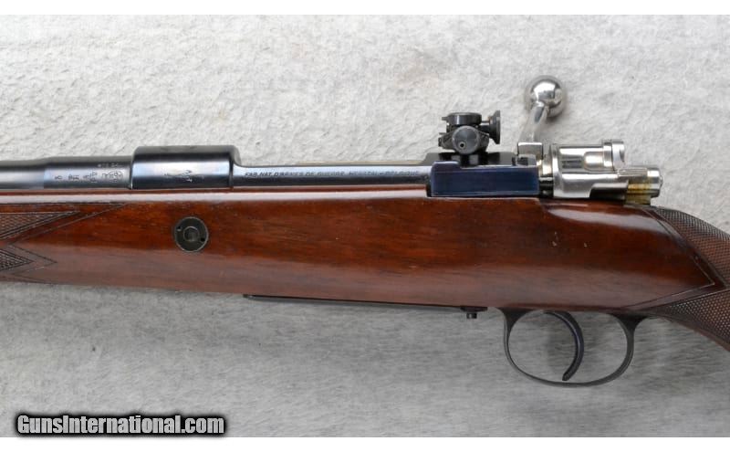 Description: This FN Model Mauser Sporter Deluxe is a right hand bolt action rifle in .270 Win. Cal. It has a 24 inch barrel. A hooded front blade sight and an adjustable aperture rear sight. The butt stock is a checkered grip walnut pistol grip with a raised cheekpiece and black cap. The forearm is a checkered grip walnut. S/N 2347 .270 Winchester SOLD Chambers: Internal Magazine. Metal Condition: Very Good. Wood Condition: Very Good. Some light handling marks. Bore Condition: Very Good. Barrels: 24 inch. Stock Dimensions: LOP 14 inches. Fore End: Checkered grip walnut. Butt Pad: FN grooved black plate. Weight: 8 lb. 2 oz. Sights: Hooded raised blade front sight. Adjustable aperture rear. Item Location: Richfield, WI |