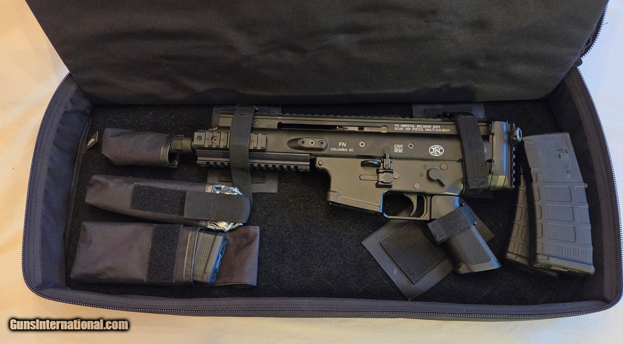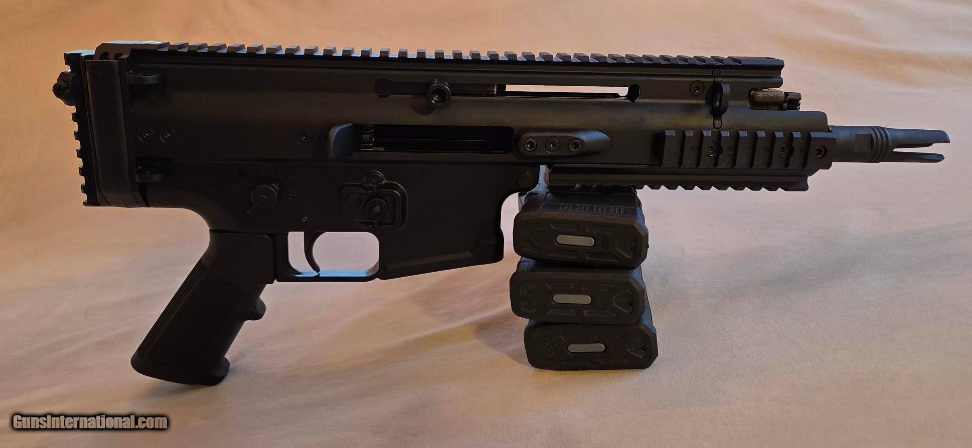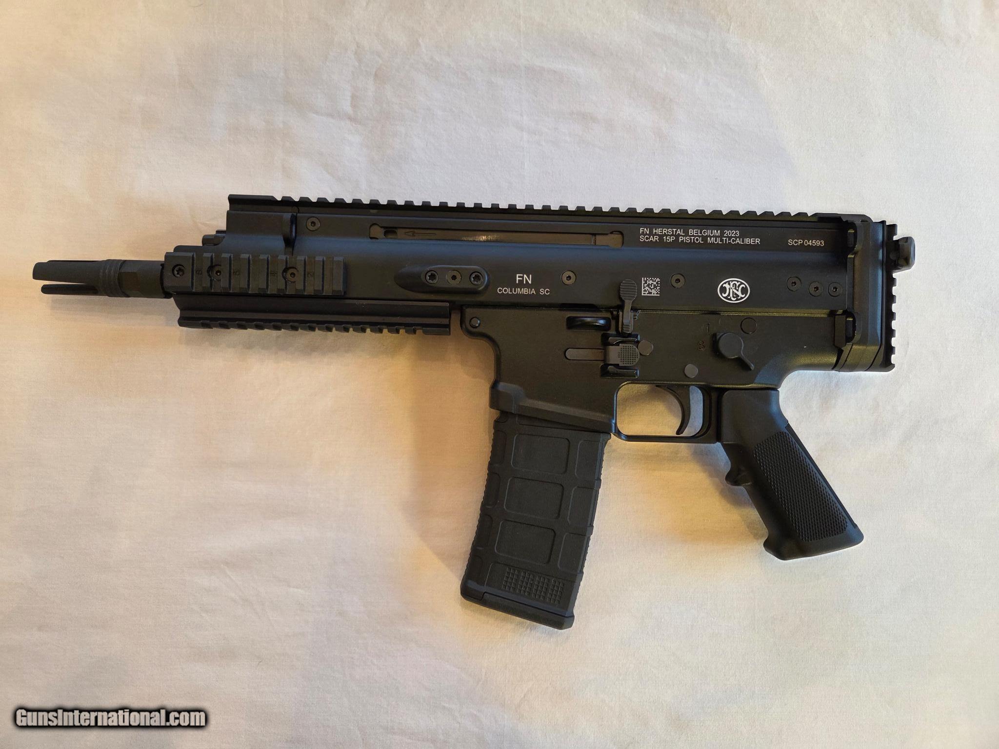 Description: New in Box - best price for this classic. MSRP is $3,699. The FN SCAR® 15P is the benchmark for reliability and versatility from a light recoiling, piston-driven platform, now configured in an ultra-compact pistol. This enduring platform enables all shooting positions, locking in any grip on the upper receiver under fire, a 7.5” barrel delivers unmatched maneuverability. PRIMARY FEATURES Non-reciprocating charging handle assembly enables all shooting positions and double as hand stops Premium, zippered case for discreet transport Short-stroke gas piston RECEIVER Hard-anodized monolithic aluminum MIL-STD-1913 accessory rails at 4 positions Vertical picatinny rail with sling QD cup BARREL 7.5” hammer-forged, chrome-lined, free-floating, with 3-prong flash hider OPERATING CONTROLS Dual, ambidextrous charging handles remain static under fire, user swappable left/right Ambidextrous safety lever and magazine release MAGAZINE (Three) 30 rd. steel body, low friction follower Rifle Caliber: 5.56x45mm NATO Handgun Caliber: 5.56x45mm NATO Manufacturer: FN Model: 15P Barrel Length: 7.5 Price: $2,990.00 Shipping: $65.00 Pay with